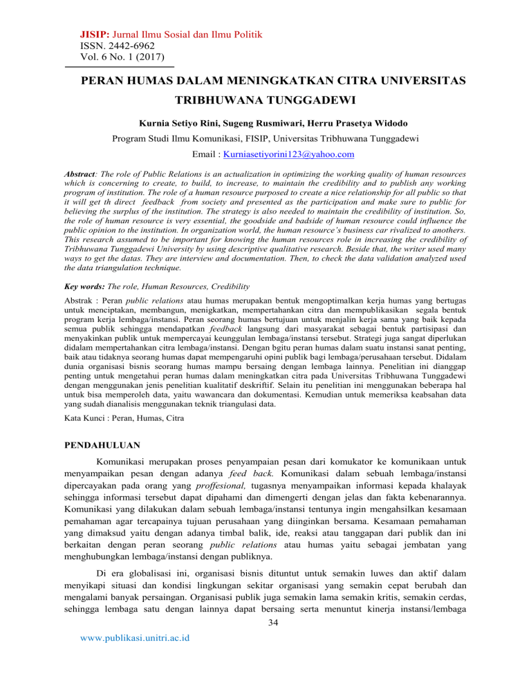 JISIP: Jurnal Ilmu Sosial dan Ilmu Politik ISSN. 2442-6962 Vol. 6 No. 1 (2017) PERAN HUMAS DALAM MENINGKATKAN CITRA UNIVERSITAS TRIBHUWANA TUNGGADEWI Kurnia Setiyo Rini, Sugeng Rusmiwari, Herru Prasetya Widodo Program Studi Ilmu Komunikasi, FISIP, Universitas Tribhuwana Tunggadewi Email : [email protected] Abstract: The role of Public Relations is an actualization in optimizing the working quality of human resources which is concerning to create, to build, to increase, to maintain the credibility and to publish any working program of institution. The role of a human resource purposed to create a nice relationship for all public so that it will get th direct feedback from society and presented as the participation and make sure to public for believing the surplus of the institution. The strategy is also needed to maintain the credibility of institution. So, the role of human resource is very essential, the goodside and badside of human resource could influence the public opinion to the institution. In organization world, the human resource’s business car rivalized to anothers. This research assumed to be important for knowing the human resources role in increasing the credibility of Tribhuwana Tunggadewi University by using descriptive qualitative research. Beside that, the writer used many ways to get the datas. They are interview and documentation. Then, to check the data validation analyzed used the data triangulation technique. Key words: The role, Human Resources, Credibility Abstrak : Peran public relations atau humas merupakan bentuk mengoptimalkan kerja humas yang bertugas untuk menciptakan, membangun, menigkatkan, mempertahankan citra dan mempublikasikan segala bentuk program kerja lembaga/instansi. Peran seorang humas bertujuan untuk menjalin kerja sama yang baik kepada semua publik sehingga mendapatkan feedback langsung dari masyarakat sebagai bentuk partisipasi dan menyakinkan publik untuk mempercayai keunggulan lembaga/instansi tersebut. Strategi juga sangat diperlukan didalam mempertahankan citra lembaga/instansi. Dengan bgitu peran humas dalam suatu instansi sanat penting, baik atau tidaknya seorang humas dapat mempengaruhi opini publik bagi lembaga/perusahaan tersebut. Didalam dunia organisasi bisnis seorang humas mampu bersaing dengan lembaga lainnya. Penelitian ini dianggap penting untuk mengetahui peran humas dalam meningkatkan citra pada Universitas Tribhuwana Tunggadewi dengan menggunakan jenis penelitian kualitatif deskriftif. Selain itu penelitian ini menggunakan beberapa hal untuk bisa memperoleh data, yaitu wawancara dan dokumentasi. Kemudian untuk memeriksa keabsahan data yang sudah dianalisis menggunakan teknik triangulasi data. Kata Kunci : Peran, Humas, Citra PENDAHULUAN Komunikasi merupakan proses penyampaian pesan dari komukator ke komunikaan untuk menyampaikan pesan dengan adanya feed back. Komunikasi dalam sebuah lembaga/instansi dipercayakan pada orang yang proffesional, tugasnya menyampaikan informasi kepada khalayak sehingga informasi tersebut dapat dipahami dan dimengerti dengan jelas dan fakta kebenarannya. Komunikasi yang dilakukan dalam sebuah lembaga/instansi tentunya ingin mengahsilkan kesamaan pemahaman agar tercapainya tujuan perusahaan yang diinginkan bersama. Kesamaan pemahaman yang dimaksud yaitu dengan adanya timbal balik, ide, reaksi atau tanggapan dari publik dan ini berkaitan dengan peran seorang public relations atau humas yaitu sebagai jembatan yang menghubungkan lembaga/instansi dengan publiknya. Di era globalisasi ini, organisasi bisnis dituntut untuk semakin luwes dan aktif dalam menyikapi situasi dan kondisi lingkungan sekitar organisasi yang semakin cepat berubah dan mengalami banyak persaingan. Organisasi publik juga semakin lama semakin kritis, semakin cerdas, sehingga lembaga satu dengan lainnya dapat bersaing serta menuntut kinerja instansi/lembaga 34 www.publikasi.unitri.ac.id JISIP: Jurnal Ilmu Sosial dan Ilmu Politik ISSN. 2442-6962 Vol. 6 No. 1 (2017) menjadi semakin profesional. Dalam kodisi semacam ini, organisasi juga diharapkan dapat peka dalam isu yang berbagai macam gejolak yang ada dimasyarakat dengan begitu humas cepat tanggap dalam penanganan, dengan begitu bisa bertahan menghadapi persaingan dan perubahan yang terus menerus terjadi disekitar organisasi. Oleh karena itu, dalam hal ini peran humas atau public relations (PR) sangat dibutuhkan, humas menjadi ujung tombak atau garda terdepan dalam lembaga untuk mengelola citra yang baik serta menciptakan iklim yang kondusif dan hubungan harmonis. Sesuai dengan peran public relations menurut Cultip, Center dan Broom (2006:6) Peran humas yang artinya berfungsi sebagai manajemen yang membangun, mempertahankan dan meningkatkan hubungan yang baik, harmonis dan bermanfaat antara organisasi dengan publik yang dapat mempengaruhi gagal atau suksesnya suatu organisasi tersebut dimata publik. Hal ini sejalan dengan fungsi humas, yaitu fungsi konstruktif. Oleh karena itu dengan adanya humas dapat mempengaruhi gagal atau suksesnya suatu organisasi. Peran humas sangat di butuhkan di dalam dunia pendidikan, Universitas Tribhuwana Tunggadewi dengan begitu humas mampu melakukan kerja sama dengan media serta stake holder lainnya, Pemerintah mampun swasta, diantaranya menyediakan beasiswa prestasi di Universitas Tribhuwana Tunggadewi. Dengan berjalannya waktu humas mampu menyakinkan banyak pihak untuk bekerja sama dengan baik. Pada tahun 2006 Unitri berhasil mendapatkan 4 respon dari 89 pemda berdasarkan surat kerjasama yang sebelumnya telah dikirim salah satunya pemda dari Sambas Kalimantan Barat. Dengan berjalannya waktu hingga tahun 2016 Unitri berhasil mendapatkan kerjasama dengan 17 seluruh Indonesia diantaranya pemda-pemda yang mengalami musibah bencana alam diantaranya yaitu Aceh, Bangka Belitung. Unitri pun mengalami peningkatan dalam bidang kegiatan prestasi mahasiswa. Pada tahun 2016 Unitri mampu mendapatkan peringkat ke 23 dari 198 PTN/PTS se Malang Raya bahkan peringkat ke 