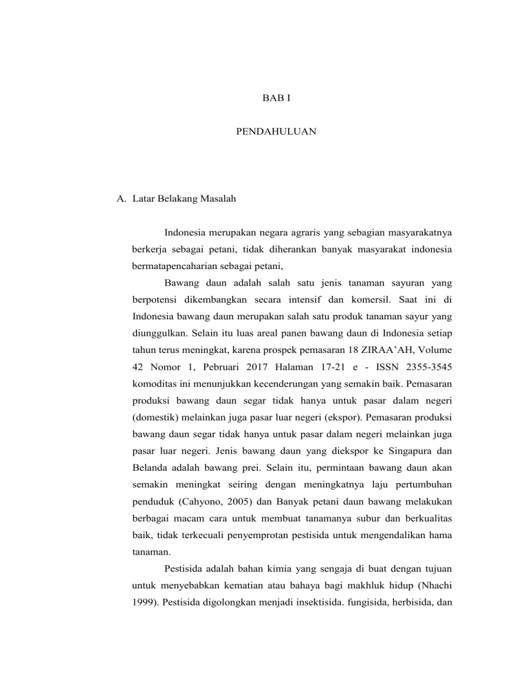 BAB I PENDAHULUAN A. Latar Belakang Masalah Indonesia merupakan negara agraris yang sebagian masyarakatnya berkerja sebagai petani, tidak diherankan banyak masyarakat indonesia bermatapencaharian sebagai petani, Bawang daun adalah salah satu jenis tanaman sayuran yang berpotensi dikembangkan secara intensif dan komersil. Saat ini di Indonesia bawang daun merupakan salah satu produk tanaman sayur yang diunggulkan. Selain itu luas areal panen bawang daun di Indonesia setiap tahun terus meningkat, karena prospek pemasaran 18 ZIRAA’AH, Volume 42 Nomor 1, Pebruari 2017 Halaman 17-21 e - ISSN 2355-3545 komoditas ini menunjukkan kecenderungan yang semakin baik. Pemasaran produksi bawang daun segar tidak hanya untuk pasar dalam negeri (domestik) melainkan juga pasar luar negeri (ekspor). Pemasaran produksi bawang daun segar tidak hanya untuk pasar dalam negeri melainkan juga pasar luar negeri. Jenis bawang daun yang diekspor ke Singapura dan Belanda adalah bawang prei. Selain itu, permintaan bawang daun akan semakin meningkat seiring dengan meningkatnya laju pertumbuhan penduduk (Cahyono, 2005) dan Banyak petani daun bawang melakukan berbagai macam cara untuk membuat tanamanya subur dan berkualitas baik, tidak terkecuali penyemprotan pestisida untuk mengendalikan hama tanaman. Pestisida adalah bahan kimia yang sengaja di buat dengan tujuan untuk menyebabkan kematian atau bahaya bagi makhluk hidup (Nhachi 1999). Pestisida digolongkan menjadi insektisida. fungisida, herbisida, dan nematisida yang secara berturut-turut digunakan untuk mengendalikan serangga. Dari semua golongan tersebut. Golongan insektisida yang mempunyai dampak ekonomi dan ekologi paling tinggi (McLauglin 1999) Berdasarkan bahan aktif penyusunya. pcstisida umumnya digolongkan menjadi beberapa golongan yaitu hidrokarbon berklor, organofosfat. karbonat. Piretroid sintetis, dan garam-garam turunan dan triazin dan tiocarbonat (WHO 1997). Semua pestisida kimia berhubungan erat dengan risiko kesehatan manusia dan makhluk hidup lain, karena pada tingkat seluler semua organisme mempunyai kesamaan sistem antara satu dengan yang lain (Wilkinson l988). Tingkat resiko sangat tergantung pada intensitas dan lamanva paparan pestisida terhadap makluk hidup yang bersangkutan, dan dipengaruhi oleh kondisi lingkungan dan tubuh seseorang yang terpapar (Manahan 1983). Hati merupakan salah satu organ target pestisida. Akumulasi paparan pestisida yang masuk ke dalam hati tidak dapat diuraikan serta dieksresikan dan tersimpan dalam hati akan menyebabkan gangguan sel atau organel hati. Hal ini mengakibatkan kerusakan pada parenkim hati atau gangguan permeabilitas membran sel hati sehingga enzim bebas keluar sel. Sebagai respon terhadap kerusakan pada hati maka konsentrasi enzim dalam darah akan meningkat (Tsani RA dkk 2013). Golongan organofosfat merupakan jumlah pestisida terbesar yang beredar di pasar dan banyak digunakan dalam bidang pertanian. karena tidak menyebabkan resistensi pada serangga. Dengan takaran yang rendah sudah memberikan efek yang memuaskan, selain kerjanya cepat dan mudah terurai. Keracunan organofosfat dapat terjadi melalui mulut, inhalasi, dan kulit (Achmadi, 2008 dan Sartono, 2002). Beberapa penelitian tentang residu pestisida pada sayuran didapatkan residu insektisida golongan organofosfat dengan kandungan profenofos pada beberapa sayuran yaitu sekitar 0,024 – 0,565 ppm. Sedangkan berdasarkan batas maksimum residu (BMR) untuk pestisida profenofos yaitu sebesar 0,1 mg/kg (Afriyanto, 2008) Validasi metode analisis merupakan suatu tindakan penilaian terhadap parameter tertentu berdasarkan percobaan laboratorium, untuk membuktikan bahwa parameter tersebut memenuhi persyaratan untuk penggunaannya (Harmita, 2004). Dengan menggunakan sampel yang telah diketahui (atau setidaknya telah dihitung sebelumnya) nilai parameter suatu produk validasi dapat memberikan informasi yang berguna mengenai akurasi, presisi, linearitas, dan karakteristik lainnya dari kinerja suatu metode yang sehari-hari digunakan pada sampel yang tidak diketahui. Sebagai tambahan, Validasi dapat digunakan untuk mengidentifikasi sumber variabilitas yang tidak diinginkan. (Torbeck L.D, 2007). Validasi ulang perlu dilakukan meskipun validasi sebelumnya menghasilkan data yang sesuai dengan kriteria penerimaan, karena metode yang dinyatakan valid pada kondisi tertentu belum tentu valid pada kondisi lain karena peralatan dan pereaksi yang digunakan, analisis yang mengerjakan dan sebagainya. Parameter validasi yang ditetapkan pada penelitian ini antara lain: Limit of detection (LOD), Limit of Quantitation (LOQ), linearitas, Presisi, dan akurasi. Menurut Mulja dan suharman (1995), penetapan kadar dapat dilakukan secara analisis spektrofotometri UV-Vis. instrumen menggunakan metode B. Rumusan Masalah Berdasarkan uraian latar belakang diatas, maka dibuat rumusan masalah sebagai berikut 1. Apakah terjadi penurunan kadar residu pestisida profenofos pada tanaman daun bawang yang di semprot pestisida organofosfat ? 2. Apakah Metode Spektrofotometri uv-vis dapat digunakan untuk memenuhi validasi untuk penetapan kadar residu profenofos dalam daun bawang ? C. Tujuan Penelitian 1. Penentuan kadar pestisdia profenofos pada daun bawang. 2. Untuk mengetahui metode penentuan kadar pestisida profenofos dari daun bawang memenuhi kriteria validasi metode analisis (Limit Of Detektion, Limit Of Quantitation, Linearitas, Presisi, Akurasi) secara spektrofotometri uv-vis. D. Manfaat Penelitian 1. Sebagai sumber informasi tentang validasi metode analisis dari daun bawang dengan metode spektrofotometri uv-vis 2. Penentuan kadar pestisida profenofos dalam daun bawang yang dapat memberi pengetauhan tentang kadar pestisida profenofos kepada konsumen 3. Membuktikan ada atau tidaknya residu pestisida profenofos pada tanaman daun bawang yang telah terpapar oleh pestisida jenis organofosfat