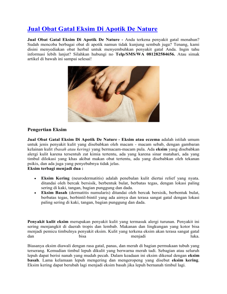 Jual Obat Gatal Eksim Di Apotik De Nature Jual Obat Gatal Eksim Di Apotik De Nature - Anda terkena penyakit gatal menahun? Sudah mencoba berbagai obat di apotik namun tidak kunjung sembuh juga? Tenang, kami disini menyediakan obat herbal untuk menyembuhkan penyakit gatal Anda. Ingin tahu informasi lebih lanjut? Silahkan hubungi no Telp/SMS/WA 081282584656. Atau simak artikel di bawah ini sampai selesai! Pengertian Eksim Jual Obat Gatal Eksim Di Apotik De Nature - Eksim atau eczema adalah istilah umum untuk jenis penyakit kulit yang disebabkan oleh macam - macam sebab, dengan gambaran kelainan kulit (basah atau kering) yang bermacam-macam pula. Ada eksim yang disebabkan alergi kulit karena tersentuh zat kimia tertentu, ada yang karena sinar matahari, ada yang timbul dilokasi yang khas akibat makan obat tertentu, ada yang disebabkan oleh tekanan psikis, dan ada juga yang penyebabnya tidak jelas. Eksim terbagi menjadi dua : Eksim Kering (neurodermatitis) adalah penebalan kulit diertai relief yang nyata. ditandai oleh bercak bersisik, berbentuk bulat, berbatas tegas, dengan lokasi paling sering di kaki, tangan, bagian punggung dan dada. Eksim Basah (dermatitis numularis) ditandai oleh bercak bersisik, berbentuk bulat, berbatas tegas, berbintil-bintil yang ada airnya dan terasa sangat gatal dengan lokasi paling sering di kaki, tangan, bagian punggung dan dada. Penyakit kulit eksim merupakan penyakit kulit yang termasuk alergi turunan. Penyakit ini sering menjangkit di daerah tropis dan lembab. Makanan dan lingkungan yang kotor bisa menjadi pemicu timbulnya penyakit eksim. Kulit yang terkena eksim akan terasa sangat gatal dan bisa menjadi luka. Biasanya eksim diawali dengan rasa gatal, panas, dan merah di bagian permukaan tubuh yang terserang. Kemudian timbul lepuh dikulit yang berwarna merah tadi. Sebagian atau seluruh lepuh dapat berisi nanah yang mudah pecah. Dalam keadaan ini eksim dikenal dengan eksim basah. Lama kelamaan lepuh mengering dan mengeropeng yang disebut eksim kering. Eksim kering dapat berubah lagi menjadi eksim basah jika lepuh bernanah timbul lagi. Harga Rp 295.000 Informasi lebih lanjut hubungi Telp/SMS/WA 081282584656 Apa Saja Gejala Eksim? Jual Obat Gatal Eksim Di Apotik De Nature - Dimanapun lokasi timbulnya eksim, gejala utama yang dirasakan pasien adalah gatal. Terkadang rasa gatal sudah muncul sebelum ada tanda kemerahan pada kulit. Gejala kemerahan biasanya akan muncul pada wajah, lutut, tangan dan kaki, namun tidak menutup kemungkinan kemerahan muncul di daerah lain. Daerah yang terkena akan terasa sangat kering, menebal atau keropeng. Pada orang kulit putih, daerah ini pada mulanya akan berwarna merah muda lalu berubah menjadi cokelat. Sementara itu pada orang dengan kulit lebih gelap, eksim akan mempengaruhi pigmen kulit sehingga daerah eksim akan tampak lebih terang atau lebih gelap. Apa yang Menjadi Penyebab Eksim Jual Obat Gatal Eksim Di Apotik De Nature - Penyebab dari eksim sebenarnya belum diketahui dengan pasti, namun beberapa ahli mencurigai eksim berhubungan dengan aktifitas daya pertahanan tubuh (imun) yang berlebihan. Hal ini menyebabkan tubuh mengalami reaksi berlebihan terhadap bakteri atau iritan yang sebenarnya tidak berbahaya pada kulit. Oleh karena itu, eksim banyak ditemukan pada keluarga dengan riwayat penyakit alergi atau asma. Tiap tiap orang mempunyai pencetus eksim yang berbeda beda. Ada orang yang setelah memegang sabun atau deterjen akan merasakan gatal yang luar biasa, ada pula yang disebabkan oleh bahan atau alat rumah tangga yang lain. Gejala yang timbul pun bervariasi, ada yang gatalnya ringan tetapi rasa panas yang dominan, ada pula yang sebaliknya. Infeksi saluran nafas bagian atas atau flu juga bisa menjadi pencetus timbulnya eksim. Stress yang dialami penderita akan membuat gejala menjadi lebih buruk. Jenis – Jenis Penyakit Gatal Eksim : 1. Dermatitis atopik : salah satu jenis eksim yang paling sering dijumpai dan merupakan penyakit turunan. Dermatitis atopik umumnya dimulai ketika bayi dan masih anak- 2. 3. 4. 5. anak dengan gejala berupa gatal, radang kulit, dan pada sebagian penderita sering timbul asma dan demam hay (hay fever). Dermatitis kontak : meliputi dermatitis kontak alergik dan iritan. Dermatitis kontak alergik disebabkan oleh reaksi kekebalan tertunda (delayed immune system) akibat kontak kulit dengan senyawa alergenik sehingga menyebabkan radang kulit dalam 48 jam setelah paparan terjadi. Beberapa agen penyebab eksim jenis ini adalah jelatang, parfum, pengawet kosmetik, metal, dan pewarna. Dermatitis kontak iritan terjadi karena paparan senyawa iritan yang dapat merusak kulit secara kimiawi, contohnya sabun keras, detergen, dan produk pembersih lainnya. Senyawa iritan tersebut dapat menghilangkan minyak dan kelembaban dari lapisan luar kulit, kemudian merusak lapisan pelindung dan memicu terjadinya peradangan. Eksim numular : beberapa plak eksim yang biasanya berhubungan dengan kulit kering dan terjadi pada bagian luar dari kaki, tangan, dan lengan. Eksim stasis : jenis eksim kronis pada daerah bawah kaki bagian dalam yang berkaitan dengan varises. Pertanyaan yang sering terpikirkan di benak Anda : Jika Saya terlanjur kena penyakit eksim, bagaimana cara mengobatinya? Bagaimana cara mengobati penyakit eksim dengan cepat dan tuntas? Bagaimana berobat yang mudah tanpa perlu malu untuk ke dokter? Jawabannya: semua bisa, asal Anda memilih produk yang tepat, yaitu Eximtas, Kapsul BD De Nature dan Salep Exclear. Pengobatan Penyakit Eksim Jual Obat Gatal Eksim Di Apotik De Nature - Pengobatan Eksim secara tradisional yaitu dengan menggunakan Obat Eksim dari De Nature. Produk yang terbuat dari bahan herbal alami diramu dengan resep tradisional dan diolah secara teknologi modern, sehingga aman di konsumsi. Jadi anda juga tak perlu khawatir karena Obat Herbal De Nature yang kami tawarkan ini, Alhamdulillah, merupakan obat yang telah banyak menyembuhkan penderitanya baik dari dalam maupun luar negeri. Sudah banyak pasien kami