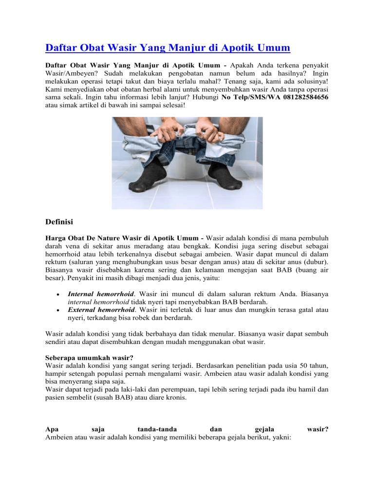 Daftar Obat Wasir Yang Manjur di Apotik Umum Daftar Obat Wasir Yang Manjur di Apotik Umum - Apakah Anda terkena penyakit Wasir/Ambeyen? Sudah melakukan pengobatan namun belum ada hasilnya? Ingin melakukan operasi tetapi takut dan biaya terlalu mahal? Tenang saja, kami ada solusinya! Kami menyediakan obat obatan herbal alami untuk menyembuhkan wasir Anda tanpa operasi sama sekali. Ingin tahu informasi lebih lanjut? Hubungi No Telp/SMS/WA 081282584656 atau simak artikel di bawah ini sampai selesai! Definisi Harga Obat De Nature Wasir di Apotik Umum - Wasir adalah kondisi di mana pembuluh darah vena di sekitar anus meradang atau bengkak. Kondisi juga sering disebut sebagai hemorrhoid atau lebih terkenalnya disebut sebagai ambeien. Wasir dapat muncul di dalam rektum (saluran yang menghubungkan usus besar dengan anus) atau di sekitar anus (dubur). Biasanya wasir disebabkan karena sering dan kelamaan mengejan saat BAB (buang air besar). Penyakit ini masih dibagi menjadi dua jenis, yaitu: Internal hemorrhoid. Wasir ini muncul di dalam saluran rektum Anda. Biasanya internal hemorrhoid tidak nyeri tapi menyebabkan BAB berdarah. External hemorrhoid. Wasir ini terletak di luar anus dan mungkin terasa gatal atau nyeri, terkadang bisa robek dan berdarah. Wasir adalah kondisi yang tidak berbahaya dan tidak menular. Biasanya wasir dapat sembuh sendiri atau dapat disembuhkan dengan mudah menggunakan obat wasir. Seberapa umumkah wasir? Wasir adalah kondisi yang sangat sering terjadi. Berdasarkan penelitian pada usia 50 tahun, hampir setengah populasi pernah mengalami wasir. Ambeien atau wasir adalah kondisi yang bisa menyerang siapa saja. Wasir dapat terjadi pada laki-laki dan perempuan, tapi lebih sering terjadi pada ibu hamil dan pasien sembelit (susah BAB) atau diare kronis. Apa saja tanda-tanda dan gejala Ambeien atau wasir adalah kondisi yang memiliki beberapa gejala berikut, yakni: wasir? BAB berdarah berwarna merah terang dan tidak nyeri Gatal dan iritasi pada area rektum Nyeri dan rasa tidak nyaman Bengkak di sekitar anus Benjolan yang sensitif atau nyeri di dekat anus Kondisi ambeien yang yang lebih sering menyebabkan rasa tidak nyaman dan nyeri yaitu external hemorrhoid. Internal hemorrhoid biasanya tidak menyebabkan rasa nyeri. Kemungkinan ada tanda-tanda dan gejala yang tidak disebutkan di atas. Bila Anda memiliki kekhawatiran akan sebuah gejala tertentu, konsultasikanlah dengan dokter Anda. Penyebab Penyebab wasir yaitu pembengkakan pembuluh darah vena. Pembengkakan bisa terjadi akibat meningkatnya tekanan di rektum bagian bawah. Faktor yang meningkatkan tekanan tersebut yaitu: Mengejan saat BAB Duduk terlalu lama Diare atau sembelit kronis Berat badan berlebih atau obesitas Hamil Kurang asupan makanan berserat Faktor-faktor risiko Wasir disebabkan oleh bengkaknya pembuluh darah vena akibat peningkatan tekanan di rektum bagian bawah. Faktor-faktor yang bisa menjadi penyebab wasir antara lain: 1. Sembelit kronis. Feses yang mengeras akibat sembelit membuat Anda harus mengeluarkan tenaga lebih banyak untuk mengejan. Tekanan ekstra tersebut akhirnya bisa memicu pembengkakan pembuluh darah di anus, menjadi penyebab wasir. 2. Kehamilan. Seiring usia kehamilan yang semakin membesar, rahim akan ikut berkembang mengikuti perkembangan janin. Tekanan rahim ini kemudian akan menekan pembuluh darah yang ada di usus besar hingga memicu munculnya benjolan di daerah anus. 3. Duduk terlalu lama. Kebiasaan duduk yang terlalu lama bisa menjadi penyebab wasir, sebab pembuluh darah di sekitar anus akan banyak terisi darah. Aliran darah yang konstan tersebut akhirnya akan menekan dinding pembuluh darah hingga semakin membesar. 4. Mengangkat benda berat. Berulang kali mengangkat benda yang berat bisa jadi penyebab wasir karena adanya penumpukan tekanan di bagian rektum yang akan memengaruhi aliran darah dan membuat pembuluh darah menjadi bengkak. 5. Usia. Kondisi tubuh yang semakin menua secara alami menyebabkan jaringan pembuluh darah di sekitar rektum dan anus semakin melemah dan meregang, sehingga rentan membengkak. Inilah yang akhirnya jadi penyebab wasir. Untuk Konsultasi dan Pemesanan Obat Hubungi No Telp/SMS/WA 081282584656 Siapa saja yang berisiko kena wasir? Ada banyak faktor risiko untuk wasir, yaitu: Memiliki pekerjaan yang mengharuskan Anda duduk atau berdiri dalam waktu yang lama. Mengalami diare atau sembelit kronis. Anda mengalami obesitas. Ibu hamil. Sering melakukan seks anal, yakni penetrasi lewat anus. Konsumsi makanan tinggi lemak dan rendah serat. Tingkatan Stadium Wasir Atau Sakit Ambeien Pada Ibu Hamil Wasir stadium 1 : Wasir Jenis ini Biasanya tidak Sampai prolaps. Rasanya Cuma kadang Kurang Nyaman Saat Buang Air Besar. Ambeien stadium 2 : bagian anus sudah bisa diraba ada benjolan, namun biasanya belum ada pendarahan. kadang ada rasa panas dan gatal Wasir stadium 3 : benjolan pada anus sudah besar dan susah masuk lagi harus dibantu dengan jari Ambeien stadium 4 : benjolan vena sudah besar sekali dan sering pendarahan, Obat ambeien alami Pertanyaan yang sering terpikirkan di benak Anda : Jika Saya terlanjur kena wasir bagaimana cara mengobatinya? Bagaimana cara mengobati wasir dengan cepat dan tuntas? Bagaimana berobat yang mudah tanpa perlu malu untuk ke dokter dan tanpa operasi? Jawabannya: semua bisa, asal Anda memilih produk yang tepat, yaitu Ambejoss dan Salep Salwa De Nature. Harga Rp 275.000 Anda ingin sembuh dari wasir? Segera hubungi tlp/sms/whatsapp : 081282584656 Sekedar informasi untuk kenyamanan Konsumen, bahwa Produk dari perusahaan kami ini sudah memiliki: Ijin Resmi Perusahaan dari Kementerian Kesehatan Ijin BPOM, yang artinya sudah lulus uji stabilitas Produk Sertifikat Halal MUI, sehingga halal bisa dipertanggungjawabkan Apoteker yang sudah berpengalaman Sudah melewati Proses Sortir Bahan Baku, Guna Menjaga Mutu Produk Proses Produksi Sesuai Alur CPOTB (Cara Pembuatan Obat Tradisional Yang Baik Dan Benar) Cara Pemesanan Pembayaran terlebih dulu via transfer Bank, setelah 