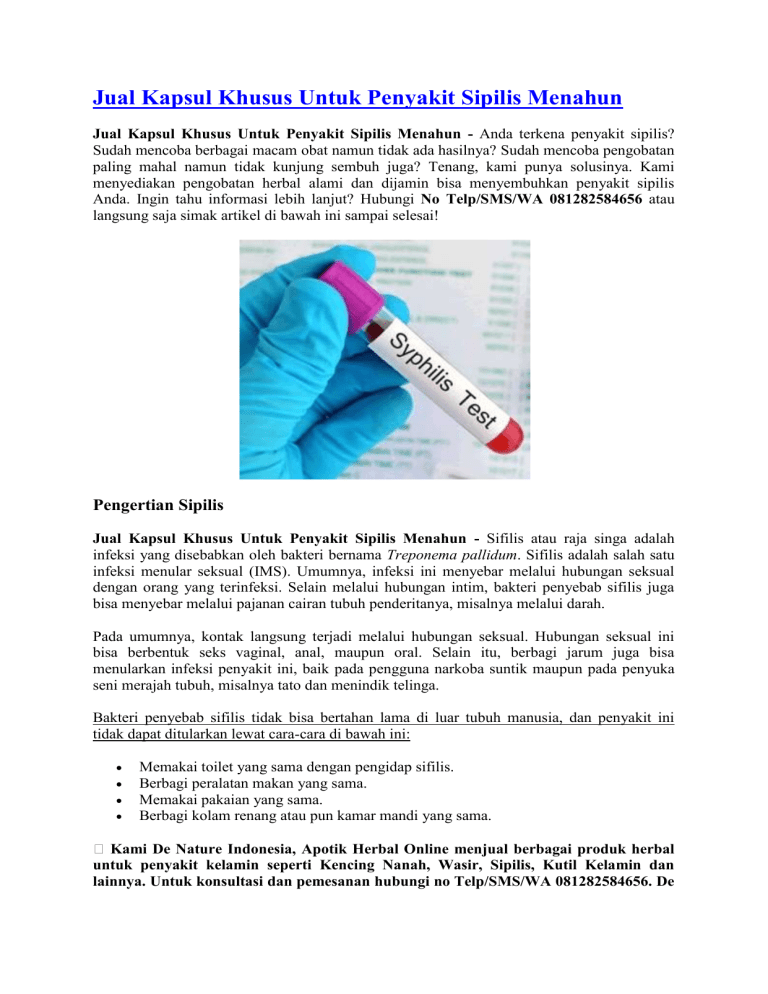 Jual Kapsul Khusus Untuk Penyakit Sipilis Menahun Jual Kapsul Khusus Untuk Penyakit Sipilis Menahun - Anda terkena penyakit sipilis? Sudah mencoba berbagai macam obat namun tidak ada hasilnya? Sudah mencoba pengobatan paling mahal namun tidak kunjung sembuh juga? Tenang, kami punya solusinya. Kami menyediakan pengobatan herbal alami dan dijamin bisa menyembuhkan penyakit sipilis Anda. Ingin tahu informasi lebih lanjut? Hubungi No Telp/SMS/WA 081282584656 atau langsung saja simak artikel di bawah ini sampai selesai! Pengertian Sipilis Jual Kapsul Khusus Untuk Penyakit Sipilis Menahun - Sifilis atau raja singa adalah infeksi yang disebabkan oleh bakteri bernama Treponema pallidum. Sifilis adalah salah satu infeksi menular seksual (IMS). Umumnya, infeksi ini menyebar melalui hubungan seksual dengan orang yang terinfeksi. Selain melalui hubungan intim, bakteri penyebab sifilis juga bisa menyebar melalui pajanan cairan tubuh penderitanya, misalnya melalui darah. Pada umumnya, kontak langsung terjadi melalui hubungan seksual. Hubungan seksual ini bisa berbentuk seks vaginal, anal, maupun oral. Selain itu, berbagi jarum juga bisa menularkan infeksi penyakit ini, baik pada pengguna narkoba suntik maupun pada penyuka seni merajah tubuh, misalnya tato dan menindik telinga. Bakteri penyebab sifilis tidak bisa bertahan lama di luar tubuh manusia, dan penyakit ini tidak dapat ditularkan lewat cara-cara di bawah ini: Memakai toilet yang sama dengan pengidap sifilis. Berbagi peralatan makan yang sama. Memakai pakaian yang sama. Berbagi kolam renang atau pun kamar mandi yang sama. � Kami De Nature Indonesia, Apotik Herbal Online menjual berbagai produk herbal untuk penyakit kelamin seperti Kencing Nanah, Wasir, Sipilis, Kutil Kelamin dan lainnya. Untuk konsultasi dan pemesanan hubungi no Telp/SMS/WA 081282584656. De Nature Indonesia beralamat di Perum Cendana Asri No.9 Majenang, Jl. Pahonjean Km.5 Majenang, Cilacap, Jawa Tengah � Tahapan Sipilis Gejala pertama sifilis muncul sekitar tiga minggu setelah bakteri memasuki tubuh. Infeksi sifilis terbagi menjadi empat tahapan utama, antara lain: � Sifilis Primer Penderita sifilis mengalami gejala yang dimulai dengan lesi atau luka pada alat kelamin atau di dalam dan di sekitar mulut. Luka yang terjadi berbentuk seperti gigitan serangga tapi tidak menimbulkan rasa sakit. Pada tahap ini, jika orang yang terinfeksi berhubungan seksual dengan orang lain, penularan sangat mudah terjadi. Luka ini bertahan selama 1-2 bulan. Pada akhirnya, lesi ini akan sembuh tanpa meninggalkan bekas. � Sifilis Sekunder Penderita sifilis sekunder akan mengalami ruam merah serukuran koin kecil dan biasanya ruam ini muncul pada telapak tangan dan telapak kaki. Gejala lain yang mungkin muncul adalah demam, nafsu makan menurun, radang tenggorokan dan kutil kelamin. Fase ini bisa bertahan selama satu hingga tiga bulan. � Sifilis Laten Setelah fase sifilis sekunder, sifilis seakan-akan menghilang dan tidak menimbulkan gejala sama sekali. Masa laten ini bisa bertahan sekitar dua tahun sebelum kemudian lanjut ke masa yang paling berbahaya dalam infeksi sifilis yaitu sifilis tersier. � Sifilis Tersier Jika infeksi tidak terobati, sifilis akan berkembang ke tahapan akhir, yaitu sifilis tersier. Pada tahap ini, infeksi bisa memberi efek yang serius pada tubuh. Beberapa akibat dari infeksi pada tahapan ini adalah kelumpuhan, kebutaan, demensia, masalah pendengaran, impotensi, dan bahkan kematian jika tidak ditangani. Sifilis paling mudah menular pada fase sifilis primer dan sekunder. Jika Anda merasa terinfeksi sifilis, segera periksakan diri ke dokter atau klinik spesialis penyakit kelamin untuk memastikan diagnosis terhadap sifilis. Makin cepat sifilis diobati, makin kecil kemungkinan sifilis berkembang menjadi penyakit yang serius. GEJALA ATAU TANDA PENYAKIT SIPILIS Jual Kapsul Khusus Untuk Penyakit Sipilis Menahun - Penyakit sipilis bisa menyebabkan kerusakan organ-organ tubuh. Kerusakan tersebut bisa menimpa syaraf, otak, otot, tulang, mata, serta organ bagian tubuh yang lainnya. Bahkan, jika sudah stadium lajut penyakit ini dapat menyebabkan kematian pada si penderita.Penyakit kelamin yang satu ini memang tidak boleh dianggap remeh. Perlu Anda ketahui bahwa penyakit ini akan menggerogoti sistem kekebalan tubuh penderita sehingga tubuh si penderita akan sangat mudah terkena penyakit dan bertambah parah karena infeksi dari bakteri penyebab penyakit ini menyebar keseluruh tubuh dengan cepat. Untuk itu sebaiknya kita dapat mengenali tanda-tanda penyakit kelamin ini melalui gejala yang muncul. Informasi lebih lanjut hubungi Telp/SMS/WA 081282584656 Gejala/Tanda Penyakit Sipilis Pada Wanita 1. Keluarnya cairan tidak normal dari saluran kencing atau liang senggama 2. Timbulnya keputihan yang banyak, berbau amis, dan warnanya cenderung putih kehijauan. 3. Rasa nyeri ketika buang air kecil 4. Rasa nyeri saat berhubungan seksual 5. Timbulnya rasa gatal di alat kelamin atau sekitarnya dan menjadi luka koreng di kelamin. 6. Timbulnya luka kecil (terkadang tidak terasa sakit) disertai pembengkakan kelenjar getah bening. 7. Terjadinya perubahan warna kulit dan mata komplikasi bartolitis, yaitu membengkaknya kelenjar Bartholin mengakibatkan kesulitan berjalan karena rasa nyeri. Gejala/Tanda Penyakit Sipilis Pada Pria Sering nyeri selama hubungan seksual. Nyeri ketika buang air kecil. Keluarnya cairan atau kotoran dari penis laki-laki. Ada luka kerongkongan pada orang-orang melakukan oral sek, sehingga kerongkongan sering terasa sakit. Nyeri pada daerah sekitar anus (hal ini terjadi pada orang-orang melakukan anal sex). Luka memerah tanpa rasa sakit pada daerah kelamin, anus, kerongkongan dan atau lidah. Bintik merah pada kulit dan menjadi luka koreng di kelamin. Timbulnya bersisik pada telapak tangan dan telapak kaki. Urine (air kencing) berwarna cenderung gelap, feses berwarna terang. Mata dan kulit cendrung berwarna kuning. Timbulnya bentuk lepuh kecil pada daerah kelamin, dimana itu bisa