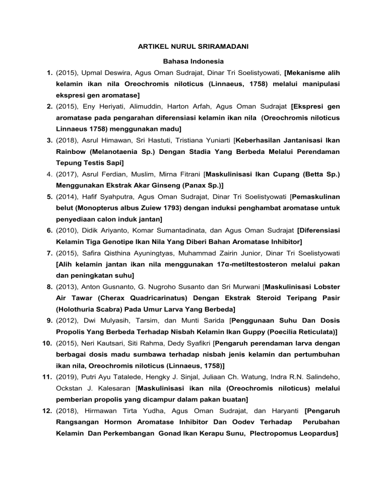 ARTIKEL NURUL SRIRAMADANI Bahasa Indonesia 1. (2015), Upmal Deswira, Agus Oman Sudrajat, Dinar Tri Soelistyowati, [Mekanisme alih kelamin ikan nila Oreochromis niloticus (Linnaeus, 1758) melalui manipulasi ekspresi gen aromatase] 2. (2015), Eny Heriyati, Alimuddin, Harton Arfah, Agus Oman Sudrajat [Ekspresi gen aromatase pada pengarahan diferensiasi kelamin ikan nila (Oreochromis niloticus Linnaeus 1758) menggunakan madu] 3. (2018), Asrul Himawan, Sri Hastuti, Tristiana Yuniarti [Keberhasilan Jantanisasi Ikan Rainbow (Melanotaenia Sp.) Dengan Stadia Yang Berbeda Melalui Perendaman Tepung Testis Sapi] 4. (2017), Asrul Ferdian, Muslim, Mirna Fitrani [Maskulinisasi Ikan Cupang (Betta Sp.) Menggunakan Ekstrak Akar Ginseng (Panax Sp.)] 5. (2014), Hafif Syahputra, Agus Oman Sudrajat, Dinar Tri Soelistyowati [Pemaskulinan belut (Monopterus albus Zuiew 1793) dengan induksi penghambat aromatase untuk penyediaan calon induk jantan] 6. (2010), Didik Ariyanto, Komar Sumantadinata, dan Agus Oman Sudrajat [Diferensiasi Kelamin Tiga Genotipe Ikan Nila Yang Diberi Bahan Aromatase Inhibitor] 7. (2015), Safira Qisthina Ayuningtyas, Muhammad Zairin Junior, Dinar Tri Soelistyowati [Alih kelamin jantan ikan nila menggunakan 17α-metiltestosteron melalui pakan dan peningkatan suhu] 8. (2013), Anton Gusnanto, G. Nugroho Susanto dan Sri Murwani [Maskulinisasi Lobster Air Tawar (Cherax Quadricarinatus) Dengan Ekstrak Steroid Teripang Pasir (Holothuria Scabra) Pada Umur Larva Yang Berbeda] 9. (2012), Dwi Mulyasih, Tarsim, dan Munti Sarida [Penggunaan Suhu Dan Dosis Propolis Yang Berbeda Terhadap Nisbah Kelamin Ikan Guppy (Poecilia Reticulata)] 10. (2015), Neri Kautsari, Siti Rahma, Dedy Syafikri [Pengaruh perendaman larva dengan berbagai dosis madu sumbawa terhadap nisbah jenis kelamin dan pertumbuhan ikan nila, Oreochromis niloticus (Linnaeus, 1758)] 11. (2019), Putri Ayu Tatalede, Hengky J. Sinjal, Juliaan Ch. Watung, Indra R.N. Salindeho, Ockstan J. Kalesaran [Maskulinisasi ikan nila (Oreochromis niloticus) melalui pemberian propolis yang dicampur dalam pakan buatan] 12. (2018), Hirmawan Tirta Yudha, Agus Oman Sudrajat, dan Haryanti [Pengaruh Rangsangan Hormon Aromatase Inhibitor Dan Oodev Terhadap Perubahan Kelamin Dan Perkembangan Gonad Ikan Kerapu Sunu, Plectropomus Leopardus] Bahasa Inggris 1. (2010), Yu-Shan Luo, Wei Hu, Xiao-Chun Liu, Hao-Ran Lin, Zuo-Yan Zhu [Molecular cloning and mRNA expression pattern ofSox9during sex reversal in orange-spotted grouper (Epinephelus coioides) 2. (2015), Alistair McNair Senior, dkk. [Ecological And Evolutionary Applications For Environmental Sex Reversal Of Fish] 3. (2011), Alistair M Senior & Shinichi Nakagawa [A comparative analysis of chemically induced sex reversal in teleosts: challenging conventional suppositions] 4. (2010), Yan He, Xuan Shang, Junhua Sun, Lei Zhang, Wei Zhao, Yihao Tian, Hanhua Cheng, Androngjia Zhou [Gonadal Apoptosis During Sex Reversal of the Rice Field Eel: Implications for an Evolutionarily Conserved Role of the Molecular Chaperone Heat Shock Protein 10] 5. (2010), Mia G. Larsenand Erikbaatrup [Functional Behavior And Reproduction In Androgenic Sex Reversed Zebrafish (Danio Rerio) 6. (2012), Song Lin, Tillmann J. Benfey, Debbie J. Martin-Robichaud [Hormonal sex reversal in Atlantic cod,Gadus morhua] 7. (2012), Joanna Babiak, dkk [Induced sex reversal using an aromatase inhibitor, Fadrozole, in Atlantic halibut (Hippoglossus hippoglossusL.) 8. (2015) BDavid P. Coulter,dkk [Fluctuating Water Temperatures Affect Development, Physiological Responses and Cause Sex Reversal in Fathead Minnows] 9. (2016), Qing-Ping Xie, Xue He, Yi-Ning Sui, Li-Li Chen, Li-Na Sun, and De-Shou Wang [Haploinsufficiency of SF-1 Causes Female to Male Sex Reversal in Nile Tilapia,Oreochromis niloticus] 10. (2016) Sijie Chen, Hefei Zhang, Fenghua Wang, Wei Zhang, Gang Peng [nr0b1(DAX1) mutation in zebrafish causes female-to-male sex reversal through abnormal gonadal proliferation and differentiation] 11. (2013) N. T. Hamdoon,dkk [Hormonal sex reversal in Oreochromis niloticus by oral administration of diethylstilbesterole] 12. (2011) Asami Kuramochi, Atsuhiro Tsutiya, Toyoji Kaneko and Ritsuko Ohtani-Kaneko [Sexual Dimorphism of Gonadotropin-Releasing Hormone Type-III (GnRH3) Neurons and Hormonal Sex Reversal of Male Reproductive Behavior in Mozambique Tilapia] 13. (2014) Vincent Gennotte, dkk [Brief Exposure of Embryos to Steroids or Aromatase Inhibitor Induces Sex Reversal in Nile Tilapia (Oreochromis niloticus) 14. (2015) ZHI-GANG SHEN, dkk [Effects of 17-Methyltestosterone and Aromatase Inhibitor Letrozole on Sex Reversal, Gonadal Structure, and Growth in Yellow CatfishPelteobagrus Fulvidraco] 15. (2014) Takayoshi Matsunaga, dkk [an efficient molecular technique for sexing tiger pufferfish (fugu) and the occurrence of sex reversal in a hatchery population] 16. (2012) Yu Shi, dkk [Molecular identification of an androgen receptor and its changes in mRNA levels during 17α-methyltestosterone-induced sex reversal in the orangespotted grouper Epinephelus coioides] 17. (2011) Hanwen Yuan, dkk [Effects of low dietary protein level on serum oestradiol, testosterone and sex reversal in rice field eel, Monopterus albus(Zuiew) 18. (2016) Li Jiang, Hengde Li [Single locus maintains large variation of sex reversal in half smooth tongue sole (Cynoglossus semilaevis) 19. (2012) Rahul Das, dkk [Effect of Nonsteroidal Aromatase Inhibitor on Sex Reversal of Oreochromis mossambicus (Peters, 1852) 20. (2010) Rafik ZARRAD, dkk [Reproductive Cycle And Sex Reversal Of Pagellus Erythrinus (Linnaeus, 1758) In The Gulf Of Tunis (Central Mediterranean) 21. (2014) Stephan Wessels, dkk [Allelic Variant in the Anti-Mu¨llerian Hormone Gene Leads to Autosomal and Temperature-Dependent Sex Reversal in a Selected Nile Tilapia Line] 22. (2014) VINCENTGENNOTTE, dkk [The Sensitive Period for Male – to –Female Sex Reversal Begins atthe Embryonic Stagein the NileTilapia and is Associated With the Sex