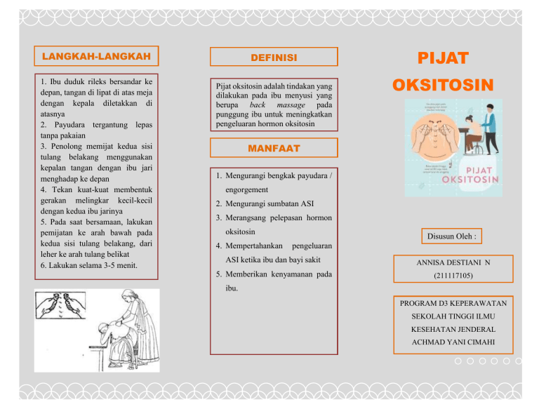 LANGKAH-LANGKAH 1. Ibu duduk rileks bersandar ke depan, tangan di lipat di atas meja dengan kepala diletakkan di atasnya 2. Payudara tergantung lepas tanpa pakaian 3. Penolong memijat kedua sisi tulang belakang menggunakan kepalan tangan dengan ibu jari menghadap ke depan 4. Tekan kuat-kuat membentuk gerakan melingkar kecil-kecil dengan kedua ibu jarinya 5. Pada saat bersamaan, lakukan pemijatan ke arah bawah pada kedua sisi tulang belakang, dari leher ke arah tulang belikat 6. Lakukan selama 3-5 menit. DEFINISI Pijat oksitosin adalah tindakan yang dilakukan pada ibu menyusi yang berupa back massage pada punggung ibu untuk meningkatkan pengeluaran hormon oksitosin PIJAT OKSITOSIN MANFAAT 1. Mengurangi bengkak payudara / Date of publication engorgement 2. Mengurangi sumbatan ASI 3. Merangsang pelepasan hormon oksitosin 4. Mempertahankan Disusun Oleh : pengeluaran ASI ketika ibu dan bayi sakit ANNISA DESTIANI N 5. Memberikan kenyamanan pada (211117105) ibu. PROGRAM D3 KEPERAWATAN SEKOLAH TINGGI ILMU KESEHATAN JENDERAL ACHMAD YANI CIMAHI HAL-HAL YANG HARUS DI PERHATIKAN 1. Mintalah keluarga) seseorang untuk (anggota membantu melakukan pijat oksitosin 2. Tenangkan pikiran 3. Pusatkan perhatian kepada bayi yang akan disusui 4. Perbanyak makan sayuran hijau 5. Kompres payudara dengan air hangat 6. Lakukanlah pijat ini di tempat yang membuat aman dan nyaman