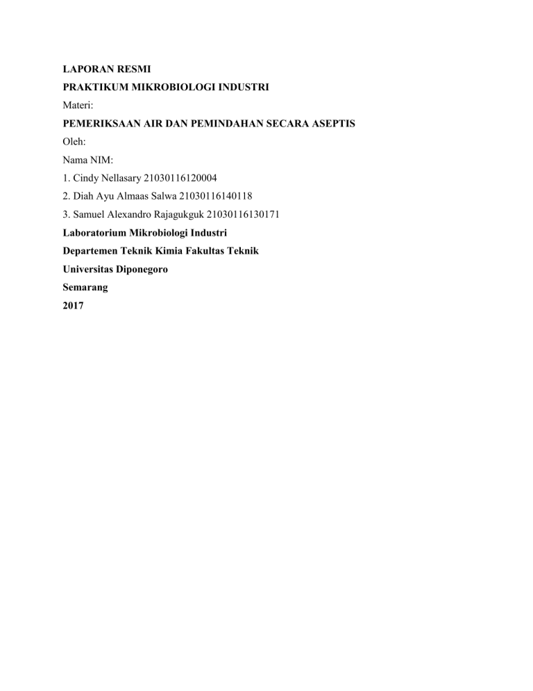 LAPORAN RESMI PRAKTIKUM MIKROBIOLOGI INDUSTRI Materi: PEMERIKSAAN AIR DAN PEMINDAHAN SECARA ASEPTIS Oleh: Nama NIM: 1. Cindy Nellasary 21030116120004 2. Diah Ayu Almaas Salwa 21030116140118 3. Samuel Alexandro Rajagukguk 21030116130171 Laboratorium Mikrobiologi Industri Departemen Teknik Kimia Fakultas Teknik Universitas Diponegoro Semarang 2017 LAPORAN RESMI PRAKTIKUM MIKROBIOLOGI INDUSTRI Materi: PEMERIKSAAN AIR DAN PEMINDAHAN SECARA ASEPTIS Oleh: Nama NIM: 1. Cindy Nellasary 21030116120004 2. Diah Ayu Almaas Salwa 21030116140118 3. Samuel Alexandro Rajagukguk 21030116130171 Laboratorium Mikrobiologi Industri Departemen Teknik Kimia Fakultas Teknik Universitas Diponegoro Semarang 2017 HALAMAN PENGESAHAN Laporan resmi Praktikum Bioproses yang berjudul Pemeriksaan Air dan Pemindahan Secara Aseptis yang disusun oleh: Kelompok : 4 Kamis Anggota : 1. Cindy Nellasary 21030116120004 2. Diah Ayu Almaas Salwa 21030116140118 3. Samuel Alexandro Rajagukguk 21030116130171 Telat diterima dan disahkan, pada: Hari : Tanggal : Laporan ini disusun sebagai syarat untuk mengikuti responsi dan seminar Praktikum Bioproses Semarang, November 2017 Mengetahui, Dosen Pembimbing Pranata Laboratorium Pendidikan Asisten Pembimbing Ir. Kristinah Handayani,M.T Jufriyah, S.T. Muhamad Iqbal Amali NIP. 197412162000122001 NIP. 197001091997032001 NIM. 21030115130210 PAPSA ii PAPSA PRAKATA Puji Syukur kami panjatkan kepada Allah SWT atas segala limpahan Rahmat, Inayah, Taufik, dan Hidayah-Nya sehingga kami dapat menyelesaikan laporan Praktikum Bioproses khususnya materi Nata dengan lancar. Laporan ini ditujukan sebagai syarat untuk menyelesaikan tugas Praktikum Bioproses yang sedang penulis lakukan pada semester ini. Penyusun menyadari bahwa tanpa bantuan dan kerjasama dari berbagai pihak maka laporan ini tidak dapat terselesaikan. Oleh karena itu penulis menyampaikan terimakasih kepada: 1. Ibu Dr. Ing Silviana, S.T., M.T. selaku Kepala Laboratorium Mikrobiologi Industri Universitas Diponegoro, 2. Ibu Jufriyah, S.T., selaku Pranata Laboratorium Pendidikan Laboratorium Mikrobiologi Industri Universitas Diponegoro, 3. Iqbal Ryan Ramadhan selaku koordinator asisten Laboratorium, 4. Muhamad Iqbal Amali selaku asisten pengampu pratikum Pemeriksaan Air dan Pemindahan Secara Aseptis, dan 5. Teman-teman rekan kerja yang telah membantu serta melancarkan proses penyusunan laporan ini. Penyusun berharap laporan ini dapat berguna dan bermanfaat bagi setiap pembaca dan pada umumnya. Laporan ini merupakan laporan terbaik yang saat ini bisa kami ajukan, namun kami menyadari pasti ada kekurangan yang perlu kami perbaiki. Maka dari itu kritik dan saran yang sifatnya membangun sangat kami harapkan. Semarang, November 2017 Penyusun iii PAPSA RINGKASAN Air merupakan materi esensial didalam kehidupan, dikarenakan tidak ada satu pun makhluk hidup yang tidak memerlukan atau bahkan tidak mengandung air. Beberapa peranan air dalam kehidupan manusia adalah sebagai air minum, keperluan memasak dan mencuci dan sebagainya. Mutu kualitas air dipengaruhi oleh sifat sifat bahan yang terkandung didalam air. Tujuan dari praktikum ini adalah agar mampu mengetahui pengaruh pH media dan konsentrasi Hand sanitizer detol terhadap jumlah koloni, menentukan growth rate dan doubling time pertumbuhan koloni serta membandingkan radius perkembangan mikroba dengan desinfektan berbeda baik jenis maupun konsentrasi. Air selain bermanfaat untuk manusia, juga bermanfaat menjadi media yang baik bagi kehidupan bakteri. Sebelum dapat digunakan, air harus berada dalam kondisi yan baik (bersih). Menurut peraturan Menteri Kesehatan Republik Indonesia, ada beberapa persyaratan air bersih, meliputi persyaratan biologis, fisik dan kimiawi. Koloni mikroba memiliki beberapa sifat yang dibagi menjadi 2, yaitu sifat umum, seperti ukuran koloni, bentuk, warna, kepekatan dan wajah permukaan, serta sifat khusus yang berada dalam media padat maupun media cair. Ada beberapa faktor yang mempengaruhi mikroba, yaitu termperatur, medium, pengaruh sinar,mekanik, kimia dan juga pH. Perhitungan koloni yang terbentuk dapat menggunakan SPC dan juga perhitungan manual. Bahan-bahan yang digunakan dalam praktikum ini adalah sampel air gedung B lantai 2 Teknik Kimia Undip, aquadest, media, dan desinfektan. Alat-alat yang digunakan adalah beaker glass, petridish,erlenmeyer, pengaduk, kompor listrik, dan pipet tetes. Sebelum memulai pemeriksaan air, maka dilakukan langkah pendahuluan yaitu menyiapkan media yang akan digunakan dan membagi media ke petridihs secara merata. Uji koloni dilakukan dengan cara menyiapkan media, menaburkan sampel dan diinkubasi 2 hari. Sedangkan untuk uji desinfektan dilakukan dengan menyiapkan media, meneteskan desinfektan dan diinkubasi 2 hari. Dari hasil percobaan, diperoleh banyak nya jumlah koloni disetiap media dengan pH yang berbeda. Untuk jumlah koloni, yang paling banyak terdapat pada media dengan pH 7. Hal ini dikarenakan mikroba cenderung cepat berumbuh pada pH netral. Untuk nilai growrate paling besar dan doubling time paling kecil terdapat pada media dengan pH 5. Didapat juga hasil bahwa semakin tinggi konsentrasi desinfektan maka semakin jauh radius pertumbuhan mikroba dari sumber desinfektan. Kesimpulan yang didapat adalah jumlah koloni terbanyak berada pada media dengan pH 7. Saran yang diberikan adalah semua alat yang digunakan harus berada dalam kondisi steril, menjaga petridish agar tetap steril, memperhatikan kepadatan media, penaburan sampel secara merata dan teliti dalam menghitung jumlah koloni. Kata kunci: Growth rate; Doubling time; Desinfektan iv PAPSA SUMMARY Water is an essential material in life, because there is no living thing that does not require or even does not contain water. Some of the role of water in human life is as drinking water, cooking and washing and so on. The quality of water quality is influenced by the nature of the material contained in the water. The purpose of this lab is to be able to know the effect of pH media and concentr