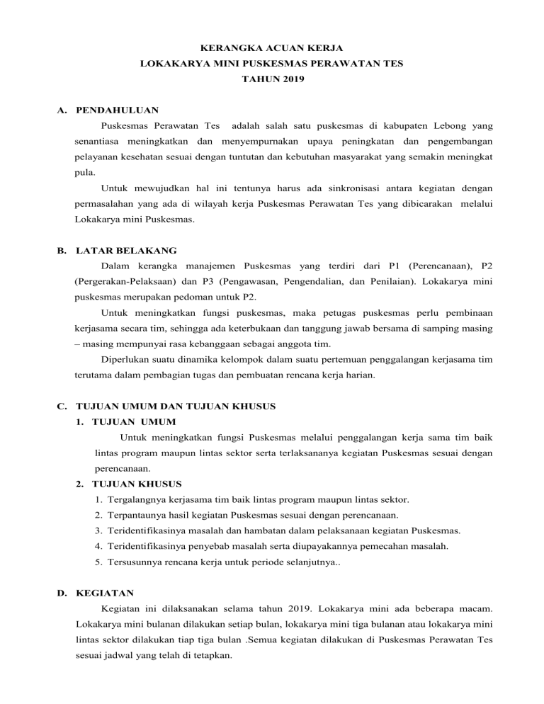 KERANGKA ACUAN KERJA LOKAKARYA MINI PUSKESMAS PERAWATAN TES TAHUN 2019 A. PENDAHULUAN Puskesmas Perawatan Tes adalah salah satu puskesmas di kabupaten Lebong yang senantiasa meningkatkan dan menyempurnakan upaya peningkatan dan pengembangan pelayanan kesehatan sesuai dengan tuntutan dan kebutuhan masyarakat yang semakin meningkat pula. Untuk mewujudkan hal ini tentunya harus ada sinkronisasi antara kegiatan dengan permasalahan yang ada di wilayah kerja Puskesmas Perawatan Tes yang dibicarakan melalui Lokakarya mini Puskesmas. B. LATAR BELAKANG Dalam kerangka manajemen Puskesmas yang terdiri dari P1 (Perencanaan), P2 (Pergerakan-Pelaksaan) dan P3 (Pengawasan, Pengendalian, dan Penilaian). Lokakarya mini puskesmas merupakan pedoman untuk P2. Untuk meningkatkan fungsi puskesmas, maka petugas puskesmas perlu pembinaan kerjasama secara tim, sehingga ada keterbukaan dan tanggung jawab bersama di samping masing – masing mempunyai rasa kebanggaan sebagai anggota tim. Diperlukan suatu dinamika kelompok dalam suatu pertemuan penggalangan kerjasama tim terutama dalam pembagian tugas dan pembuatan rencana kerja harian. C. TUJUAN UMUM DAN TUJUAN KHUSUS 1. TUJUAN UMUM Untuk meningkatkan fungsi Puskesmas melalui penggalangan kerja sama tim baik lintas program maupun lintas sektor serta terlaksananya kegiatan Puskesmas sesuai dengan perencanaan. 2. TUJUAN KHUSUS 1. Tergalangnya kerjasama tim baik lintas program maupun lintas sektor. 2. Terpantaunya hasil kegiatan Puskesmas sesuai dengan perencanaan. 3. Teridentifikasinya masalah dan hambatan dalam pelaksanaan kegiatan Puskesmas. 4. Teridentifikasinya penyebab masalah serta diupayakannya pemecahan masalah. 5. Tersusunnya rencana kerja untuk periode selanjutnya.. D. KEGIATAN Kegiatan ini dilaksanakan selama tahun 2019. Lokakarya mini ada beberapa macam. Lokakarya mini bulanan dilakukan setiap bulan, lokakarya mini tiga bulanan atau lokakarya mini lintas sektor dilakukan tiap tiga bulan .Semua kegiatan dilakukan di Puskesmas Perawatan Tes sesuai jadwal yang telah di tetapkan. E. CARA MELAKSANAKAN KEGIATAN 1. Minilokarya bulanan : a. Petugas membentuk tim untuk kegiatan minilokakarya b. Petugas melakukan koordinasi dengan tim c. Petugas membuat jadwal selam satu tahun d. Petugas menyampaikan jadwal seminggu sebelum pelaksanaan e. Petugas menyiapkan absensi dan materi yang akan dibahas f. Petugas memaparkan hasil kegiatan dan program g. Petugas menyampaikan semua masalah dan kendala yang menyebabkan tidak tercapainya suatu program h. Petugas mendiskusikan rencana tindak lanjut yang akan dilakukan 2. Minilokakarya tribulan (linsek): a. Petugas membentuk tim untuk kegiatan minilokakarya b. Petugas melakukan koordinasi dengan tim c. Petugas membuat jadwal selama satu tahun d. Petugas mengirimkan undangan atau pemberitahuan kepada lintas sektor seminggu sebelum pelaksaan e. Petugas menyiapkan absensi dan materi yang akan dibahas f. Petugas memaparkan hasil kegiatan dan program g. Petugas menyampaikan smua masalah dan kendala yang menyebabkan tidak tercapainya suatu program h. Petugas mendiskusikan rencana tindak lanjut yang akan dilakukan F. SASARAN Sasaran minilokakarya bulanan maupun tahunan adalah seluruh staf Puskesmas Perawatan Tes. Sedangkan sasaran minilokakarya lintas sektor adalah seluruh komponen masyarakat yang terkait. Kelurahan, kecamatan, KUA, dinas pendidikan serta tokoh masyarakat. G. JADUAL PELAKSANAAN NO 1 Kegiatan Minilokakarya bulanan 2 Minilokakarya Lintas sektor BULAN Jan Feb Mar Apr Mei Juni Juli Agts Sept Okt Nov Des √ √ √ √ √ √ √ √ √ √ √ √ √ H. EVALUASI PELAKSANAAN KEGIATAN DAN PELAPORAN Evaluasi ketepatan jadwal pelaksanaan dilakukan setiap bulan Juni dan Desember, dilakukan oleh Penanggung jawab Program. Akan dilakukan tindakan korektif jika terjadi ketidaktepatan jadual pelaksanaan. Pelaporan tentang evaluasi ketepatan jadwual pelaksanaan kegiatan berupa check list disertai dengan keterangan tindakan korektif jika terjadi ketidaktepatan jadual pelaksanaan kegiatan. Laporan evaluasi ini dibuat pada minggu ke -4 bulan Juni , dan minggu ke -4 bulan Desember 2019 dan ditujukan kepada Kepala Puskesmas dan Dinas Kesehatan Kabupaten Lebong. I. PENCATATAN PELAPORAN DAN EVALUASI KEGIATAN Pencatatan pelaporan dan evaluasi kegiatan ini merupakan Laporan dan Evaluasi Pelaksanaan Kegiatan. Pada dasarnya laporan berisi tanggal pelaksanaan, kendala yang dihadapi yang sekaligus merupakan bentuk evaluasi terhadap pelaksanaan kegiatan. Laporan evaluasi ini dibuat pada minggu ke -4 bulan Juni , dan minggu ke -4 bulan Desember 2019. Dilakukan setiap kali selesai melakukan kegiatan, dan ditujukan kepada Kepala Puskesmas dan Dinas Kesehatan Kabupaten Probolinggo J. RENCANA ANGGARAN BIAYA Biaya kegiatan ini dibebankan kepada dana BOK 2018. Mengetahui Kepala Puskesmas Tes Kepala Tata Usah Puskesmas Perawatan Tes Apriyani, SKM Nip. 19800404 200312 2 007 Beza Yulian Utami, Amd.Keb Nip. 19880723 201001 2 007 LAPORAN EVALUASI HASIL PELAKSANAAN KEGIATAN 1. Nama Kegiatan : Minilokakarya 2. Tanggal Pelaksanaan : Minilokakarya bulanan dilaksanakan tanggal 6 Januari , 9 Februari, 10 Maret, 7 April, 5 Mei, 16 Juni, 8 Juli, 12 Agustus, 9 September, 7 Oktober, 5 November, 16 Desember 2016 Minilokakarya Tribulan (linsek) dilaksanakan tanggal 12 Maret, 12 Mei, 17 Oktober, 12 Desember 2016 Minilokakarya tahunan dilaksanakan tanggal 20 Desember 2016 3. Target Jumlah Sasaran : sesuai dengan juknis dari Dinas Kesehatan Kabupaten Probolinggo Kriteria Sasaran : Seluruh staff puskesmas Tegalsiwalan dan lintas sektor yang terkait Lain –lain 4. Hasil Kegiatan 5. Masalah : : Arsip laporan. : Pada dasarnya masalah yang ada adalah tentang pencapaian program yang belum mencapai target. Masalah yang lain adalah tentang permasalahan yang ada di wilayah, termasuk ada tidaknya kejadian luar biasa. Kualitas mutu layanan juga terkadang termasuk Beberapa hal dalam khusus permasalahan situasional juga yang ada. merupakan permasalahan yang harus diselesaikan. 6. R