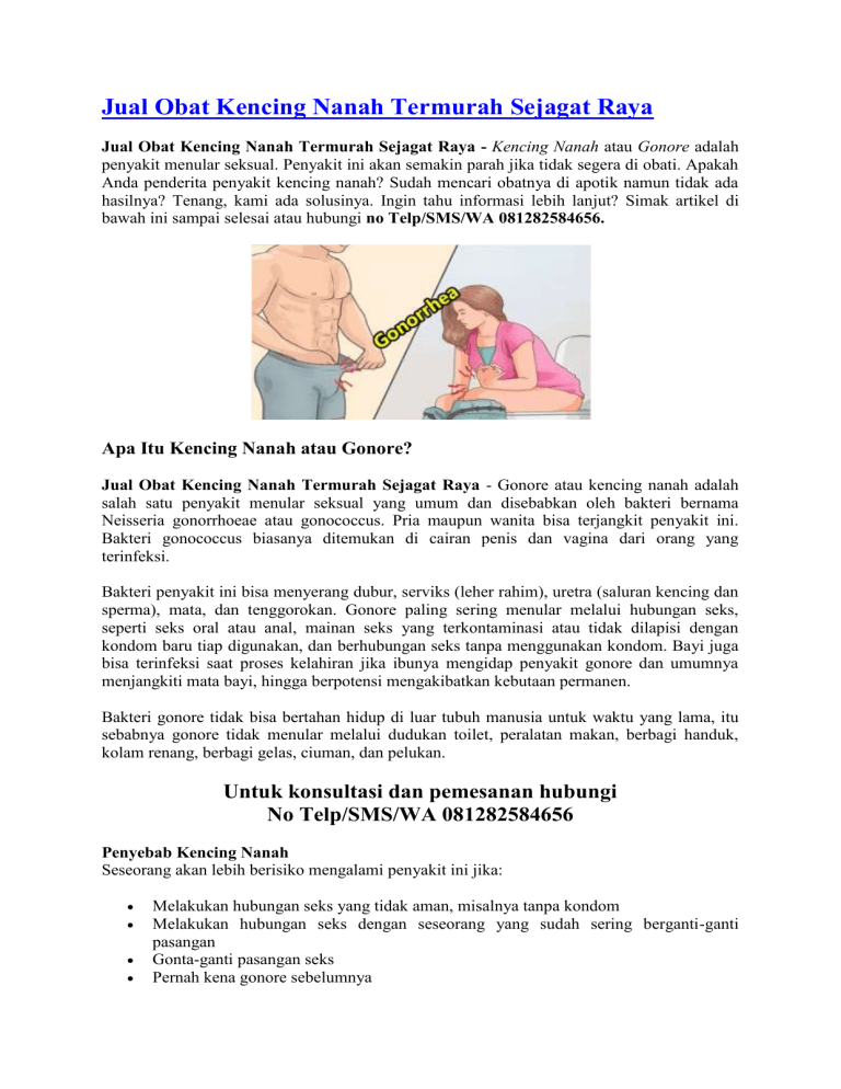 Jual Obat Kencing Nanah Termurah Sejagat Raya Jual Obat Kencing Nanah Termurah Sejagat Raya - Kencing Nanah atau Gonore adalah penyakit menular seksual. Penyakit ini akan semakin parah jika tidak segera di obati. Apakah Anda penderita penyakit kencing nanah? Sudah mencari obatnya di apotik namun tidak ada hasilnya? Tenang, kami ada solusinya. Ingin tahu informasi lebih lanjut? Simak artikel di bawah ini sampai selesai atau hubungi no Telp/SMS/WA 081282584656. Apa Itu Kencing Nanah atau Gonore? Jual Obat Kencing Nanah Termurah Sejagat Raya - Gonore atau kencing nanah adalah salah satu penyakit menular seksual yang umum dan disebabkan oleh bakteri bernama Neisseria gonorrhoeae atau gonococcus. Pria maupun wanita bisa terjangkit penyakit ini. Bakteri gonococcus biasanya ditemukan di cairan penis dan vagina dari orang yang terinfeksi. Bakteri penyakit ini bisa menyerang dubur, serviks (leher rahim), uretra (saluran kencing dan sperma), mata, dan tenggorokan. Gonore paling sering menular melalui hubungan seks, seperti seks oral atau anal, mainan seks yang terkontaminasi atau tidak dilapisi dengan kondom baru tiap digunakan, dan berhubungan seks tanpa menggunakan kondom. Bayi juga bisa terinfeksi saat proses kelahiran jika ibunya mengidap penyakit gonore dan umumnya menjangkiti mata bayi, hingga berpotensi mengakibatkan kebutaan permanen. Bakteri gonore tidak bisa bertahan hidup di luar tubuh manusia untuk waktu yang lama, itu sebabnya gonore tidak menular melalui dudukan toilet, peralatan makan, berbagi handuk, kolam renang, berbagi gelas, ciuman, dan pelukan. Untuk konsultasi dan pemesanan hubungi No Telp/SMS/WA 081282584656 Penyebab Kencing Nanah Seseorang akan lebih berisiko mengalami penyakit ini jika: Melakukan hubungan seks yang tidak aman, misalnya tanpa kondom Melakukan hubungan seks dengan seseorang yang sudah sering berganti-ganti pasangan Gonta-ganti pasangan seks Pernah kena gonore sebelumnya Pernah mengalami penyakit kelamin lain sebelumnya Tanda-tanda & gejala Kondisi ini biasanya tidak akan langsung menunjukkan gejala langsung saat pertama kali terinfeksi. Gejala biasanya muncul sekitar 10-20 hari setelah infeksi. Ketika gejala mulai muncul, Anda lebih baik mendapatkan pengobatan sesegera mungkin. Jika tidak diobati, gonore dapat menyebabkan ruam, demam, dan akhirnya nyeri sendi. Sayangnya, tidak semua orang menyadari gejala yang muncul dari penyakit menular seksual ini. Bahkan ada yang mengidap kondisi ini, etapi tanpa menunjukkan gejala-gejala yang ada dan biasanya disebut nonsymptomatic carrier alias pembawa non gejala. Terdapat dua gejala berbeda pada perempuan dan laki-laki. Gejalanya pada laki-laki Sebagian besar laki-laki mungkin tidak akan menyadari gejala bahwa ia telah mengidap gonore, karena beberapa laki-laki memang tidak mendapatkan gejalanya. Gejala yang paling umum dan paling pertama dikenali adalah rasa panas atau terbakar ketika buang air kecil. Setelah itu akan diikuti oleh gejala lainnya berupa: Frekuensi buang air kecil yang cukup sering Keluarnya nanah dari penis (tetesan cairan) berwarna putih, kuning, krem atau kehijau-hijauan) Bengkak dan kemerahan pada bukaan atau kulup penis Bengkak atau nyeri pada testis Sakit tenggorokan yang datang terus-menerus Ketika telah diobati, infeksi ini mungkin masih akan bertahan di tubuh selama beberapa hari. Pada kasus yang jarang ditemui, gonore dapat menyebabkan kerusakan pada tubuh, khususnya urethra dan testis. Rasa nyeri juga dapat dirasakan hingga ke rektum. Gejalanya pada perempuan Beberapa perempuan sulit mengidentifikasi gejala gonore ini, sebab gejala yang muncul ada kemiripan dengan infeksi lain. Gejala penyakit seksual menular pada perempuan ini awalnya tidak terbentuk dengan jelas, seperti infeksi jamur vagina pada umumnya, sehingga beberapa perempuan salah menebak infeksi yang diidapnya. Berikut ini adalah beberapa gejala yang muncul pada perempuan: Keluar cairan dari vagina (berair, menyerupai krim, sedikit kehijauan) Ketika buang air kecil, adanya sensasi nyeri dan rasa panas Frekuensi buang air kecil yang cukup sering Munculnya bercak darah atau perdarahan saat tidak sedang menstruasi Rasa nyeri ketika melakukan hubungan seksual Rasa nyeri juga dirasakan pada perut bagian bawah atau nyeri panggul Bengkak pada vulva Rasa terbakar atau panas di tenggorokan (ketika sudah melakukan oral seks) Demam Faktor-faktor risiko Ada banyak faktor risiko untuk gonore, seperti: Anda aktif secara seksual Anda memiliki pasangan seks yang baru Anda memiliki banyak pasangan seks Anda pernah didiagnosis gonore sebelumnya Anda memiliki infeksi menular seksual lainnya Bagaimana cara mencegah Penyakit Kencing nanah? Untuk mengurangi risiko infeksi kencing nanah bisa dilakukan dengan berbagai cara, antara lain : Gunakan kondom dengan benar setiap kali Anda berhubungan seks. Setia terhadap pasangan, jangan berganti-ganti partner seks. Membatasi kontak seksual hanya dengan satu pasangan yang benar-benar steril. Pertanyaan yang sering terpikirkan di benak Anda : Jika Saya terlanjur kena gonore bagaimana cara mengobatinya? Bagaimana cara mengobati kencing nanah dengan cepat dan tuntas? Bagaimana berobat yang mudah tanpa perlu malu untuk ke dokter? Jawabannya: semua bisa, asal Anda memilih produk yang tepat, yaitu Gang Jie Gho Siah De Nature. Harga Rp. 295.000 Pemesanan obat hubungi tlp/sms/whatsapp : 081282584656 Manfaat Obat Kencing Nanah De Nature Banyak sekali khasiat yang didapat dari obat ini untuk mengobati sipilis kencing nanah gonore, antara lain : Gang Jie dan Gho Siah terdapat kandungan alami antibiotik dan antiviral, yang bermanfaat membasmi secara cepat dan tuntas bakteri Neisseria gonorrhoeae tanpa efek samping yang membahayakan tubuh. Produk yang mujarab karena berbahan dasar dengan kualitas tinggi yang kami kembangkan sendiri sehingga terjaga kualitasnya. Gang Jie dan Gho Siah sangat berguna untuk imunitas, hal ini sangat penting pagi penderita penyakit kelamin, sehingga proses penyembuhan menjadi lebih cepat dan juga