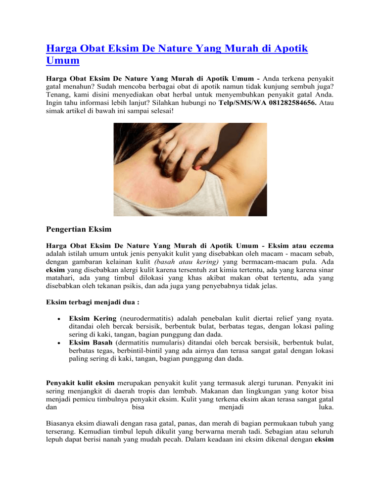 Harga Obat Eksim De Nature Yang Murah di Apotik Umum Harga Obat Eksim De Nature Yang Murah di Apotik Umum - Anda terkena penyakit gatal menahun? Sudah mencoba berbagai obat di apotik namun tidak kunjung sembuh juga? Tenang, kami disini menyediakan obat herbal untuk menyembuhkan penyakit gatal Anda. Ingin tahu informasi lebih lanjut? Silahkan hubungi no Telp/SMS/WA 081282584656. Atau simak artikel di bawah ini sampai selesai! Pengertian Eksim Harga Obat Eksim De Nature Yang Murah di Apotik Umum - Eksim atau eczema adalah istilah umum untuk jenis penyakit kulit yang disebabkan oleh macam - macam sebab, dengan gambaran kelainan kulit (basah atau kering) yang bermacam-macam pula. Ada eksim yang disebabkan alergi kulit karena tersentuh zat kimia tertentu, ada yang karena sinar matahari, ada yang timbul dilokasi yang khas akibat makan obat tertentu, ada yang disebabkan oleh tekanan psikis, dan ada juga yang penyebabnya tidak jelas. Eksim terbagi menjadi dua : Eksim Kering (neurodermatitis) adalah penebalan kulit diertai relief yang nyata. ditandai oleh bercak bersisik, berbentuk bulat, berbatas tegas, dengan lokasi paling sering di kaki, tangan, bagian punggung dan dada. Eksim Basah (dermatitis numularis) ditandai oleh bercak bersisik, berbentuk bulat, berbatas tegas, berbintil-bintil yang ada airnya dan terasa sangat gatal dengan lokasi paling sering di kaki, tangan, bagian punggung dan dada. Penyakit kulit eksim merupakan penyakit kulit yang termasuk alergi turunan. Penyakit ini sering menjangkit di daerah tropis dan lembab. Makanan dan lingkungan yang kotor bisa menjadi pemicu timbulnya penyakit eksim. Kulit yang terkena eksim akan terasa sangat gatal dan bisa menjadi luka. Biasanya eksim diawali dengan rasa gatal, panas, dan merah di bagian permukaan tubuh yang terserang. Kemudian timbul lepuh dikulit yang berwarna merah tadi. Sebagian atau seluruh lepuh dapat berisi nanah yang mudah pecah. Dalam keadaan ini eksim dikenal dengan eksim basah. Lama kelamaan lepuh mengering dan mengeropeng yang disebut eksim kering. Eksim kering dapat berubah lagi menjadi eksim basah jika lepuh bernanah timbul lagi. Harga Rp 295.000 Informasi lebih lanjut hubungi Telp/SMS/WA 081282584656 Apa Saja Gejala Eksim? Harga Obat Eksim De Nature Yang Murah di Apotik Umum - Dimanapun lokasi timbulnya eksim, gejala utama yang dirasakan pasien adalah gatal. Terkadang rasa gatal sudah muncul sebelum ada tanda kemerahan pada kulit. Gejala kemerahan biasanya akan muncul pada wajah, lutut, tangan dan kaki, namun tidak menutup kemungkinan kemerahan muncul di daerah lain. Daerah yang terkena akan terasa sangat kering, menebal atau keropeng. Pada orang kulit putih, daerah ini pada mulanya akan berwarna merah muda lalu berubah menjadi cokelat. Sementara itu pada orang dengan kulit lebih gelap, eksim akan mempengaruhi pigmen kulit sehingga daerah eksim akan tampak lebih terang atau lebih gelap. Apa yang Menjadi Penyebab Eksim Harga Obat Eksim De Nature Yang Murah di Apotik Umum - Penyebab dari eksim sebenarnya belum diketahui dengan pasti, namun beberapa ahli mencurigai eksim berhubungan dengan aktifitas daya pertahanan tubuh (imun) yang berlebihan. Hal ini menyebabkan tubuh mengalami reaksi berlebihan terhadap bakteri atau iritan yang sebenarnya tidak berbahaya pada kulit. Oleh karena itu, eksim banyak ditemukan pada keluarga dengan riwayat penyakit alergi atau asma. Tiap tiap orang mempunyai pencetus eksim yang berbeda beda. Ada orang yang setelah memegang sabun atau deterjen akan merasakan gatal yang luar biasa, ada pula yang disebabkan oleh bahan atau alat rumah tangga yang lain. Gejala yang timbul pun bervariasi, ada yang gatalnya ringan tetapi rasa panas yang dominan, ada pula yang sebaliknya. Infeksi saluran nafas bagian atas atau flu juga bisa menjadi pencetus timbulnya eksim. Stress yang dialami penderita akan membuat gejala menjadi lebih buruk. Jenis – Jenis Penyakit Gatal Eksim : 1. Dermatitis atopik : salah satu jenis eksim yang paling sering dijumpai dan merupakan penyakit turunan. Dermatitis atopik umumnya dimulai ketika bayi dan masih anakanak dengan gejala berupa gatal, radang kulit, dan pada sebagian penderita sering timbul asma dan demam hay (hay fever). 2. Dermatitis kontak : meliputi dermatitis kontak alergik dan iritan. Dermatitis kontak alergik disebabkan oleh reaksi kekebalan tertunda (delayed immune system) akibat kontak kulit dengan senyawa alergenik sehingga menyebabkan radang kulit dalam 48 jam setelah paparan terjadi. Beberapa agen penyebab eksim jenis ini adalah jelatang, parfum, pengawet kosmetik, metal, dan pewarna. 3. Dermatitis kontak iritan terjadi karena paparan senyawa iritan yang dapat merusak kulit secara kimiawi, contohnya sabun keras, detergen, dan produk pembersih lainnya. Senyawa iritan tersebut dapat menghilangkan minyak dan kelembaban dari lapisan luar kulit, kemudian merusak lapisan pelindung dan memicu terjadinya peradangan. 4. Eksim numular : beberapa plak eksim yang biasanya berhubungan dengan kulit kering dan terjadi pada bagian luar dari kaki, tangan, dan lengan. 5. Eksim stasis : jenis eksim kronis pada daerah bawah kaki bagian dalam yang berkaitan dengan varises. Pertanyaan yang sering terpikirkan di benak Anda : Jika Saya terlanjur kena penyakit eksim, bagaimana cara mengobatinya? Bagaimana cara mengobati penyakit eksim dengan cepat dan tuntas? Bagaimana berobat yang mudah tanpa perlu malu untuk ke dokter? Jawabannya: semua bisa, asal Anda memilih produk yang tepat, yaitu Eximtas, Kapsul BD De Nature dan Salep Exclear. Pengobatan Penyakit Eksim Harga Obat Eksim De Nature Yang Murah di Apotik Umum - Pengobatan Eksim secara tradisional yaitu dengan menggunakan Obat Eksim dari De Nature. Produk yang terbuat dari bahan herbal alami diramu dengan resep tradisional dan diolah secara teknologi modern, sehingga aman di konsumsi. Jadi anda juga tak perlu khawatir karena Obat Herbal De Nature yang kami tawarkan ini, Alhamdulillah, merupakan obat yang telah banyak menyembuhkan penderita