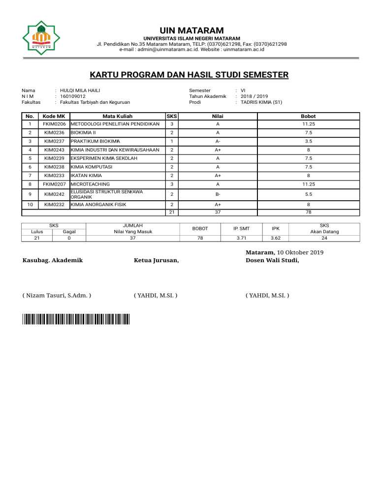 UIN MATARAM UNIVERSITAS ISLAM NEGERI MATARAM Jl. Pendidikan No.35 Mataram Mataram, TELP: (0370)621298, Fax: (0370)621298 e-mail : [email protected]. Website : uinmataram.ac.id KARTU PROGRAM DAN HASIL STUDI SEMESTER Nama NIM Fakultas No. : HULQI MILA HAILI : 160109012 : Fakultas Tarbiyah dan Keguruan Kode MK Semester Tahun Akademik Prodi Mata Kuliah : VI : 2018 / 2019 : TADRIS KIMIA (S1) SKS Nilai Bobot 1 FKIM0206 METODOLOGI PENELITIAN PENDIDIKAN 3 A 11.25 2 KIM0236 BIOKIMIA II 2 A 7.5 3 KIM0237 PRAKTIKUM BIOKIMIA 1 A- 3.5 4 KIM0243 KIMIA INDUSTRI DAN KEWIRAUSAHAAN 2 A+ 8 5 KIM0239 EKSPERIMEN KIMIA SEKOLAH 2 A 7.5 6 KIM0238 KIMIA KOMPUTASI 2 A 7.5 7 KIM0233 IKATAN KIMIA 2 A+ 8 8 FKIM0207 MICROTEACHING 3 A 11.25 9 KIM0242 ELUSIDASI STRUKTUR SENYAWA ORGANIK 2 B- 5.5 10 KIM0232 KIMIA ANORGANIK FISIK 2 A+ 8 21 37 78 SKS Lulus 21 Gagal 0 JUMLAH Nilai Yang Masuk 37 BOBOT IP. SMT IPK 78 3.71 3.62 SKS Akan Datang 24 Kasubag. Akademik Ketua Jurusan, Mataram, 10 Oktober 2019 Dosen Wali Studi, ( Nizam Tasuri, S.Adm. ) ( YAHDI, M.SI. ) ( YAHDI, M.SI. )