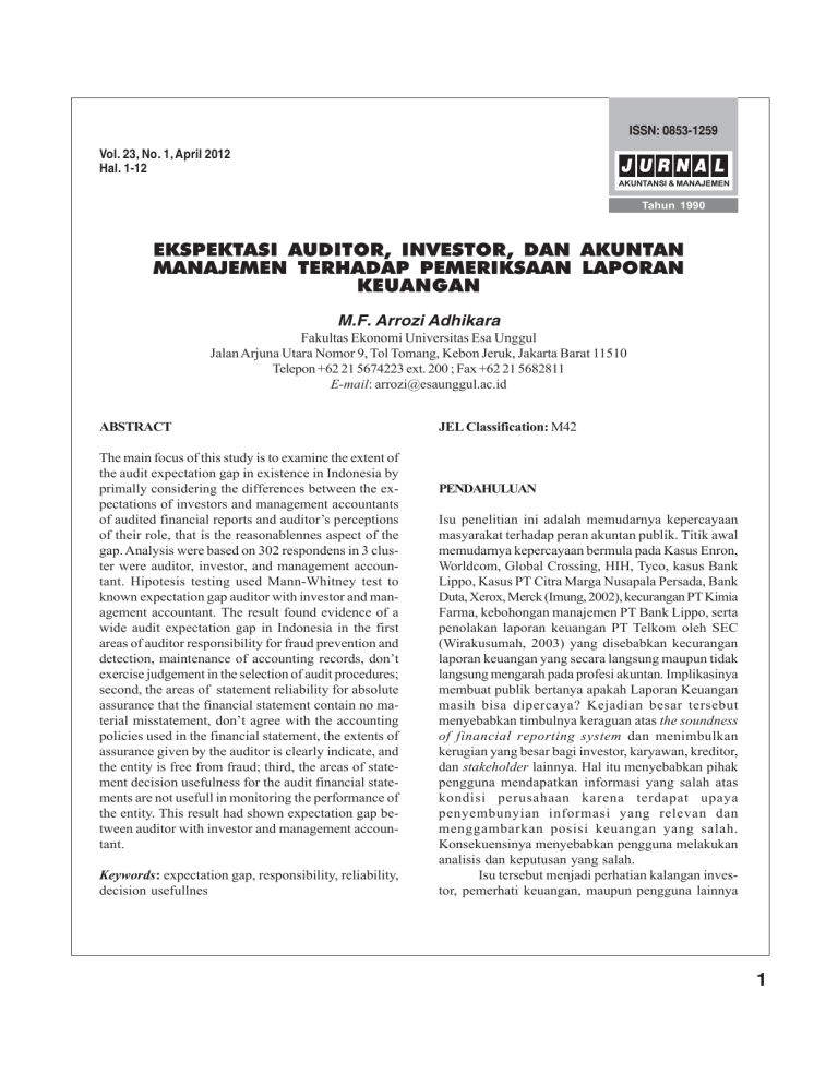 ISSN: 0853-1259 EKSPEKTASI AUDITOR, INVESTOR, DAN AKUNTAN MANAJEMEN............... (M.F. Arrozi Adhikara) Vol. 23, No. 1, April 2012 Hal. 1-12 JURNA L AKUNTANSI & MANAJEMEN Tahun 1990 EKSPEKTASI AUDITOR, INVESTOR, DAN AKUNTAN MANAJEMEN TERHADAP PEMERIKSAAN LAPORAN KEUANGAN M.F. Arrozi Adhikara Fakultas Ekonomi Universitas Esa Unggul Jalan Arjuna Utara Nomor 9, Tol Tomang, Kebon Jeruk, Jakarta Barat 11510 Telepon +62 21 5674223 ext. 200 ; Fax +62 21 5682811 E-mail: [email protected] ABSTRACT The main focus of this study is to examine the extent of the audit expectation gap in existence in Indonesia by primally considering the differences between the expectations of investors and management accountants of audited financial reports and auditor’s perceptions of their role, that is the reasonablennes aspect of the gap. Analysis were based on 302 respondens in 3 cluster were auditor, investor, and management accountant. Hipotesis testing used Mann-Whitney test to known expectation gap auditor with investor and management accountant. The result found evidence of a wide audit expectation gap in Indonesia in the first areas of auditor responsibility for fraud prevention and detection, maintenance of accounting records, don’t exercise judgement in the selection of audit procedures; second, the areas of statement reliability for absolute assurance that the financial statement contain no material misstatement, don’t agree with the accounting policies used in the financial statement, the extents of assurance given by the auditor is clearly indicate, and the entity is free from fraud; third, the areas of statement decision usefulness for the audit financial statements are not usefull in monitoring the performance of the entity. This result had shown expectation gap between auditor with investor and management accountant. Keywords: expectation gap, responsibility, reliability, decision usefullnes JEL Classification: M42 PENDAHULUAN Isu penelitian ini adalah memudarnya kepercayaan masyarakat terhadap peran akuntan publik. Titik awal memudarnya kepercayaan bermula pada Kasus Enron, Worldcom, Global Crossing, HIH, Tyco, kasus Bank Lippo, Kasus PT Citra Marga Nusapala Persada, Bank Duta, Xerox, Merck (Imung, 2002), kecurangan PT Kimia Farma, kebohongan manajemen PT Bank Lippo, serta penolakan laporan keuangan PT Telkom oleh SEC (Wirakusumah, 2003) yang disebabkan kecurangan laporan keuangan yang secara langsung maupun tidak langsung mengarah pada profesi akuntan. Implikasinya membuat publik bertanya apakah Laporan Keuangan masih bisa dipercaya? Kejadian besar tersebut menyebabkan timbulnya keraguan atas the soundness of financial reporting system dan menimbulkan kerugian yang besar bagi investor, karyawan, kreditor, dan stakeholder lainnya. Hal itu menyebabkan pihak pengguna mendapatkan informasi yang salah atas kondisi perusahaan karena terdapat upaya penyembunyian informasi yang relevan dan menggambarkan posisi keuangan yang salah. Konsekuensinya menyebabkan pengguna melakukan analisis dan keputusan yang salah. Isu tersebut menjadi perhatian kalangan investor, pemerhati keuangan, maupun pengguna lainnya 1 JAM, Vol. 23, No. 1, April 2012: 1-12 sehingga secara tidak langsung profesi akuntan mendapat kecaman publik. Kejadian skandal keuangan, kegagalan perusahaan, manipulasi laporan keuangan, kesalahan pemeriksaan laporan keuangan, dan skandal akuntansi yang menyebabkan peminggiran good corporate governance serta rekayasa keuangan yang terjadi pada praktik bisnis di perusahaan bukan hanya masalah akuntan publik karena hal tersebut menyangkut pelaporan kegiatan perusahaan secara keseluruhan. Dalam masalah financial reporting, semua pihak terlibat di dalamnya termasuk bankir, analis keuangan, serta berbagai pihak yang terlibat di pasar modal. Semuanya mempunyai peranan yang signifikan (Hadibroto, 2004). Problematika di atas terjadi karena beberapa hal (MZA, 1999). Hak istimewa akuntan, konspirasi auditor dengan klien, kesenjangan harapan, potensi ketidakjujuran manajemen, dan jasa profesional selain audit adalah penyebab potensi terjadinya skandal yang merusak profesionalisme akuntan. Proses tersebut berawal dari rekayasa keuangan yang dimulai dari pihak manajemen perusahaan sehingga muncul kolaborasi tidak sehat dengan akuntan dan tak jarang akuntanpun ikut mengusulkan karena kedekatan hubungan antara kedua pihak. Secara prinsip, akuntan tidak bertanggungjawab terhadap manipulasi kliennya (Suratman, 2002). Kantor akuntan publik hanya sebatas pada pernyataan pendapat atas laporan keuangan berdasarkan hasil audit. Prinsip ini seperti menempatkan kantor akuntan publik pada wilayah yang sangat abstrak untuk dituntut pertanggungjawaban. Profesi akuntan publik berada dalam posisi unik yaitu bekerja bukan hanya untuk kepentingan klien (manajemen) tetapi lebih besar untuk kepentingan pihak ketiga yang memiliki kepentingan terhadap laporan keuangan klien yang diauditnya. Profesi akuntan publik bertanggungjawab untuk menaikkan tingkat keandalan laporan keuangan perusahaan, sehingga masyarakat pengguna memperoleh informasi keuangan yang andal sebagai dasar untuk memutuskan alokasi sumbersumber ekonomi. Oleh karena itu, menjaga kepercayaan menjadi kewajiban akuntan publik di hadapan klien maupun pihak ketiga dengan senantiasa meningkatkan keahlian profesionalnya. Penelitian ini menanggapi isu tentang ekspektasi hasil pemeriksaan laporan keuangan dan memfokuskan pada batasan keyakinan kewajiban pemeriksaan laporan 2 keuangan secara umum sebagai pemahaman pengguna laporan audit. Penelitian ini mencoba melihat perspektif auditor, investor, dan akuntan manajemen tentang ekspektasi pengguna berkenaan atas penugasan yang diberikan oleh auditee kepada auditor berupa pemeriksaan laporan keuangan. Harapan auditor, auditee, investor dan pengguna terhadap hasil pemeriksaan tersebut adalah tugas dan tanggung jawab auditor dalam melakukan pemeriksaan laporan keuangan, serta perspektif harapan yang beragam dalam bentuk kesenjan