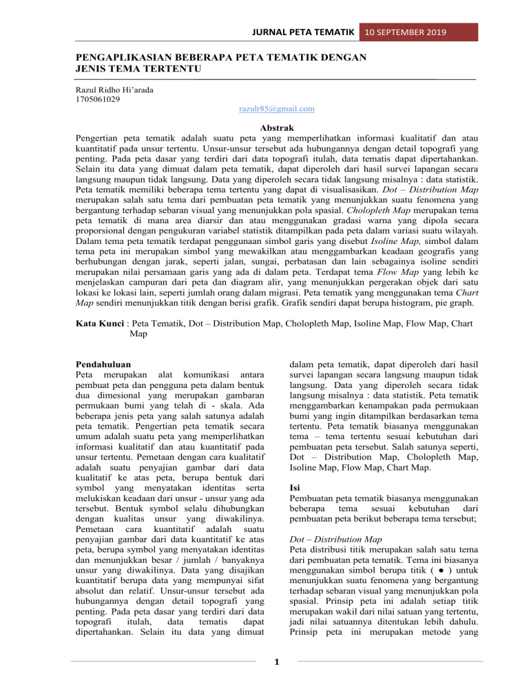 JURNAL PETA TEMATIK 10 SEPTEMBER 2019 PENGAPLIKASIAN BEBERAPA PETA TEMATIK DENGAN JENIS TEMA TERTENTU Razul Ridho Hi’arada 1705061029 [email protected] Abstrak Pengertian peta tematik adalah suatu peta yang memperlihatkan informasi kualitatif dan atau kuantitatif pada unsur tertentu. Unsur-unsur tersebut ada hubungannya dengan detail topografi yang penting. Pada peta dasar yang terdiri dari data topografi itulah, data tematis dapat dipertahankan. Selain itu data yang dimuat dalam peta tematik, dapat diperoleh dari hasil survei lapangan secara langsung maupun tidak langsung. Data yang diperoleh secara tidak langsung misalnya : data statistik. Peta tematik memiliki beberapa tema tertentu yang dapat di visualisasikan. Dot – Distribution Map merupakan salah satu tema dari pembuatan peta tematik yang menunjukkan suatu fenomena yang bergantung terhadap sebaran visual yang menunjukkan pola spasial. Cholopleth Map merupakan tema peta tematik di mana area diarsir dan atau menggunakan gradasi warna yang dipola secara proporsional dengan pengukuran variabel statistik ditampilkan pada peta dalam variasi suatu wilayah. Dalam tema peta tematik terdapat penggunaan simbol garis yang disebut Isoline Map, simbol dalam tema peta ini merupakan simbol yang mewakilkan atau menggambarkan keadaan geografis yang berhubungan dengan jarak, seperti jalan, sungai, perbatasan dan lain sebagainya isoline sendiri merupakan nilai persamaan garis yang ada di dalam peta. Terdapat tema Flow Map yang lebih ke menjelaskan campuran dari peta dan diagram alir, yang menunjukkan pergerakan objek dari satu lokasi ke lokasi lain, seperti jumlah orang dalam migrasi. Peta tematik yang menggunakan tema Chart Map sendiri menunjukkan titik dengan berisi grafik. Grafik sendiri dapat berupa histogram, pie graph. Kata Kunci : Peta Tematik, Dot – Distribution Map, Cholopleth Map, Isoline Map, Flow Map, Chart Map Pendahuluan Peta merupakan alat komunikasi antara pembuat peta dan pengguna peta dalam bentuk dua dimesional yang merupakan gambaran permukaan bumi yang telah di - skala. Ada beberapa jenis peta yang salah satunya adalah peta tematik. Pengertian peta tematik secara umum adalah suatu peta yang memperlihatkan informasi kualitatif dan atau kuantitatif pada unsur tertentu. Pemetaan dengan cara kualitatif adalah suatu penyajian gambar dari data kualitatif ke atas peta, berupa bentuk dari symbol yang menyatakan identitas serta melukiskan keadaan dari unsur - unsur yang ada tersebut. Bentuk symbol selalu dihubungkan dengan kualitas unsur yang diwakilinya. Pemetaan cara kuantitatif adalah suatu penyajian gambar dari data kuantitatif ke atas peta, berupa symbol yang menyatakan identitas dan menunjukkan besar / jumlah / banyaknya unsur yang diwakilinya. Data yang disajikan kuantitatif berupa data yang mempunyai sifat absolut dan relatif. Unsur-unsur tersebut ada hubungannya dengan detail topografi yang penting. Pada peta dasar yang terdiri dari data topografi itulah, data tematis dapat dipertahankan. Selain itu data yang dimuat dalam peta tematik, dapat diperoleh dari hasil survei lapangan secara langsung maupun tidak langsung. Data yang diperoleh secara tidak langsung misalnya : data statistik. Peta tematik menggambarkan kenampakan pada permukaan bumi yang ingin ditampilkan berdasarkan tema tertentu. Peta tematik biasanya menggunakan tema – tema tertentu sesuai kebutuhan dari pembuatan peta tersebut. Salah satunya seperti, Dot – Distribution Map, Cholopleth Map, Isoline Map, Flow Map, Chart Map. Isi Pembuatan peta tematik biasanya menggunakan beberapa tema sesuai kebutuhan dari pembuatan peta berikut beberapa tema tersebut; Dot – Distribution Map Peta distribusi titik merupakan salah satu tema dari pembuatan peta tematik. Tema ini biasanya menggunakan simbol berupa titik ( ● ) untuk menunjukkan suatu fenomena yang bergantung terhadap sebaran visual yang menunjukkan pola spasial. Prinsip peta ini adalah setiap titik merupakan wakil dari nilai satuan yang tertentu, jadi nilai satuannya ditentukan lebih dahulu. Prinsip peta ini merupakan metode yang 1 JURNAL PETA TEMATIK 10 SEPTEMBER 2019 menunjukkan distribusi (penyebaran) dari sesuatu (misal : penduduk, ternak, hasil pertanian dan sebagainya). Sehingga pemakai peta akan mendapat keterangan mengenai "relative density" (kerapatan relatif). telah didapatkan sebelumnya. dan atau ditetapkan Gambar 3. Kepadatan penduduk di daerah Provinsi Lampung tahun 2017 Gambar 1. Peta distribusi titik, 1 dot = 10 orang Gambar 4. Peta kelas kesesuaian lahan aktual untuk tanaman kelapa sawit Kabupaten Kubu Raya Kelas Lahan Faktor Pembatas Drainase tanah pH S2 d tanah masam; Kesuburan Tanah Rendah S3 f, n, d drainase tanah buruk Tidak N Sesuai Jumlah Gambar 2. Peta distribusi titik, semakin besar titik mewakili pertambahan 1000 orang secara konstan Cholopleth Map Peta Cholopleth merupakan salah satu tema peta tematik di mana area diarsir dan atau menggunakan gradasi warna yang dipola secara proporsional dengan pengukuran variabel statistik yang ditampilkan pada peta, seperti kepadatan penduduk. Peta Choropleth menyediakan cara mudah untuk memvisualisasikan bagaimana pengukuran bervariasi di seluruh wilayah geografis atau menunjukkan tingkat variabilitas dalam suatu wilayah menggunakan warna. Peta suhu panas serupa tetapi tidak menggunakan batas geografis. Data peta didasarkan dari data statistik yang dikumpulkan di atas wilayah yang Luas Ha % 10.668 10,36 92.218 89,56 49 0,05 102,935 100,00 Tabel 1. Kelas kesesuaian lahan gambut untuk tanaman kelapa sawit Sumber: Analisis kelas kesesuaian lahan untuk tanaman kelapa sawit 2 JURNAL PETA TEMATIK 10 SEPTEMBER 2019 Kebutuhan dalam penggunaan peta isoline dapat diolah sehingga dapat menggambarkan penampang melintang, peta dalam bentuk kontur, diagram blok, peta dengan simbol titik, hingga peta dengan simbol area. Isoline dapat dianalisis menjadi peta arah data, peta lereng, peta relief, dan sebagainya. Gambar 5. Peta jumlah kecurahan hujan Isoline Map Dal