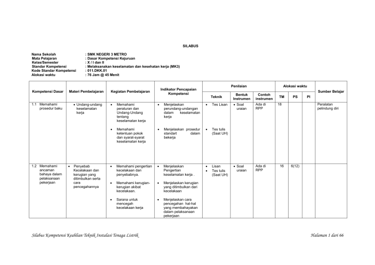 SILABUS Nama Sekolah Mata Pelajaran Kelas/Semester Standar Kompetensi Kode Standar Kompetensi Alokasi waktu Kompetensi Dasar Materi Pembelajaran Undang-undang keselamatan kerja 1.1 Memahami prosedur baku 1.2 Memahami ancaman bahaya dalam pelaksanaan pekerjaan : SMK NEGERI 3 METRO : Dasar Kompetensi Kejuruan : X / I dan II : Melaksanakan keselamatan dan kesehatan kerja (MK3) : 011.DKK.01 : 76 Jam @ 45 Menit Penyebab Kecelakaan dan kerugian yang ditimbulkan serta cara pencegahannya Penilaian Indikator Pencapaian Kompetensi Kegiatan Pembelajaran Teknik Memahami peraturan dan Undang-Undang tentang keselamatan kerja Menjelaskan perundang-undangan dalam keselamatan kerja Tes Lisan Memahami ketentuan pokok dan syarat-syarat keselamatan kerja Menjelaskan prosedur standart dalam bekerja Tes tulis (Saat UH) Memahami pengertian kecelakaan dan penyebabnya. Menjelaskan Pengertian keselamatan kerja . Lisan Tes tulis (Saat UH) Memahami kerugiankerugian akibat kecelakaan. Menjelaskan kerugian yang ditimbulkan dari kecelakaan Sarana untuk mencegah kecelakaan kerja Menjelaskan cara pencegahan hal-hal yang membahayakan dalam pelaksanaan pekerjaan Silabus Kompetensi Keahlian Teknik Instalasi Tenaga Listrik Alokasi waktu Bentuk Instrumen Contoh instrumen Soal uraian Ada di RPP Soal uraian Ada di RPP Sumber Belajar TM PS 18 16 PI Peralatan pelindung diri 6(12) Halaman 1 dari 66 Kompetensi Dasar 1.3 Melaksanakan K3 sesuai prosedur Materi Pembelajaran Alat Pelindung Diri (APD) dan Alat Pelindung Mesin Memahami macammacam Alat pelindung Diri (APD) dan penggunaannya dalam melaksanakan pekerjaan. Menjelaskan dan melaksanakan Keselamatan dan Kesehatan Kerja (K3) sesuai prosedur Memahami macammacam Alat pelindung Mesindan penggunaannya dalam melaksanakan pekerjaan Menjelaskan tentang peralatan Pelindung Diri dan Mesin. Silabus Kompetensi Keahlian Teknik Instalasi Tenaga Listrik Penilaian Indikator Pencapaian Kompetensi Kegiatan Pembelajaran Teknik T Lisan Tes tulis (Saat UH) Unjuk Kerja Alokasi waktu Bentuk Instrumen Contoh instrumen Soal uraian Job Sheet Ada di RPP Sumber Belajar TM PS 18 6(12) PI Halaman 2 dari 66 SILABUS Nama Sekolah Kelas/Semester Mata Pelajaran Standar Kompetensi Kode Alokasi Waktu Kompetensi Dasar 2.1 Memahami konsep rangkaian listrik Materi Pembelajaran Teori Dasar listrik Energi, Usaha dan Daya Hukum Dasar Listrik Macam-macam rangkai an Mengaplika-sikan Rangkaian seri, parallel dan campuran Mengaplikasikan Rangkaian jemba tan Wheat- stone Mengaplika-sikan teori superposisi, thevenin,dan Norton Mengaplika-sikan reduk-si rangkaian/ transformasi rangkaian Penilaian Indikator Pencapaian Kompetensi Kegiatan Pembelajaran 2.2 Mengaplikasi kan rangkaian listrik arus searah : SMK NEGERI 3 METRO Gresik : X / I dan II : DASAR KOMPETENSI KEJURUAN : 011.002 Mengaplikasikan Rangkaian Listrik : 011. DKK.02 : 152 Jam @ 45 menit Teknik Siswa mempelajari ma teri teori dasar kelistrikan Siswa mempelajari ma teri Energi, Usaha dan Daya Siswa mempelajari ma teri hukum dasar listrik Siswa mempelajari ma teri dasar rangkaian listrik Siswa melakukan percobaan rangkaian resis tor sederhana (seri, parallel, campuran) Memahami teori dasar kelistrikan Memahami Energi, Usaha dan Daya listrik Memahami hukum dasar listrik Siswa melakukan percobaan rangkaian jembatan Wheatstone) Siswa melakukan percobaan teori superposisi, thevenin, dan Norton Mampu mengapli kasikan teori super posisi, the- venin, dan Norton Siswa melakukan percobaan reduksi rangkaian/ transformasi rangkaian Mampu mengapli kasikan reduksi rangkaian/ transformasi rangkaian Silabus Kompetensi Keahlian Teknik Instalasi Tenaga Listrik Memahami dasar rangkaian listrik Mampu mengaplikasikan rangkaian resistor sederhana (seri, parallel, dan campuran) Mampu mengaplikasikan rangkaian jembatan Wheat-stone) Tes tulis (kuis sebelum UH) Bentuk Instrumen Soal uraian Tes interview setelah tersetruktur/praktek Job Sheet / LKS Tes tulis (kuis sebelum UH) Soal uraian Tes interview setelah tersetruktur/praktek Job Sheet / LKS Alokasi Waktu / JP Contoh Instrumen Terlampir Terlampir Sumber Belajar TM PS PI 36 - - Modul MRL Buku Ilmu Listrik untuk SMK, Dikbud 1999 LKS / Job Sheet Papan Trainner Bahan kuis Ulangan Harian` 20 24 - Modul MRL Buku Ilmu Listrik untuk SMK, Dikbud 1999 LKS / Job Sheet Papan Trainner Bahan kuis Ulangan Harian Halaman 3 dari 66 Kompetensi Dasar 2.3 Mengaplikasi kan rangkaian listrik arus bolak-balik Materi Pembelajaran Teori dasar arus bolak-balik Rangkaian arus bolak-balik 1 fase Daya dan perbaikan factor daya Impedansi majemuk Rangkaian fase banyak 2.4 Mengaplikasi kan rangkaian kemagnetan Dasar rangkaian magnet Induksi elek tromagnetik Listrik statis Listrik dinamis Siswa mempelajari materi teori dasar arus bolak-balik Siswa mempelajari dan mengaplikasikan Rangkaian arus bolakbalik 1 fase Siswa mempelajari materi Daya dan perbaikan factor daya Siswa mempelajari materi Impedansi majemuk Siswa mempelajari dan mengaplikasikan Rangkaian arus bolakbalik fase banyak Siswa mempelajari Dasar rangkaian magnet Siswa mempelajari Induksi elektromagnetik Siswa melakukan percobaan listrik satatis Siswa melakukan percobaan listrik dinamis Silabus Kompetensi Keahlian Teknik Instalasi Tenaga Listrik Penilaian Indikator Pencapaian Kompetensi Kegiatan Pembelajaran Bentuk Teknik Instrumen Tes tulis Soal (kuis sebeuraian lum UH) Memahami teori dasar arus bolak-balik Memahami dan terampil aplikasi rangkaian arus bolakbalik 1 fase Memahami Daya dan perbaikan fac tor daya Memahami Impe-dansi majemuk Memahami dan terampil aplikasi Rangkaian arus bolakbalik fase banyak Tes interview setelah tersetruktur/praktek Memahami dasar rangkaian magnet Memahami induksi elektro-magnetik Mampu aplikasi listrik statis Mampu aplikasi listrik dinamis Tes tulis (kuis sebelum UH) Tes interview setelah tersetruktur/praktek Alokasi Waktu / JP Contoh Instrumen Terlampir Sumber Belajar TM PS PI 20 28 - Modul MRL Buku Ilmu Listrik untuk SMK, Dikbud 1999 LKS / Job Sheet Papan Trainner Bahan kuis Ul