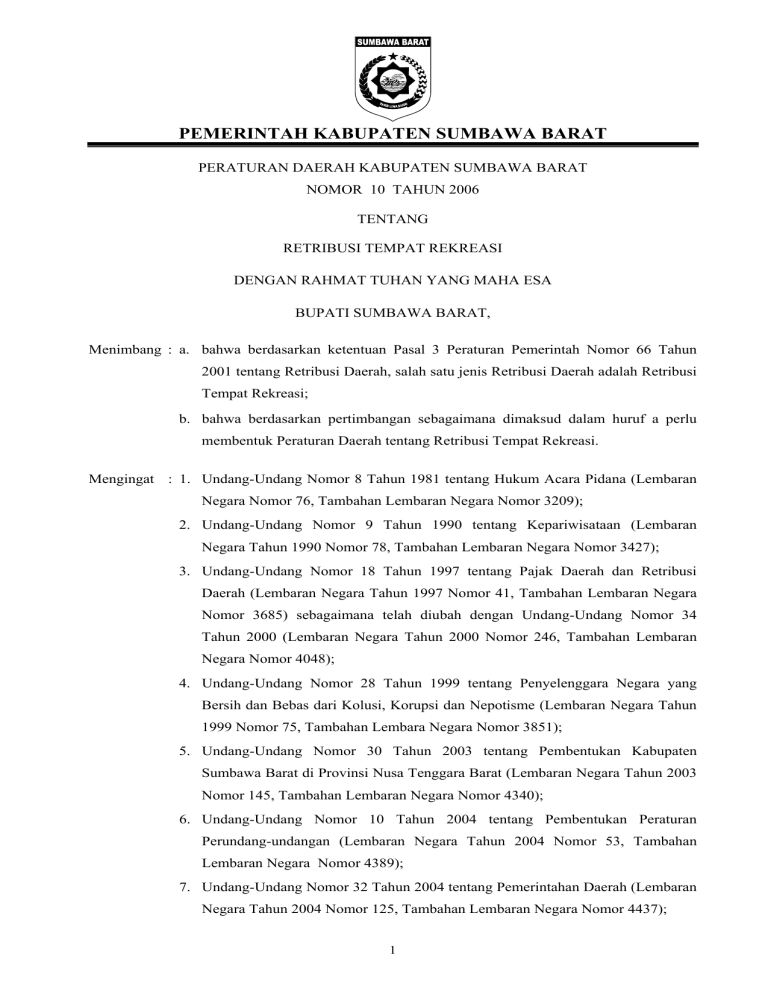 PEMERINTAH KABUPATEN SUMBAWA BARAT PERATURAN DAERAH KABUPATEN SUMBAWA BARAT NOMOR 10 TAHUN 2006 TENTANG RETRIBUSI TEMPAT REKREASI DENGAN RAHMAT TUHAN YANG MAHA ESA BUPATI SUMBAWA BARAT, Menimbang : a. bahwa berdasarkan ketentuan Pasal 3 Peraturan Pemerintah Nomor 66 Tahun 2001 tentang Retribusi Daerah, salah satu jenis Retribusi Daerah adalah Retribusi Tempat Rekreasi; b. bahwa berdasarkan pertimbangan sebagaimana dimaksud dalam huruf a perlu membentuk Peraturan Daerah tentang Retribusi Tempat Rekreasi. Mengingat : 1. Undang-Undang Nomor 8 Tahun 1981 tentang Hukum Acara Pidana (Lembaran Negara Nomor 76, Tambahan Lembaran Negara Nomor 3209); 2. Undang-Undang Nomor 9 Tahun 1990 tentang Kepariwisataan (Lembaran Negara Tahun 1990 Nomor 78, Tambahan Lembaran Negara Nomor 3427); 3. Undang-Undang Nomor 18 Tahun 1997 tentang Pajak Daerah dan Retribusi Daerah (Lembaran Negara Tahun 1997 Nomor 41, Tambahan Lembaran Negara Nomor 3685) sebagaimana telah diubah dengan Undang-Undang Nomor 34 Tahun 2000 (Lembaran Negara Tahun 2000 Nomor 246, Tambahan Lembaran Negara Nomor 4048); 4. Undang-Undang Nomor 28 Tahun 1999 tentang Penyelenggara Negara yang Bersih dan Bebas dari Kolusi, Korupsi dan Nepotisme (Lembaran Negara Tahun 1999 Nomor 75, Tambahan Lembara Negara Nomor 3851); 5. Undang-Undang Nomor 30 Tahun 2003 tentang Pembentukan Kabupaten Sumbawa Barat di Provinsi Nusa Tenggara Barat (Lembaran Negara Tahun 2003 Nomor 145, Tambahan Lembaran Negara Nomor 4340); 6. Undang-Undang Nomor 10 Tahun 2004 tentang Pembentukan Peraturan Perundang-undangan (Lembaran Negara Tahun 2004 Nomor 53, Tambahan Lembaran Negara Nomor 4389); 7. Undang-Undang Nomor 32 Tahun 2004 tentang Pemerintahan Daerah (Lembaran Negara Tahun 2004 Nomor 125, Tambahan Lembaran Negara Nomor 4437); 1 8. Undang-Undang Nomor 33 Tahun 2004 tentang Perimbangan Keuangan antara Pemerintah Pusat dan Pemerintahan Daerah (Lembaran Negara Tahun 2004 Nomor 126, Tambahan Lembaran Negara Nomor 4438); 9. Peraturan Pemerintah Nomor 27 Tahun 1983 tentang Pelaksanaan Kitab UndangUndang Hukum Acara Pidana (Lembaran Negara Tahun 1983 Nomor 36, Tambahan Lembaran Negara Nomor 3258); 10. Peraturan Pemerintah Nomor 25 Tahun 2000 tentang Kewenangan Pemerintah dan Kewenangan Provinsi sebagai Daerah Otonom (Lembaran Negara Tahun 2000 Nomor 54, Tambahan Lembaran Negara Nomor 3952); 11. Peraturan Pemerintah Nomor 105 Tahun 2000 tentang Pengelolaan dan Pertanggungjawaban Keuangan Daerah (Lembaran Negara Tahun 2000 Nomor 202, Tambahan Lembaran Negara Nomor 4022); 12. Peraturan Pemerintah Nomor 66 Tahun 2001 tentang Retribusi Daerah (Lembaran Negara Tahun 2001 Nomor 119, Tambahan Lembaran Negara Nomor 4139); Dengan Persetujuan Bersama DEWAN PERWAKILAN RAKYAT DAERAH KABUPATEN SUMBAWA BARAT dan BUPATI SUMBAWA BARAT MEMUTUSKAN : Menetapkan : PERATURAN DAERAH TENTANG RETRIBUSI TEMPAT REKREASI. BAB I KETENTUAN UMUM Pasal 1 Dalam Peraturan Daerah ini yang dimaksud dengan : 1. Daerah adalah Kabupaten Sumbawa Barat. 2. Pemerintah Daerah adalah Bupati/Wakil Bupati dan Perangkat Daerah sebagai unsur penyelenggara Pemerintahan Daerah. 3. Kepala Daerah adalah Bupati Sumbawa Barat. 4. Pejabat adalah Pegawai yang diberi tugas tertentu di bidang Retribusi Daerah sesuai dengan Peraturan Perundang-undangan yang berlaku. 5. Badan adalah sekumpulan orang dan/atau modal yang merupakan kesatuan baik yang melakukan usaha maupun yang tidak melakukan usaha yang meliputi perseroan terbatas, perseroan komanditer, perseroan lainnya, Badan Usaha Milik Negara atau Daerah dengan nama dan dalam 2 bentuk apapun, firma, kongsi, koperasi, dana pensiun, persekutuan, perkumpulan, yayasan, organisasi massa, organisasi sosial politik atau organisasi yang sejenis, lembaga, bentuk usaha tetap dan bentuk badan lainnya. 6. Tempat Rekreasi adalah tempat yang disediakan oleh Pemerintah Daerah yang dapat dikunjungi oleh umum guna dimanfaatkan untuk rekreasi, tamasya dan lain-lain kegiatan sejenis. 7. Retribusi Tempat Rekreasi adalah Retribusi yang dipungut dari pengunjung yang datang atau masuk ke tempat rekreasi. 8. Retribusi Jasa Usaha adalah retribusi atas jasa yang disediakan oleh Pemerintah Daerah dengan menganut prinsip komersial karena pada dasarnya dapat pula disediakan oleh sektor swasta. 9. Wajib Retribusi adalah orang pribadi atau badan yang menurut peraturan perundang-undangan retribusi diwajibkan untuk melakukan pembayaran retribusi, termasuk pemungut atau pemotong retribusi tertentu. 10. Masa Retribusi adalah suatu jangka waktu tertentu yang merupakan batas waktu bagi wajib retribusi untuk memanfaatkan jasa dan perizinan tertentu dari Pemerintah Daerah yang bersangkutan. 11. Surat Setoran Retribusi Daerah yang dapat disingkat SSRD adalah surat yang oleh wajib retribusi digunakan untuk melakukan pembayaran atau penyetoran retribusi yang terutang ke Kas Daerah atau ketempat pembayaran lain yang ditetapkan oleh Kepala Daerah. 12. Surat Ketetapan Retribusi Daerah yang dapat disingkat SKRD adalah surat ketetapan retribusi yang menentukan besarnya pokok retribusi. 13. Surat Ketetapan Retribusi Daerah Lebih Bayar yang dapat disingkat SKRDLB adalah surat ketetapan retribusi yang menentukan jumlah kelebihan pembayaran retribusi karena jumlah kredit retribusi lebih besar daripada retribusi yang terutang atau tidak seharusnya terutang. 14. Surat Tagihan Retribusi Daerah yang dapat disingkat STRD adalah surat untuk melakukan tagihan retribusi dan atau sanksi administrasi berupa bunga dan atau denda. 15. Pemeriksaan adalah serangkaian kegiatan untuk mencari, mengumpul, mengolah data dan atau keterangan lainnya untuk menguji kepatutan pemenuhan kewajiban retribusi daerah dan untuk tujuan lain dalam melaksanakan ketentuan peraturan perundang-undangan Retribusi Daerah. 16. Penyidikan Tindak Pidana dibidang Retribusi Daerah adalah serangkaian tindakan yang dilakukan oleh Penyidik Pegawai Negeri Sipil yang selanjutnya disebut Penyidik untuk mencari serta mengumpulkan bukti yang dengan bukti itu membuat terang tindak pidan