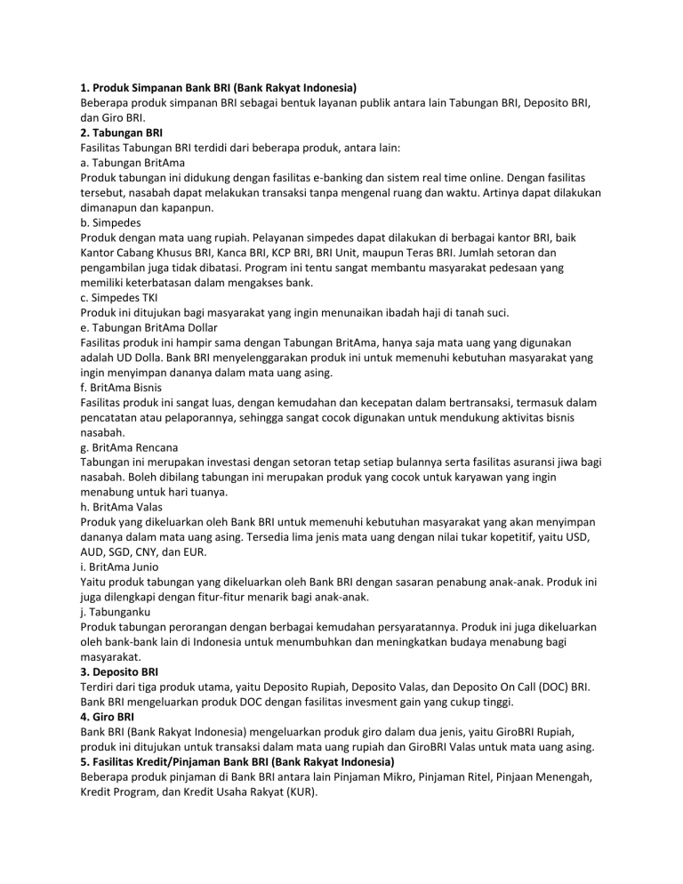 1. Produk Simpanan Bank BRI (Bank Rakyat Indonesia) Beberapa produk simpanan BRI sebagai bentuk layanan publik antara lain Tabungan BRI, Deposito BRI, dan Giro BRI. 2. Tabungan BRI Fasilitas Tabungan BRI terdidi dari beberapa produk, antara lain: a. Tabungan BritAma Produk tabungan ini didukung dengan fasilitas e-banking dan sistem real time online. Dengan fasilitas tersebut, nasabah dapat melakukan transaksi tanpa mengenal ruang dan waktu. Artinya dapat dilakukan dimanapun dan kapanpun. b. Simpedes Produk dengan mata uang rupiah. Pelayanan simpedes dapat dilakukan di berbagai kantor BRI, baik Kantor Cabang Khusus BRI, Kanca BRI, KCP BRI, BRI Unit, maupun Teras BRI. Jumlah setoran dan pengambilan juga tidak dibatasi. Program ini tentu sangat membantu masyarakat pedesaan yang memiliki keterbatasan dalam mengakses bank. c. Simpedes TKI Produk ini ditujukan bagi masyarakat yang ingin menunaikan ibadah haji di tanah suci. e. Tabungan BritAma Dollar Fasilitas produk ini hampir sama dengan Tabungan BritAma, hanya saja mata uang yang digunakan adalah UD Dolla. Bank BRI menyelenggarakan produk ini untuk memenuhi kebutuhan masyarakat yang ingin menyimpan dananya dalam mata uang asing. f. BritAma Bisnis Fasilitas produk ini sangat luas, dengan kemudahan dan kecepatan dalam bertransaksi, termasuk dalam pencatatan atau pelaporannya, sehingga sangat cocok digunakan untuk mendukung aktivitas bisnis nasabah. g. BritAma Rencana Tabungan ini merupakan investasi dengan setoran tetap setiap bulannya serta fasilitas asuransi jiwa bagi nasabah. Boleh dibilang tabungan ini merupakan produk yang cocok untuk karyawan yang ingin menabung untuk hari tuanya. h. BritAma Valas Produk yang dikeluarkan oleh Bank BRI untuk memenuhi kebutuhan masyarakat yang akan menyimpan dananya dalam mata uang asing. Tersedia lima jenis mata uang dengan nilai tukar kopetitif, yaitu USD, AUD, SGD, CNY, dan EUR. i. BritAma Junio Yaitu produk tabungan yang dikeluarkan oleh Bank BRI dengan sasaran penabung anak-anak. Produk ini juga dilengkapi dengan fitur-fitur menarik bagi anak-anak. j. Tabunganku Produk tabungan perorangan dengan berbagai kemudahan persyaratannya. Produk ini juga dikeluarkan oleh bank-bank lain di Indonesia untuk menumbuhkan dan meningkatkan budaya menabung bagi masyarakat. 3. Deposito BRI Terdiri dari tiga produk utama, yaitu Deposito Rupiah, Deposito Valas, dan Deposito On Call (DOC) BRI. Bank BRI mengeluarkan produk DOC dengan fasilitas invesment gain yang cukup tinggi. 4. Giro BRI Bank BRI (Bank Rakyat Indonesia) mengeluarkan produk giro dalam dua jenis, yaitu GiroBRI Rupiah, produk ini ditujukan untuk transaksi dalam mata uang rupiah dan GiroBRI Valas untuk mata uang asing. 5. Fasilitas Kredit/Pinjaman Bank BRI (Bank Rakyat Indonesia) Beberapa produk pinjaman di Bank BRI antara lain Pinjaman Mikro, Pinjaman Ritel, Pinjaan Menengah, Kredit Program, dan Kredit Usaha Rakyat (KUR). 6. Pinjaman Mikro BRI Produk Pinjaman Mikro yang dikeluarkan oleh Bank BRI adalah KUPEDES, yaitu fasilitas kredit dengan bunga sangat ringan yang ditujukan untuk perorangan dan dapat dilayani di BRI Unit maupun Teras BRI. 7. Pinjaman Ritel BRI Kredit Agunan Kas, yaitu produk pinjaman dengan jaminan uang kas (fully cash collateral). Kredit Investasi, yaitu fasilitas kredit jangka menengah dan jangka panjang untuk membiayai aktiva tetap perusahaan. Kredit Modal Kerja, produk yang ditawarkan kepada pelaku usaha untuk membiayai operasional perusahaan atau kegiatan usahanya. KMK Ekspor, fasilitas kredit yang ditujukan kepada nasabah yang mealakukan kegiatan usaha negosiasi wesel ekspor atau dikenal juga dengan istilah post ekspor financing. Fasilitas kredit ini juga bertujuan membiayai pembelian barang-barang untuk diekspor atau dikenal juga dengan istilah pre-ekspor financing. KMK Konstruksi BO I, yaitu fasilitas kredit yang ditujukan untuk membiayai kegiatan usaha jasa konstruksi yang pembiayaannya bersumber dari APBN. Kredit BRIGuna, fasilitas kredit yang diberikan kepada nasabah yang memiliki penghasilan tetap dalam bentuk gaji atau pensiunan. Kredit Waralaba, yaitu fasilitas kredit untuk membiayai kegiatan usaha waralaba yang diberikan dalam bentuk modal kerja maupun investasi. Kredit SPBU, yaitu fasilitas kredit yang ditujukan untuk kegiatan usaha SPBU Pertamina, baik dalam bentuk modal kerja maupun investasi. Kredit Resi Gudang, yaitu salah satu produk kredit Bank BRI dengan jaminan Resi Gudang. Kredit Kepemilikan Gudang, yaitu fasilitas kredit investasi yang ditujukan untuk pemilik bangunan gudang untuk mendukung kegiatan usahanya. KMK Talangan SPBU, fasilitas kredit ini hampir sama dengan fasilitas Kredit SPBU Kredit Batubara, fasilitas kredit yang ditujukan untuk membiayai kegiatan penambangan batubara. Kredit Waralaba Alfamart, fasilitas kredit yang ditujukan untuk membiayai kegiatan usaha minimarket alfamart. Kredit Pola Angsuran Tetap, yaitu fasilitas kredit modal kerja dan investasi dengan pola angsuran tetap dengan kriteria tertentu yang telah ditetapkan. 8. Produk Pinjaman Menengah Bank BRI Produk pinjaman ini berupa kredit Agribisnis, yaitu fasilitas kredit yang diberikan untuk kegiatan pertanian dalam arti luas, baik untuk menunjang kegiatan on-farm maupun off-farm. 9. Kredit Program Bank BRI Kredit Program Bank BRI terdiri dari tiga jenis, yaitu KPEN-RP atau Kredit Pengembangan Energi Nabati & Revitalisasi Perkebunan; KKPE-Tebu atau Kredit Ketahanan Pangan & Energi untuk tanaman tebu; dan KKPE untuk tanaman pangan, hortikulturan, peternakan, perikanan, dan pengadaan alat dan mesin. 10. KUR BRI KUR atau Kredit Usaha Rakyat yang dikeluarkan oleh Bank BRI yaitu KUR BRI dan KUR TKI BRI. PRODUK-PRODUK LAIN BANK BRI Jasa Bank Garansi Fasilitas ini merupakan bentuk jaminan yang diberikan oleh Bank BRI kepada rekanan nasabah. Rekanan nasabah atau pihak ketiga akan mendapatkan kepastian bahwa nasabah Bank BRI bersangkutan dapat memenuhi kewajibannya kepada pihak ketiga. Dalam menerbitkan Bank Garansi, Bank BRI tidak mengenakan biaya b