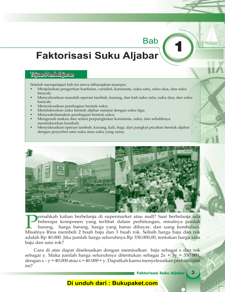 Bab Faktorisasi Suku Aljabar 1 Tujuan Pembelajaran Setelah mempelajari bab ini siswa diharapkan mampu: • Menjelaskan pengertian koeÀsien, variabel, konstanta, suku satu, suku dua, dan suku banyak; • Menyelesaikan masalah operasi tambah, kurang, dan kali suku satu, suku dua, dan suku banyak; • Menyelesaikan pembagian bentuk suku; • Memfaktorkan suku bentuk aljabar sampai dengan suku tiga; • Menyederhanakan pembagian bentuk suku; • Mengenali makna dan solusi perpangkatan konstanta, suku, dan sebaliknya memfaktorkan kembali; • Menyelesaikan operasi tambah, kurang, kali, bagi, dan pangkat pecahan bentuk aljabar dengan penyebut satu suku atau suku yang sama. P ernahkah kalian berbelanja di supermarket atau mall? Saat berbelanja ada beberapa komponen yang terlibat dalam perhitungan, misalnya jumlah barang, harga barang, harga yang harus dibayar, dan uang kembalian. Misalnya Rina membeli 2 buah baju dan 3 buah rok. Selisih harga baju dan rok adalah Rp 40.000. Jika jumlah harga seluruhnya Rp 330.000,00, tentukan harga satu baju dan satu rok? Cara di atas dapat diselesaikan dengan memisalkan baju sebagai x dan rok sebagai y. Maka jumlah harga seluruhnya ditentukan sebagai 2x + 3y = 330.000, dengan x – y = 40.000 atau x = 40.000 + y. Dapatkah kamu menyelesaikan perhitungan ini? Faktorisasi Suku Aljabar Di unduh dari : Bukupaket.com 3 Peta konsep A. Faktorisasi suku aljabar B. Menyelesaikan operasi hitung suku aljabar C. Pemfaktoran suku aljabar Faktorisasi suku aljabar D. Pecahan dalam bentuk aljabar 1. Operasi hitung penjumlahan dan pengurangan 2. Operasi hitung perkalian dan pembagian 1. Hukum distributif dan faktor persekutuan aljabar 2. Faktorisasi bentuk x2 + 2xy + y2 1. Penjumlahan dan pengurangan pecahan bentuk aljabar 2. Perkalian bentuk aljabar 3. Pembagian bentuk aljabar 4. Menyederhanakan pecahan bentuk aljabar E. Penerapan sifat operasi aljabar dalam aritmetika 4 Matematika SMP Kelas VIII Di unduh dari : Bukupaket.com A Faktorisasi Suku Aljabar Kalian K alia li tentu sudah mengenal pengertian istilah aljabar. Pada pelajaran ini kita akan mengulas kembali pengertian aljabar dan unsur-unsur penyusunnya. Pengertian aljabar secara bahasa adalah mempersatukan bagian-bagian yang terpisah. Bagian yang harus dipersatukan tersebut tentu saja unsur-unsur yang menyusun suatu bilangan aljabar. Dalam aljabar terdapat beberapa unsur penyusunnya seperti suku, faktor, suku sejenis, suku tidak sejenis, variabel, koeÀsien, dan tentu saja konstanta. Masih ingatkah kalian dengan bentuk-bentuk tersebut? Perhatikan contoh berikut ini! Contoh Perhatikan bentuk aljabar berikut! 1. 2a 2. 3ax + 5by 3. 4x2 + 7ax – 6y2 + 9 4. 3ay 5. c2 – 2ab 6. 5a2b2 – 4a2b + 32 Bagi kalian yang pernah mempelajari aljabar, kalian pasti tidak akan kesulitan menentukan variabel, koeÀsien, konstanta, dan suku-suku aljabar. Angka 1, 2, 3, 4, 5, 6, dan 7 disebut sebagai koeÀsien. Angka 9 dan 32 disebut konstanta. Sedangkan huruf a, b, c, x, dan y disebut peubah atau variabel. Perhatikan kembali contoh di atas! Dari contoh tersebut kita mengetahui bahwa setiap bentuk aljabar mempunyai banyak suku yang berbeda-beda. Contoh (1) dan (4) disebut suku tunggal karena hanya mempunyai satu suku. Contoh (2) dan (5) disebut binom karena mempunyai suku dua, sedangkan contoh (3) dan (6) disebut polinom karena mempunyai banyak suku. Dari uraian di atas dapat disimpulkan bahwa yang dimaksud dengan suku banyak adalah bentuk aljabar yang mempunyai suku lebih dari suku dua atau mempunyai suku yang peubahnya berpangkat lebih dari dua. Coba kalian sebutkan beberapa contoh suku tunggal, suku binom, dan polinom yang lain. Faktorisasi Suku Aljabar Di unduh dari : Bukupaket.com 5 Latihan Soal Tentukan koeÀsien, variabel, konstanta, dan jenis suku pada bentuk aljabar berikut ini! a. b. c. d. e. B 3p -24x + 8y 3a2 – 5b2 + 25 x2y2 – 2xy + 3x2y2 + 12 abc + 2xyz – 2abc – (-3xyz) + a2b2c2 f. g. h. i. j. 5x + 14 7x + y – 2x – y 2x2y2 + 3x2y2 + 12 11c3 + 12d2 + 12 – 2c3 16abcde Menyelesaikan Operasi Hitung Suku Aljabar Pada dasarnya operasi hitung pada suku aljabar tidak berbeda dengan operasi hitung pada bilangan bulat. Coba kalian perhatikan contoh-contoh di bawah ini, kemudian kalian ambil kesimpulan sendiri apakah terdapat perbedaan antara operasi hitung suku aljabar dengan operasi hitung bilangan bulat. Pada subbab ini kita akan sedikit mengulas tentang bentuk-bentuk operasi hitung pada bentuk aljabar. 1 Operasi Hitung Penjumlahan dan Pengurangan Operasi hitung penjumlahan dan pengurangan suku aljabar dilakukan dengan cara menjumlahkan atau mengurangkan koeÀsien antara suku-suku yang sejenis. Perhatikan contoh berikut ini! Contoh Tentukan hasil penjumlahan dan pengurangan bentuk aljabar berikut ini! a. 4x + y – 2x b. 3a2b – 5ab - 2a2b Penyelesaian: a. 4x + y – 2x = 4x - 2x + y = 2x + y b. 3a2b – 5ab - 2a2b = 3a2b - a2b - 5ab = a2b - 5ab Selain dengan cara di atas, penjumlahan dan pengurangan pada suku satu, suku dua, atau suku banyak dapat dihitung dengan cara bersusun ke bawah. Perhatikan contoh berikut ini! 6 Matematika SMP Kelas VIII Di unduh dari : Bukupaket.com Contoh Ingat!!!! Tentukan hasil penjumlahan dan pengurangan bentuk aljabar berikut ini! a. 4x + 2x b. 3a2b + 2ab2- 2a2b + 5ab2 c. 8x – 3x d. 7ab2 – 3ab - 2ab2 - 8ab Pengurangan suku sejenis merupakan penjumlahan sukusuku tersebut dengan lawannya. Penyelesaian: a. 4x 2x + 6x c. 8x 3x – 5x 3a2b + 2ab2 -2a2b + 5ab2 + a2b + 7ab2 d. 7ab2 – 3ab 2ab2 + 8ab – 5ab2 – 11ab b. Latihan Soal Selesaikan operasi hitung penjumlahan dan pengurangan berikut ini! 1. 2. 3. 4. 9. 5x + 2y – 19x + 10y 5. 5ab + 2ac – 7c + 2ab – 4ac + 3c –5x + z – 4y + 4x + 2z – y 6. 4ab + 7b – b2 – ab – 4b + 3b2 –2x + 5y – 7z + –2x – 3y – 3z 7. –3abc + 8xy + 6abc – 7xy 2 2 2 2 x y – 2y – 5xyz + 2x y – y 8. –4a2b2 + 2xy – 6a2b2 + 9xy Arman mempunyai 5 buah robot dan 8 buah mobil-mobilan. Jika Arman diberi 2 buah robot oleh ibu dan 3 mobil