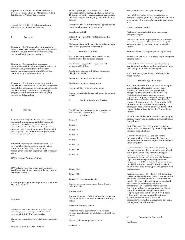 Laporan Pendahuluan Kanker Cerviks (Ca Cervix, Definisi, Etiologi, Manifestasi Klinik, Patofisiologi, Asuhan Keperawatan) Suami / pasangan seksualnya melakukan hubungan seksual pertama pada usia di bawah 18 tahun, berganti – ganti pasangan dan pernah menikah dengan wanita yang menderita kanker serviks. Posted July 14, 2011 by jfikriamrullah in Uncategorized. Leave a Comment Pemakaian DES ( dietilstilbestrol ) pada wanita hamil untuk mencegah keguguran. Pemakaian pil KB I. Pengertian Kanker serviks / kanker leher rahim adalah tumor ganas yang tumbuh di dalam leher rahim / serviks ( bagian terendah dari rahim yang menempel pada puncak vagina ). Kanker serviks merupakan gangguan pertumbuhan seluler dan merupakan kelompok penyakit yang dimanifestasikan dengan gagalnya untuk mengontrol proliferasi dan maturasi sel pada jaringan serviks. Infeksi herpes genitalis / infeksi klamiidia menahun. Secara klinis jelas merupakan tahap I Lesi telah menyebar di luar serviks hingga mengenai vagina (bukan 1/3 bagian bawah) atau area paraservikal pada salah satu sisi atau kedua sisi. Hanya perluasan vagina Perluasan paraservikal dengan atau tanpa mengenai vagina. Golongan ekonomi lemah ( kerna tidak mampu melakukan pap smear secara rutin ) Penyakit nodus limfe yang teraba tidak merata pada dinding pelvis. Urogram IV menunjukkan salah satu atau kedua ureter tersumbat oleh tumor. XII. Meluas sampai 1/3 bagian bawah vagina saja Manifestasi Klinik Keputihan yang makin lama makin berbau akibat infeksi dan nekrosis jaringan Metastase karsinoma terisolasi yang diraba pada dinding pelvis. Pendarahan yang dialami segera setelah senggama (75-80%) Bukti bahwa karsinoma mengenai kandung kemih tampak pada pemeriksaan sitoskopi atau oleh adanya fistulasi vesiko vagina. Pendarahan yang terjadi di luar senggama (Tingkat II dan III) Karsinoma menyebar keluar pelvis sejati ke organ lainnya. Pendarahan spontan saat defekasi IV. Kanker serviks biasania menyerang wanita berusia 35 – 55 tahun. 90 % dari kanker serviks berasal dari sel skuamosa yang melapisi serviks dan 10% sisanya berasal dari sel kelenjar penghasil lendir pada sluran servikal yang menuju ke dalam rahim. Anemia akibat pendarahan berulang Rasa nyeri akibat infiltrasi sel tumor ke serabut syaraf. III. II. Etiologi Kanker serviks terjadi jika sel – sel serviks menjadi abnormal dan membelah secara tak terkendali. Jika sel – sel serviks terus membelah, maka akan terbentuk suatu masa jaringan yang disebut tumor yang bisa bersifat jinak / ganas. Jika tumor tersebut ganas, maka keadaannya disebut kanker serviks. Stadium Karsinoma Serviks Klasifikasi internasional tentang karsinoma serviks uteri :Tahapan Lesi Lokasi Deskripsi Tahap 0 Tahap 1 Tahap 1A Tahap 1B Tahap II Penyebab terjadinya kelainan pada sel – sel serviks tidak diketahui secara pasti , tetapi terdapat beberapa factor resiko yang berpengaruh terhadap terjadinya kanker serviks yaitu : Tahap IIA Tahap IIB Tahap III HPV ( Human Papiloma Virus ) HPV adalah virus penyebab kutil genitalis ( kondiloma akuminata ) yang ditularkan melalui hubungan seksual. Tahap IIIA Tahap IIIB Tahap IV Karsinoma in situ Varian yang sangat berbahaya adalah HPV tipe 16, 18, 45 dan 56. Karsinoma yang hanya benar-benar berada dalam serviks Kanker vagina Merokok Patofisiologi / Pathways Pendarahan spontan pervaginaan Kanker mengenai 1/3 bagian bawah vagina atau telah meluas ke salah satu atau kedua dinding pelvis Karsinoma serviks timbul di batas antara epitel yang melapisi ektoserviks (porsio) dan endoserviks kanalis serviks yang disebut sebagai squamo-columnar junction (SCJ). Histologi antara epitel gepeng berlapis (squamous complex) dari portio dengan epitel kuboid/silindris pendek selapis bersilia dari endoserviks kanalis serviks. Pada wanita SCJ ini berada di luar ostius uteri eksternum, sedangkan pada waniya umur > 35 tahun, SCJ berada di dalam kanalis serviks. Tumor dapat tumbuh : Eksofilik mulai dari SCJ ke arah lUmen vagina sebagai masa yang mengalami infeksi sekunder dan nekrosis. Endofilik mulai dari SCJ tumbuh ke dalam stomaserviks dan cenderung untuk mengadakan infiltrasi menjadi ulkus. Ulseratif mulai dari SCJ dan cenderung merusak struktur jaringan serviks dengan melibatkan awal fornises vagina untuk menjadi ulkus yang luas. Serviks normal secara alami mengalami proses metaplasi/erosio akibat saling desak-mendesak kedua jenis epitel yang melapisi. Dengan masuknya mutagen, porsio yang erosif (metaplasia skuamosa) yang semula fisiologik dapat berubah menjadi patologik melalui tingkatan NIS I, II, III dan KIS untuk akhirnya menjadi karsinoma invasif.. Sekali menjadi mikroinvasif atau invasif, prose keganasan akan berjalan terus. Periode laten dari NIS – I s/d KIS 0 tergantung dari daya tahan tubuh penderita. Umumnya fase pra invasif berkisar antara 3 – 20 tahun (ratarata 5 – 10 tahun). Perubahan epitel displastik serviks secara kontinyu yang masih memungkinkan terjadinya regresi spontan dengan pengobatan / tanpa diobati itu dikenal dengan Unitarian Concept dari Richard. Hispatologik sebagian besar 95-97% berupa epidermoid atau squamos cell carsinoma sisanya adenokarsinoma, clearcell carcinoma/mesonephroid carcinoma dan yang paling jarang adalah sarcoma. Perluasan kandung kemih Tembakau merusak sistem kekebalan dan mempengaruhi kemampuan tubuh untuk melawan infeksi HPV pada serviks. Perluasan rectal penyebaran jauh Kanker terbatas pada lapisan epitel, tidak terdapat bukti invasi. Hubungan seksual pertama dilakukan pada usia dini Ukuran bukan merupakan kriteria Berganti – ganti pasangan seksual Makroinvasi V. Pap Smear Pemeriksaan Diagnostik Pap smear dapat mendeteksi sampai 90 % kasus kanker serviks secara akurat dan dengan biaya yang tidak terlalu mahal. ekstenterasi pelvis dimana bagian besar isi pelvis diangkat. VII. Pertahankan keadekuatan nutrisi. Penyebaran Perawatan Post Pengobatan Akibatnya angka kematian akibat kanker servikpun menurun sampai lebih dari 50 %. Setiap wanita yang telah aktif secara sek
