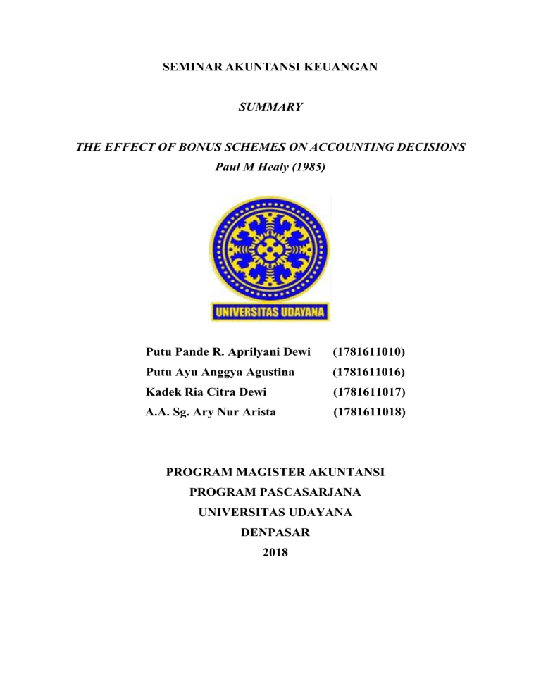 SEMINAR AKUNTANSI KEUANGAN SUMMARY THE EFFECT OF BONUS SCHEMES ON ACCOUNTING DECISIONS Paul M Healy (1985) OLEH: Putu Pande R. Aprilyani Dewi (1781611010) Putu Ayu Anggya Agustina (1781611016) Kadek Ria Citra Dewi (1781611017) A.A. Sg. Ary Nur Arista (1781611018) PROGRAM MAGISTER AKUNTANSI PROGRAM PASCASARJANA UNIVERSITAS UDAYANA DENPASAR 2018 1. Latar Belakang dan Fenomena Di era tahun 1980, fenomena skema bonus berbasis laba (earnings based) menjadi suatu hal yang menarik untuk diteliti. Fenomena ini menjelaskan bahwa skema bonus berbasis laba (earnings based) merupakan salah satu cara modern dalam memberikan penghargaan kepada eksekutif perusahaan. Hal tersebut didukung dengan pernyataan Fox (1980) yang menjelaskan bahwa di tahun 1980 terdapat 90% dari seribu perusahaan manufaktur di Amerika Serikat menggunakan rencana bonus atas dasar laba akuntansi untuk membayar manajer. Berdasarkan fenomena tersebut, maka penelitian ini meneliti tentang hubungan keputusan manajer akrual yang didalilkan atas dasar skema bonus dengan memilih prosedur akuntansi. 2. Teori yang Mendukung Penelitian terdahulu telah menguji hubungan antara keputusan manajer akrual, prosedur akuntansi, dan insentif pendapatan dengan mendalilkan eksekutif perusahaan yang atas dasar skema bonus dengan memilih prosedur akuntansi dalam meningkatkan pendapatan untuk memaksimalkan kompensasi bonus. Hasil penelitian empiris saling bertentangan sehingga timbul beberapa masalah diantaranya adalah pertama, eksekutif perusahaan mengabaikan pandangan terkait pendapatan yang diperoleh berdasarkan rencana serta penghasilan dipandang sebagai keputusan akuntansi tertentu yang tidak mempengaruhi bonus. Kedua, penelitian terdahulu mengasumsikan skema kompensasi selalu mendorong manajer untuk memilih prosedur akuntansi peningkatan pendapatan. Asumsi tersebut juga menjelaskan apabila penghasilan sangat rendah di saat ini, maka pemilihan prosedur akuntansi tidak perlu diperhatikan karena penghasilan target tidak akan mengurangi pendapatan saat ini dengan menunda pendapatan atau mempercepat penghapusan. Strategi ini dikenal sebagai 'taking a bath'. Namun, strategi ini tidak mempengaruhi penghargaan bonus saat ini dan meningkatkan kemungkinan memenuhi target laba masa depan. Manajer memiliki insentif untuk memilih akrual diskresioner. Menurut Healy (1983), aturan keputusan manajer untuk memilih diskresioner akrual ketika melaksanakan pekerjaan selama dua periode. Pilihan akrual diskresioner dalam periode pertama memperbaiki keputusan dan pada periode kedua karena akrual 2 diskresioner dibatasi hingga nol pada dua periode ini. Manajer memiliki insentif untuk memilih akrual diskresioner yang meningkatkan pendapatan. Jika laba periode pertama sebelum akrual diskresioner melebihi ambang batas pada nilai sekarang dengan kepastian keuntungan dari percepatan pendapatan dan menerima bonus dalam periode pertama lebih tinggi daripada penghargaan yang diharapkan sebelumnya dalam periode kedua. Teori yang digunakan dalam penelitian ini adalah parameter aktual dan definisi kontrak bonus. Kontrak bonus biasanya memungkinkan dana yang tidak terisi tersedia untuk penghargaan bonus di masa mendatang. Rencana juga menyediakan penangguhan penghargaan selama lima tahun, baik atas kebijaksanaan komite kompensasi atau manajer. Penelitian ini menyajikan dua jenis kategori dalam pengujian, yaitu: uji akrual dan uji perubahan dalam prosedur akuntansi. Akrual diartikan sebagai perbedaan antara laba yang dilaporkan dengan arus kas dari operasi. Uji akrual membandingkan dasar akrual yang sebenarnya untuk perusahaan dan tahun tertentu dengan tanda prediksi insentif bonus manajer yang diberikan yang menunjukkan hasil bahwa konsisten dengan teori. Uji yang menggunakan perubahan dalam prosedur akuntansi menunjukkan bahwa keputusan manajer untuk mengubah prosedur tidak terkait dengan insentif rencana bonus. Selain itu, terdapat hasil dari penelitian terdahulu yang menyatakan bahwa terdapat perubahan dalam prosedur akuntansi terkait dengan adopsi atau modifikasi atas dasar rencana rencana bonus. 3. Skema Riset dan Alat Analisis Skema dalam penelitian ini bertujuan untuk membuktikan hubungan antara pilihan terhadap keputusan akrual dengan skema bonus dan hubungan antara perubahan prosedur akuntansi dengan skema bonus. Adapun skema yang digunakan dalam penelitian ini adalah sebagai berikut: Prosedur Akuntansi Skema Bonus Akrual Manajer Gambar 1. Skema Riset 3 Rencana bonus menciptakan insentif bagi manajer untuk memilih prosedur akuntansi dan akrual untuk memaksimalkan nilai dari penghargaan bonus. Manajer lebih cenderung memilih penurunan pendapatan akrual ketika batas atas atau batas bawah rencana bonus bersifat mengikat, dan peningkatan pendapatan akrual ketika batas tidak mengikat. Artinya perusahaan yang menerapkan bonus dengan batas bawah tanpa batas atas cenderung untuk melakukan take a bath, yaitu memilih penurunan pendapatan akrual, ketika batas bawah dari rencana bonus yang bersifat mengikat daripada ketika tidak mengikat. Pada perusahaan yang menerapkan bonus dengan batas bawah dan batas atas, manajer cenderung memilih kebijakan yang bersifat income-decreasing. Adapun kerangka berpikir dalam penelitian ini adalah sebagai berikut: Kajian Teoritis 1. Skema Bonus Akuntansi 2. Rencana Bonus dan Pilihan Keputusan Akuntansi Kajian Empiris Rumusan Masalah Hipotesis Uji Analisis Hasil 1. Watts dan Zimmerman (1978) 2. Hagerman dan Zmijewski (1979) 3. Holthausen (1981) 4. Zmijewski dan Hagerman (1981) 5. Collins, Rozeff, Dhaliwal (1981) 6. Bowen, Noreen, dan Lacey (1981) Simpulan dan Saran Gambar 2. Kerangka Berpikir Penelitian 3.1 Pengumpulan dan Analisis Data Sampel dipilih berdasarkan kriteria tertentu, yaitu pertimbangan dari Fortune Directory yan memuat 250 daftar nama perusahaan terbesar di AS dan disaring menjadi 94 perusahaan sampel yang memenuhi kriteria. Data penelitian diambil dari COMPUSAT untuk tahun 1946 – 1980 dan Moody’s Industrial Manual untuk tahun awalnya.