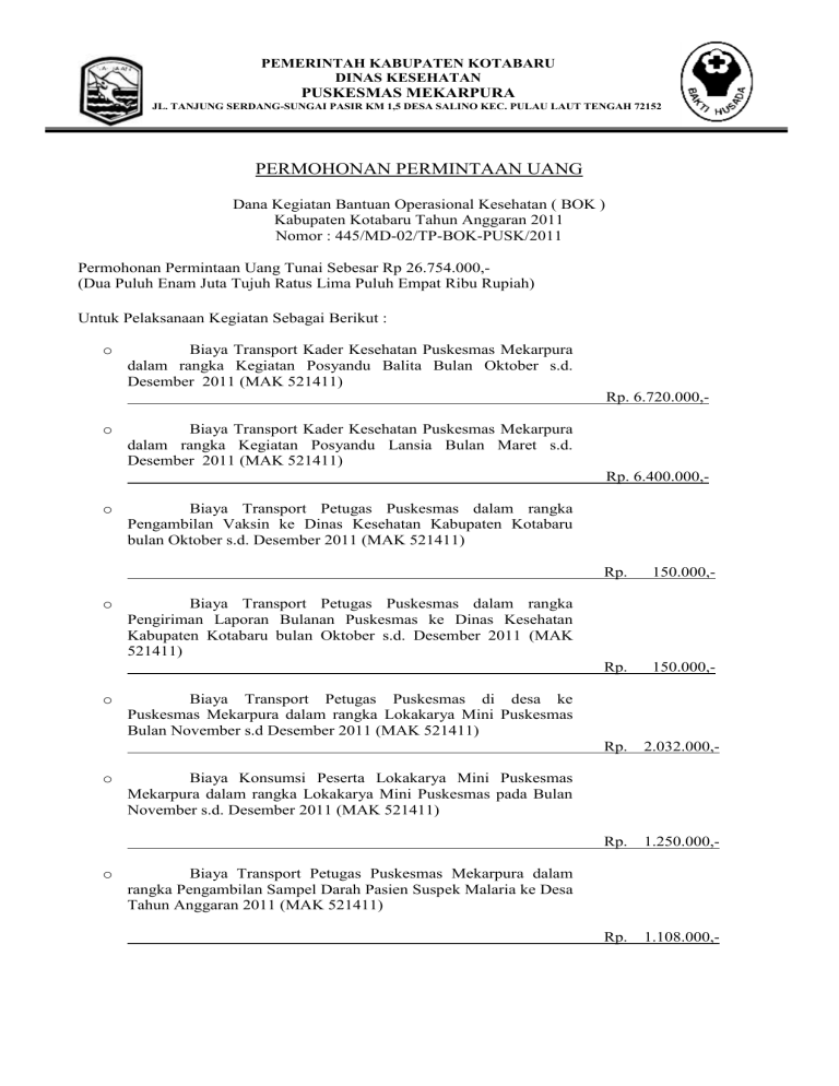 PEMERINTAH KABUPATEN KOTABARU DINAS KESEHATAN PUSKESMAS MEKARPURA JL. TANJUNG SERDANG-SUNGAI PASIR KM 1,5 DESA SALINO KEC. PULAU LAUT TENGAH 72152 PERMOHONAN PERMINTAAN UANG Dana Kegiatan Bantuan Operasional Kesehatan ( BOK ) Kabupaten Kotabaru Tahun Anggaran 2011 Nomor : 445/MD-02/TP-BOK-PUSK/2011 Permohonan Permintaan Uang Tunai Sebesar Rp 26.754.000,(Dua Puluh Enam Juta Tujuh Ratus Lima Puluh Empat Ribu Rupiah) Untuk Pelaksanaan Kegiatan Sebagai Berikut : o Biaya Transport Kader Kesehatan Puskesmas Mekarpura dalam rangka Kegiatan Posyandu Balita Bulan Oktober s.d. Desember 2011 (MAK 521411) Rp. 6.720.000,- o Biaya Transport Kader Kesehatan Puskesmas Mekarpura dalam rangka Kegiatan Posyandu Lansia Bulan Maret s.d. Desember 2011 (MAK 521411) Rp. 6.400.000,- o o o o o Biaya Transport Petugas Puskesmas dalam rangka Pengambilan Vaksin ke Dinas Kesehatan Kabupaten Kotabaru bulan Oktober s.d. Desember 2011 (MAK 521411) Rp. 150.000,- Rp. 150.000,- Rp. 2.032.000,- Rp. 1.250.000,- Rp. 1.108.000,- Biaya Transport Petugas Puskesmas dalam rangka Pengiriman Laporan Bulanan Puskesmas ke Dinas Kesehatan Kabupaten Kotabaru bulan Oktober s.d. Desember 2011 (MAK 521411) Biaya Transport Petugas Puskesmas di desa ke Puskesmas Mekarpura dalam rangka Lokakarya Mini Puskesmas Bulan November s.d Desember 2011 (MAK 521411) Biaya Konsumsi Peserta Lokakarya Mini Puskesmas Mekarpura dalam rangka Lokakarya Mini Puskesmas pada Bulan November s.d. Desember 2011 (MAK 521411) Biaya Transport Petugas Puskesmas Mekarpura dalam rangka Pengambilan Sampel Darah Pasien Suspek Malaria ke Desa Tahun Anggaran 2011 (MAK 521411) PEMERINTAH KABUPATEN KOTABARU DINAS KESEHATAN PUSKESMAS MEKARPURA JL. TANJUNG SERDANG-SUNGAI PASIR KM 1,5 DESA SALINO KEC. PULAU LAUT TENGAH 72152 o Biaya Transport Bidan Di Desa dan Kader Kesehatan Puskesmas Mekarpura dalam rangka Pendataan Jamu Gendong, Tanaman Obat Keluarga, Pengobatan Tradisional dan Pengolahan Makanan di Desa pada bulan Oktober 2011 (MAK 521411) Rp. 1.080.000,- o Biaya Transport Petugas Puskesmas Mekarpura dalam Rangka Pelaksanaan MDA Filariasis ke Desa pada bulan November 2011 (MAK 521411) Rp. 4.140.000,- o Biaya Transport Petugas Puskesmas Mekarpura dalam rangka Kunjungan Konseling Bayi atau Balita dengan BGM atau Gizi Buruk ke Desa pada Tahun Anggaran 2011 (MAK 521411) Rp. 2.964.000,- o Biaya Transport Transport Petugas Puskesmas Mekarpura dalam rangka Konseling Nifas termasuk Pelayanan Bayi Baru Lahir dan KB Pasca Persalinan bagi Bidan di Desa pada Tahun Anggaran 2011 (MAK 521411) Rp. 760.000,- JUMLAH Rp. 26.754.000,- Kotabaru, 2011 Mengetahui, Kepala Puskesmas Mekarpura Pengelola BOK Puskesmas dr. Sri Handayani Rahayu NIP. 19800603 200604 2 014 drg. Nur Hidayati NIP. 19780801 200903 2 007