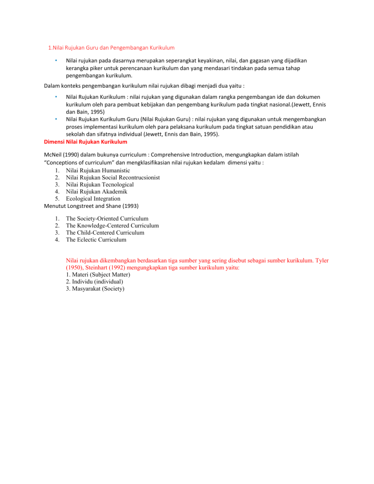 1.Nilai Rujukan Guru dan Pengembangan Kurikulum • Nilai rujukan pada dasarnya merupakan seperangkat keyakinan, nilai, dan gagasan yang dijadikan kerangka piker untuk perencanaan kurikulum dan yang mendasari tindakan pada semua tahap pengembangan kurikulum. Dalam konteks pengembangan kurikulum nilai rujukan dibagi menjadi dua yaitu : • Nilai Rujukan Kurikulum : nilai rujukan yang digunakan dalam rangka pengembangan ide dan dokumen kurikulum oleh para pembuat kebijakan dan pengembang kurikulum pada tingkat nasional.(Jewett, Ennis dan Bain, 1995) • Nilai Rujukan Kurikulum Guru (Nilai Rujukan Guru) : nilai rujukan yang digunakan untuk mengembangkan proses implementasi kurikulum oleh para pelaksana kurikulum pada tingkat satuan pendidikan atau sekolah dan sifatnya individual (Jewett, Ennis dan Bain, 1995). Dimensi Nilai Rujukan Kurikulum McNeil (1990) dalam bukunya curriculum : Comprehensive Introduction, mengungkapkan dalam istilah “Conceptions of curriculum” dan mengklasifikasian nilai rujukan kedalam dimensi yaitu : 1. Nilai Rujukan Humanistic 2. Nilai Rujukan Social Recontrucsionist 3. Nilai Rujukan Tecnological 4. Nilai Rujukan Akademik 5. Ecological Integration Menutut Longstreet and Shane (1993) 1. 2. 3. 4. The Society-Oriented Curriculum The Knowledge-Centered Curriculum The Child-Centered Curriculum The Eclectic Curriculum Nilai rujukan dikembangkan berdasarkan tiga sumber yang sering disebut sebagai sumber kurikulum. Tyler (1950), Steinhart (1992) mengungkapkan tiga sumber kurikulum yaitu: 1. Materi (Subject Matter) 2. Individu (individual) 3. Masyarakat (Society)