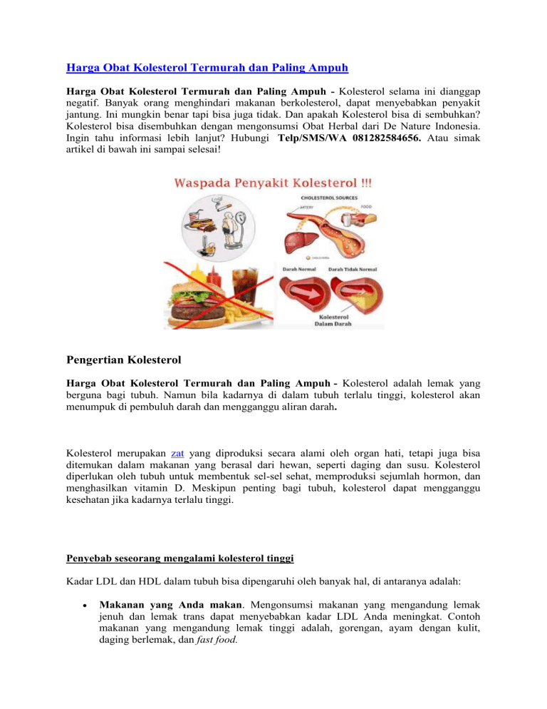 Harga Obat Kolesterol Termurah dan Paling Ampuh Harga Obat Kolesterol Termurah dan Paling Ampuh - Kolesterol selama ini dianggap negatif. Banyak orang menghindari makanan berkolesterol, dapat menyebabkan penyakit jantung. Ini mungkin benar tapi bisa juga tidak. Dan apakah Kolesterol bisa di sembuhkan? Kolesterol bisa disembuhkan dengan mengonsumsi Obat Herbal dari De Nature Indonesia. Ingin tahu informasi lebih lanjut? Hubungi Telp/SMS/WA 081282584656. Atau simak artikel di bawah ini sampai selesai! Pengertian Kolesterol Harga Obat Kolesterol Termurah dan Paling Ampuh - Kolesterol adalah lemak yang berguna bagi tubuh. Namun bila kadarnya di dalam tubuh terlalu tinggi, kolesterol akan menumpuk di pembuluh darah dan mengganggu aliran darah. Kolesterol merupakan zat yang diproduksi secara alami oleh organ hati, tetapi juga bisa ditemukan dalam makanan yang berasal dari hewan, seperti daging dan susu. Kolesterol diperlukan oleh tubuh untuk membentuk sel-sel sehat, memproduksi sejumlah hormon, dan menghasilkan vitamin D. Meskipun penting bagi tubuh, kolesterol dapat mengganggu kesehatan jika kadarnya terlalu tinggi. Penyebab seseorang mengalami kolesterol tinggi Kadar LDL dan HDL dalam tubuh bisa dipengaruhi oleh banyak hal, di antaranya adalah: Makanan yang Anda makan. Mengonsumsi makanan yang mengandung lemak jenuh dan lemak trans dapat menyebabkan kadar LDL Anda meningkat. Contoh makanan yang mengandung lemak tinggi adalah, gorengan, ayam dengan kulit, daging berlemak, dan fast food. Mempunyai berat badan berlebih. Orang yang mempunyai berat badan berlebih atau obesitas cenderung mempunyai kadar LDL yang tinggi. Usia.Semakin tua seseorang, maka semakin naik kadar LDL-nya. Hal ini mungkin dipengaruhi oleh perubahan fungsi dan metabolisme tubuh yang makin menurun. Sehingga tidak heran orang yang lanjut usia akan memiliki jumlah LDL yang lebih besar daripada orang yang lebih muda. Kadar LDL akan mulai meningkat setelah Anda memasuki usia 20 tahun. Kurang olahraga. Olahraga ternyata bisa membantu meningkatkan kadar HDL dan juga membuat LDL menjadi kurang berbahaya, dengan cara meningkatkan ukuran partikel yang membentuk LDL. Riwayat keluarga. Bila anggota keluarga Anda ada yang memiliki riwayat kolesterol tinggi, Anda mungkin akan mengalami hal yang sama. Orang kurus yang mempunyai keturunan kolesterol tinggi pun bisa jadi mempunyai kolesterol yang tinggi juga. Jadi, penyakit ini tidak hanya bisa dimiliki oleh orang gemuk saja, jangan salah. Genetik dapat mengontrol sel agar tidak menghilangkan LDL dalam darah dengan cepat atau juga dapat menyebabkan hati menghasilkan terlalu banyak LDL. Oleh karena itu, jika Anda mempunyai keturunan kolesterol tinggi, sebaiknya kontrol faktor-faktor yang bisa diubah (seperti menjaga asupan makan dan berolahraga). Gejala Kolesterol Harga Obat Kolesterol Termurah dan Paling Ampuh - Kolesterol tinggi tidak menimbulkan gejala. Akibatnya, banyak orang tidak sadar memiliki kadar kolesterol tinggi, sampai muncul komplikasi serius seperti penyakit jantung atau stroke. Oleh sebab itu, penting untuk melakukan tes darah untuk mengetahui normal atau tingginya kolesterol.Untuk orang dewasa, disarankan untuk melakukan pemeriksaan kolesterol tiap 4-6 tahun sekali, mulai usia 20 tahun. Walaupun jarang mengalami kolesterol tinggi, pemeriksaan kolesterol pada anak-anak juga disarankan pada saat anak berusia 9-11 tahun, dan diulangi pada saat berusia 17-21. Pada anak-anak dari keluarga penderita diabetes dan kolesterol tinggi, pemeriksaan kolesterol disarankan pada saat anak berusia 2-8 tahun dan diulangi pada usia 12-16 tahun. Informasi lebih lanjut hubungi Telp/SMS/WA 081282584656 Akibat Kolesterol Tinggi Kadar kolesterol yang berlebihan perlu ditangani. Apabila dibiarkan, kolesterol akan menumpuk di dinding pembuluh darah arteri dan membentuk plak, sehingga membuat arteri menyempit. Kondisi ini disebut dengan aterosklerosis. Aterosklerosis lama kelamaan dapat membuat aliran darah tersumbat, akibatnya menimbulkan sejumlah penyakit berbahaya berikut ini: Penyakit jantung koroner. Penyumbatan terjadi di pembuluh arteri jantung, sehingga otot jantung kurang mendapat nutrisi. Serangan jantung. Serangan jantung terjadi ketika aliran darah ke jantung tersumbat total. Stroke. Stroke terjadi ketika aliran darah ke otak tersumbat. Penyakit arteri perifer. Kondisi ini terjadi ketika aliran darah ke tungkai tersumbat. Obat alami kurangi kolesterol Moringa dan Habatop De Nature PAKET HERBAL KOLESTEROLKONSULTASI DAN CARA PEMESANAN HUBUNGI CUSTOMER SERVICE KAMI : TELP/WA : 081282584656 Cara mencegah atau menurunkan kadar kolesterol 1. Gaya hidup sehat sangat diperlukan dalam mengani kondisi kolesterol tinggi. 2. Mengonsumsi makanan sehat dan bergizi seimbang adalah salah satu langkahutama yang bisa dilakukan dalam mencegah atau menurunkan kadar kolesterol. 3. Kandungan lemak dalam makanan harus rendah. Cobalah ganti konsumsi makanan yang mengandung lemak jenuh dengan buah-buahan dan sayur-sayuran, serta bijibijian utuh (misalnya roti gandum utuh). 4. Dengan begitu, kadar kolesterol dalam tubuh akan tetap rendah. Selain diet sehat, 5. Segera mulai melakukan olah raga secara rutin dan turunkan berat badan bagi yang mengalami kelebihan berat badan. 6. Hindari merokok. Pertanyaan yang sering terpikirkan di benak Anda : Jika Saya terlanjur kena penyakit kolesterol, bagaimana cara mengobatinya? Bagaimana cara mengobati penyakit kolesterol dengan cepat dan tuntas? Bagaimana berobat yang mudah tanpa perlu ke dokter? Jawabannya: semua bisa, asal Anda memilih produk yang tepat, yaitu Moringa dan Habatop De Nature Pengobatan Penyakit Kolesterol Harga Obat Kolesterol Termurah dan Paling Ampuh - Pengobatan kolesterol secara tradisional yaitu dengan menggunakan Obat kolesterol dari De Nature. Produk yang terbuat dari bahan herbal alami diramu dengan resep tradisional dan diolah secara teknologi modern, sehingga aman di konsumsi. Jadi anda juga tak perlu khawatir karena Obat Herbal De Nature yang kami ta