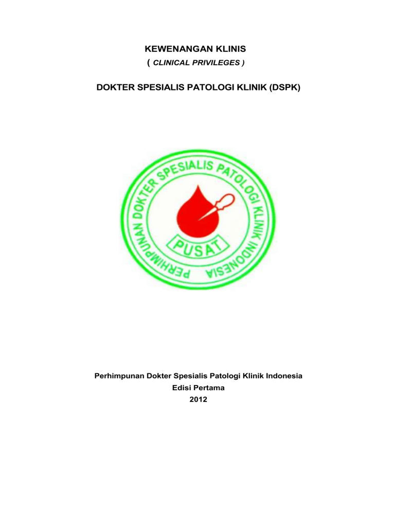 KEWENANGAN KLINIS ( CLINICAL PRIVILEGES ) DOKTER SPESIALIS PATOLOGI KLINIK (DSPK) Perhimpunan Dokter Spesialis Patologi Klinik Indonesia Edisi Pertama 2012 KATA PENGANTAR Tiap profesi kesehatan mempunyai ranah/kewenangan berdasarkan kemampuan melakukan penanganan dibidang profesi / keahlian masingmasing . Hal ini perlu dilakukan untuk menghindari konflik kewenangan .Dokter Spesialis Patologi Klinik adalah suatu profesi keahlian dari seorang dokter yang telah mendapatkan legitimasi profesi di bidangnya, sehingga dalam mengadakan kegiatannya berdasarkan kewenangan yang dimiliki oleh Dokter Spesialis Patologi Klinik. Sampai saat ini masih belum ada acuan yang secara nasional mengatur kewenangan klinis seorang Dokter Spesialis Patologi Klinik, oleh karena itu buku Kewenangan Klinis edisi Pertama ini dibuat untuk dapat digunakan sebagai pegangan. Masih banyak kekurangan dalam buku ini, sehingga diharapkan kedepan akan dapat dilengkapi dan disempurnakan sesuai kemajuan dan kebutuhan di lapangan. Jakarta, 28 Januari 2012 Tim Penyusun BAB I PENDAHULUAN A. LATAR BELAKANG Patologi Klinik adalah disiplin yang mencakup gabungan dari pengetahuan, interpretasi dan ketrampilan dalam patofisiologi, diagnostik, dan terapeutik berdasarkan pemeriksaan laboratorium. Dokter Spesialis Patologi Klinik adalah suatu profesi keahlian di bidang patologi klinik yang berwenang mengendalikan proses layanan laboratorium klinik mulai dari sisi manajemen, pemilihan pemeriksaan, pemeriksaan laboratorium (pra analitik , analitik, pasca analitik), melakukan tindakan keahlian khusus, dan interpretasi hasil. Berdasarkan hal tersebut diatas perlu kiranya diatur atau dibuat suatu kewenangan klinis yang merupakan acuan dalam melakukan kegiatan profesi dokter spesialis patologi klinik. Kewenangan klinis disusun berdasarkan standar profesi patologi klinik yang terdiri dari standar kompetensi, standar pelayanan, standar pendidikan dan kode etik. Ini sesuai dengan Permenkes nomor 755 tahun 2011 tentang Komite Medik pasal 1. Dengan makin majunya teknologi kesehatan dan makin terbukanya pola layanan kesehatan, perlu dibuat rambu-rambu yang jelas sehingga terhindar dari tindakan malpraktek profesi yang berakibat terjadi nya tuntutan hukum terhadap pelaku profesi tersebut. Penyusunan kewenangan klinis merupakan suatu kebutuhan untuk profesi dokter spesialis pada umumnya dan dokter spesialis patologi klinik pada khususnya. B. TUJUAN Tujuan umum : Buku kewenangan klinis Dokter Spesialis Patologi Klinik ini disusun sebagai acuan pelaksanaan profesi Dokter Spesialis Patologi Klinik berbasis standar profesi sebagai pengembangan serta peningkatan peran dan fungsi Dokter Spesialis Patologi Klinis dalam pelayanan kesehatan masyarakat. Tujuan khusus : Secara khusus Buku kewenangan klinis ini memberikan kejelasan kewenangan : 1. Sebagai pimpinan laboratorium klinik 2. Sebagai penanggung jawab pelayanan laboratorium klinik 3. Dalam penanganan pasien (menentukan jenis pemeriksaan, menginterpretasi hasi l laboratorium, dan memberikan rekomendasi dalam pengelolaan pasien) 4. Sebagai konsultan di bidang laboratorium klinik 5. Melakukan tindakan khusus di bidang patologi klinik C. LANDASAN HUKUM Peraturan perundang-undangan dan kebijakan yang berlaku dan terkait dengan profesi kesehatan meliputi : 1. Undang-undang Nomor 36 tahun 2009 tentang kesehatan 2. Undang-undang Nomor 29 tahun 2004, tentang praktik kedokteran 3. Permenkes No. 755 tahun 2011 tentang Komite Medik BAB II DOKTER SPESIALIS PATOLOGI KLINIK INDONESIA A.STANDAR PENDIDIKAN Dokter Spesialis Patologi Klinik adalah dokter yang memiliki kualifikasi sebagai berikut : - Lulus pendidikan dokter spesialis patologi klinik - Lulus Ujian Nasional dokter spesialis patologi klinik Kurikulum pendidikan ditetapkan oleh Kolegium Dokter Spesialis Patologi Klinik Indonesia. B. ORGANISASI PROFESI DAN PENDIDIKAN Secara profesi, Dokter Spesialis Patologi Klinik harus menjadi anggota Perhimpunan Dokter Spesialis Patologi Klinik Indonesia. Perhimpunan Dokter Spesialis Patologi Klinik Indonesia adalah organisasi profesi Dokter Spesialis Patologi Klinik yang berada dibawah Ikatan Dokter Indonesia dan berperan dalam pembinaan dan pengembangan profesi, pengawasan etika serta pengembangan pendidikan yang dilaksanakan oleh Kolegium Pendidikan Dokter Spesialis Patologi Klinik. C. STANDAR KOMPETENSI PELAYANAN Standar kompetensi pelayanan meliputi kompetensi teknis, manajerial, laboratory based patient management, ekspertise hasil laboratorium dan tindakan medis khusus. Kemampuan Dokter Spesialisasi Patologi Klinik meliputi: 1. Bidang teknis dan managerial laboratorium klinik yang meliputi total quality management pada tahap praanalitik, analitik dan pasca analitik a. Merancang suatu laboratorium sesuai kebutuhan pelayanan pasien/RS. b. Membuat perencanaan pengembangan laboratorium baik dari segi sarana, prasarana, sumber daya manusia, instrumen, metoda dan parameter, beserta penerapannya pada penanganan pasien. c. Merancang suatu sistem pemantauan mutu mulai dari tahap praanalitik, analitik sampai pasca analitik. d. Memantau pelaksanaan pemeriksaan sesuai dengan standard yang berlaku. e. Merancang suatu sistem pelayanan darah/ transfusi darah f. Melakukan pemeriksaan khusus (Pemeriksaan Morfologi Darah Tepi, Morfologi Sumsum Tulang, IT ratio dll) 2. Memberikan laboratory based patient management (konsultasi penanganan pasien berdasarkan hasi l pemeriksaan laboratorium), khususnya yang berkaitan dengan hasil pemeriksaan laboratorium a. Memberikan expertise atas hasil pemeriksaan laboratorium pasien dan pelayanan transfusi darah b. Memberikan saran pada penanganan pasien khususnya berdasarkan berdasarkan hasil pemeriksaan laboratorium dan pelayanan transfusi darah c. Menganjurkan pemeriksaan laboratorium untuk personalized medicine, deteksi dini, pencegahan, penanganan/terapi, monitoring dan prognosis d. Memberikan konsultasi kepada pasien atas hasil pemeriksaan laboratorium e. Bekerja sama dengan dokter ahli lainnya da