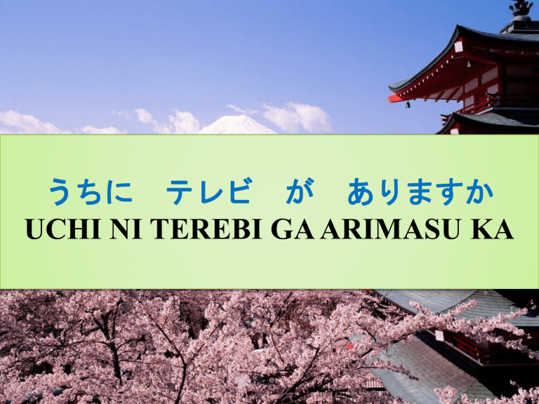 うちに テレビ が ありますか UCHI NI TEREBI GA ARIMASU KA Ruangan di rumah だいどころ Daidokoro いま Ima へや Heya Peralatan Elektronik コンピューター Konpyuutaa テレビ Terebi エアコン Eakon ラジカセ Rajikase れいぞうこ Reizouko せんぷうき Senpuuki でんわ Denwa Perabot Rumah Tangga ほんだな Hondana ソファ Sofa テーブル Teeburu ベッド Beddo POLA KALIMAT KB (Tempat) にKB(Barang)があります Pola kalimat ini digunakan untuk menyatakan benda yang ada di tempat tersebut. 1) aわたしの へやに bテレビが あります。 Watashi no heyani terebi ga arimasu. a.だいどころ Daidokoro いま Ima わたしのへや Watashi no heya b.れいぞうこ Reizouko エアコン Eakon コンピューター Konpyuutaa いま Ima ソファ Sofa KB(Tempat)にKB1(Barang)とKB2(Barang)があります Pola kalimat ini digunakan untuk menyatakan seluruh benda-benda yang ada. 1) わたしの うちに テレビとれいぞうこが あります。 watashi no uchi ni terebi to reizouko ga arimasu. せんぷうき、でんわ Senpuuki,Denwa コンピューター、テレビ Konpyuutaa,terebi エアコン、ラジカセ Eakon,Rajikase どうも ありがとうございます