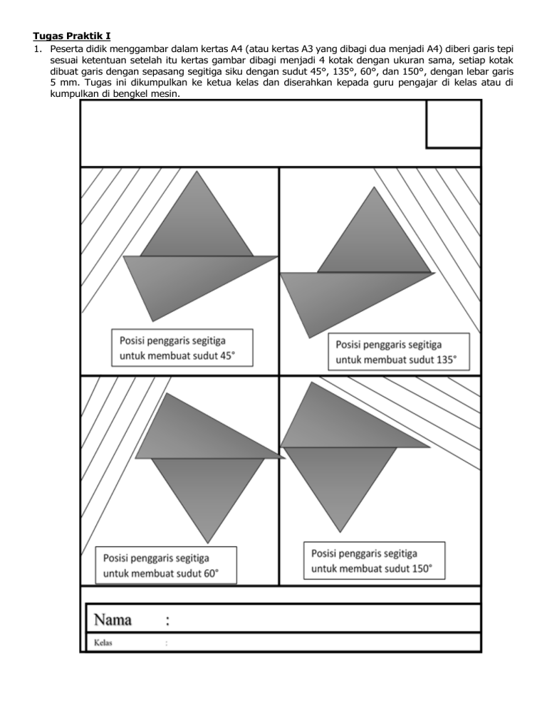 Tugas Praktik I 1. Peserta didik menggambar dalam kertas A4 (atau kertas A3 yang dibagi dua menjadi A4) diberi garis tepi sesuai ketentuan setelah itu kertas gambar dibagi menjadi 4 kotak dengan ukuran sama, setiap kotak dibuat garis dengan sepasang segitiga siku dengan sudut 45°, 135°, 60°, dan 150°, dengan lebar garis 5 mm. Tugas ini dikumpulkan ke ketua kelas dan diserahkan kepada guru pengajar di kelas atau di kumpulkan di bengkel mesin.