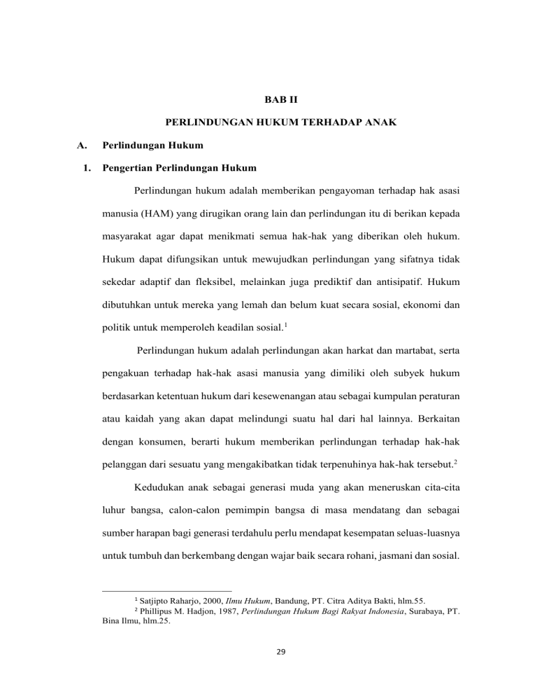 BAB II PERLINDUNGAN HUKUM TERHADAP ANAK A. 1. Perlindungan Hukum Pengertian Perlindungan Hukum Perlindungan hukum adalah memberikan pengayoman terhadap hak asasi manusia (HAM) yang dirugikan orang lain dan perlindungan itu di berikan kepada masyarakat agar dapat menikmati semua hak-hak yang diberikan oleh hukum. Hukum dapat difungsikan untuk mewujudkan perlindungan yang sifatnya tidak sekedar adaptif dan fleksibel, melainkan juga prediktif dan antisipatif. Hukum dibutuhkan untuk mereka yang lemah dan belum kuat secara sosial, ekonomi dan politik untuk memperoleh keadilan sosial.1 Perlindungan hukum adalah perlindungan akan harkat dan martabat, serta pengakuan terhadap hak-hak asasi manusia yang dimiliki oleh subyek hukum berdasarkan ketentuan hukum dari kesewenangan atau sebagai kumpulan peraturan atau kaidah yang akan dapat melindungi suatu hal dari hal lainnya. Berkaitan dengan konsumen, berarti hukum memberikan perlindungan terhadap hak-hak pelanggan dari sesuatu yang mengakibatkan tidak terpenuhinya hak-hak tersebut.2 Kedudukan anak sebagai generasi muda yang akan meneruskan cita-cita luhur bangsa, calon-calon pemimpin bangsa di masa mendatang dan sebagai sumber harapan bagi generasi terdahulu perlu mendapat kesempatan seluas-luasnya untuk tumbuh dan berkembang dengan wajar baik secara rohani, jasmani dan sosial. 1 Satjipto Raharjo, 2000, Ilmu Hukum, Bandung, PT. Citra Aditya Bakti, hlm.55. Phillipus M. Hadjon, 1987, Perlindungan Hukum Bagi Rakyat Indonesia, Surabaya, PT. Bina Ilmu, hlm.25. 2 29 30 Perlindungan hukum terhadap anak merupakan usaha dan kegiatan seluruh lapisan masyarakat dalam berbagai kedudukan dan peranan yang menyadari betul pentingnya anak bagi nusa dan bangsa di kemudian hari. Perlindungan hukum bagi anak merupakan salah satu cara untuk melindungi tunas bangsa di masa depan. Perlindungan hukum terhadap anak menyangkut semua aturan hukum yang berlaku. Perlindungan hukum ini dianggap perlu karena anak merupakan bagian masyarakat yang mempunyai keterbatasan secara fisik maupun mentalnya. Oleh karena itu, anak memerlukan perlindungan khusus.3 Perlindungan hukum dapat kita lihat sebagai suatu perlindungan yang diberikan terhadap subyek hukum dalam bentuk perangkap hukum baik preventif maupun yang bersifat represif, baik yang tertulis maupun tidak tertulis. Kata lainnya perlindungan hukum sebagai suatu gambaran dari fungsi hukum, yaitu konsep dimana hukum dapat memberikan suatu keadilan, ketertiban, kepastian dan kedamaian. Perlindungan anak sebagai usaha yang dilakukan untuk menciptakan kondisi agar setiap anak dapat melaksanakan hak dan kewajibannya demi perkembangan dan pertumbuhan anak secara wajar dan baik, baik fisik, mental dan sosial. Perlindungan anak merupakan perwujudan adanya keadilan dalam suatu masyarakat, dengan demikian perlindungan anak diusahakan dalam berbagai bidang kehidupan bernegara dan bermasyarakat. Kegiatan perlindungan anak membawa akibat hukum, baik dalam kaitannya dengan hukum tertulis maupun hukum tidak tertulis. Hukum merupakan jaminan bagi kegiatan perlindungan anak. 3 Marlina, 2009, Peradilan Anak di Indonesia, Bandung, PT. Refika Aditama. 31 2. Pengertian Perlindungan Anak Kedudukan anak sebagai generasi muda yang akan meneruskan cita-cita luhur bangsa, calon-calon pemimpin bangsa di masa mendatang dan sebagai sumber harapan bagi generasi terdahulu, perlu mendapat kesempatan seluasluasnya untuk tumbuh dan berkembang dengan wajar baik secara rohani, jasmani dan sosial. perlindungan anak merupakan usaha dan kegiatan seluruh lapisan masyarakat dalam berbagai kedudukan dan peranan, yang menyadari betul pentingnya anak bagi nusa dan bangsa di kemudian hari. Jika mereka telah matang pertumbuhan fisik maupun mental dan sosialnya, maka tiba saatnya menggantikan generasi terdahulu.4 Perlindungan anak adalah segala usaha yang dilakukan untuk menciptakan kondisi agar setiap anak dapat melaksanakan hak dan kewajibannya demi perkembangan dan pertumbuhan anak secara wajar baik fisik, mental, dan sosial. perlindungan anak merupakan perwujudan adanya keadilan dalam suatu masyarakat, dengan demikian perlindungan anak diusahakan dalam berbagai bidang kehidupan bernegara dan bermasyarakat. Kegiatan perlindungan anak membawa akibat hukum, baik dalam kaitannya dengan hukum tertulis maupun hukum tidak tertulis.5 Perlindungan anak tidak boleh dilakukan secara berlebihan dan memperhatikan dampaknya terhadap lingkungan maupun diri anak itu sendiri, sehingga usaha perlindungan yang dilakukan tidak berakibat negatif. Perlindungan anak dilaksanakan secara rasional, bertanggung jawab, dan bermanfaat. Hal itu 4 Maidin Gultom, Op.Cit., hlm. 40. Ibid. 5 32 mencerminkan suatu usaha yang efektif dan efisien. Usaha perlindungan anak tidak boleh mengakibatkan matinya inisiatif, kreativitas, ketrampilan dan hal-hal lain yang menyebabkan ketergantungan kepada orang lain dan berperilaku tak terkendali, sehingga anak tidak memilikki kemampuan dan kemauan menggunakan hak-haknya dan melaksanakan kewajiban-kewajibannya. Hukum perlindungan anak sebagai hukum (tertulis maupun tidak tertulis) harus menjamin anak benar-benar dapat melaksanakan hak dan kewajibannya. Aspek hukum perlindungan anak harus lebih dipusatkan kepada hak-hak anak yang diatur hukum dan bukan mengenai kewajiban karena mengingat secara hukum (yuridis) anak belum dibebani kewajiban. Ruang lingkup kajian mengenai perlindungan anak, secara garis besar dapat dibedakan dalam dua pengertian pokok bersifat : a. Yuridis (baik dalam ruang lingkup hukum publik maupun hukum perdata) b. Non Yuridis (bidang sosial, kesehatan, dan pendidikan).6 Berdasarkan hasil Seminar Perlindungan Anak/ Remaja yang diadakan oleh Pra Yuwana pada tahun 1977, terdapat dua perumusan tentang perlindungan anak, yaitu : a. Segala daya upaya yang dilakukan secara sadar oleh setiap orang maupun lembaga pemeritah dan swasta yang bertujuan mengusahakan pengamanan, penguasaan, dan pemenuhan kesejahteraan fisik, mental 6 hlm. 10. Irma Setyowati Soemitro