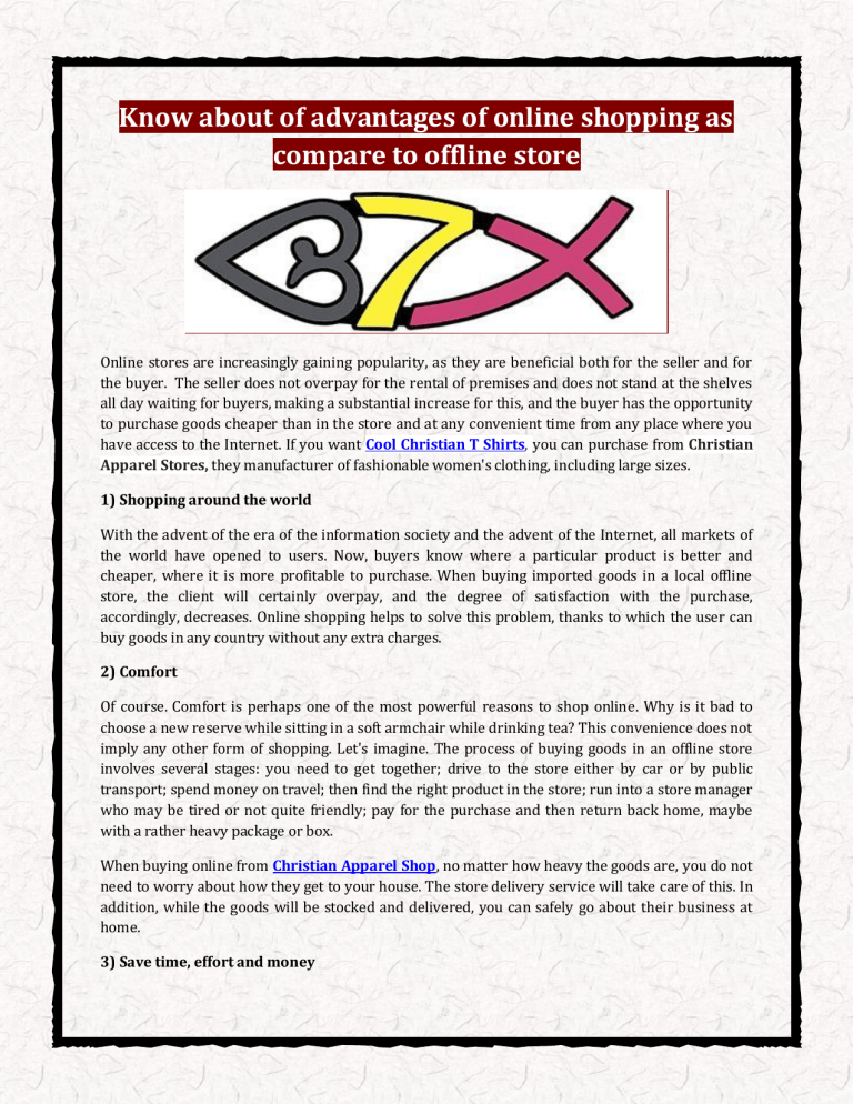 Know about of advantages of online shopping as compare to offline store Online stores are increasingly gaining popularity, as they are beneficial both for the seller and for the buyer. The seller does not overpay for the rental of premises and does not stand at the shelves all day waiting for buyers, making a substantial increase for this, and the buyer has the opportunity to purchase goods cheaper than in the store and at any convenient time from any place where you have access to the Internet. If you want Cool Christian T Shirts, you can purchase from Christian Apparel Stores, they manufacturer of fashionable women's clothing, including large sizes. 1) Shopping around the world With the advent of the era of the information society and the advent of the Internet, all markets of the world have opened to users. Now, buyers know where a particular product is better and cheaper, where it is more profitable to purchase. When buying imported goods in a local offline store, the client will certainly overpay, and the degree of satisfaction with the purchase, accordingly, decreases. Online shopping helps to solve this problem, thanks to which the user can buy goods in any country without any extra charges. 2) Comfort Of course. Comfort is perhaps one of the most powerful reasons to shop online. Why is it bad to choose a new reserve while sitting in a soft armchair while drinking tea? This convenience does not imply any other form of shopping. Let's imagine. The process of buying goods in an offline store involves several stages: you need to get together; drive to the store either by car or by public transport; spend money on travel; then find the right product in the store; run into a store manager who may be tired or not quite friendly; pay for the purchase and then return back home, maybe with a rather heavy package or box. When buying online from Christian Apparel Shop, no matter how heavy the goods are, you do not need to worry about how they get to your house. The store delivery service will take care of this. In addition, while the goods will be stocked and delivered, you can safely go about their business at home. 3) Save time, effort and money This item is closely interwoven with the previous one. Not only that, in order to make a purchase, you only need to fill out the appropriate form and exchange with the manager a couple of additional information about your order - buying online you save your time, effort and money (travel or fuel). 4) Security and warranties Online retailers in this issue are beginning to compete with offline stores, as they include in the organization of sales and concern for the safety of user data and guarantee the quality of goods. Even in developing countries, people are starting to trust online shopping, for example, in India. It is worth noting that this is one of the most attractive countries in the world for the development of electronic commerce. Online retailers issue guarantees for their goods, provide customers with confidence that the paid goods will certainly reach their addressees, and if they do not fit, they can be exchanged.