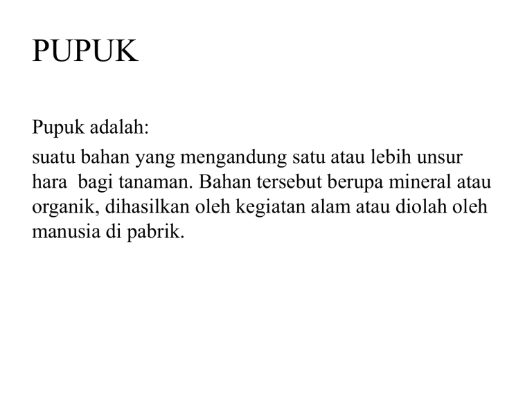 PUPUK Pupuk adalah: suatu bahan yang mengandung satu atau lebih unsur hara bagi tanaman. Bahan tersebut berupa mineral atau organik, dihasilkan oleh kegiatan alam atau diolah oleh manusia di pabrik. PUPUK Organik Alam Anorganik Buatan Kandang Hijau Guano Pabrik Kandungan Senyawa kimia N P K S Tunggal Majemuk Kategori pupuk Pupuk dapat dibedakan berdasarkan: • bahan asal, • senyawa, • fasa, • cara penggunaan, • reaksi fisiologi, • jumlah dan macam hara yang dikandungnya. Berdasarkan asalnya dibedakan: • Pupuk alam ialah pupuk yang terdapat di alam atau dibuat dengan bahan alam tanpa proses yang berarti. Misalnya: pupuk kompos, pupuk kandang, guano, pupuk hijau dan pupuk batuan P. • Pupuk buatan ialah pupuk yang dibuat oleh pabrik. Misalnya: TSP, urea, rustika dan nitrophoska. Pupuk ini dibuat oleh pabrik dengan mengubah sumber daya alam melalui proses fisika dan/atau kimia. Berdasarkan senyawanya dibedakan: • Pupuk organik ialah pupuk yang berupa senyawa organik. Kebanyakan pupuk alam tergolong pupuk organik: pupuk kandang, kompos, guano. Pupuk alam yang tidak termasuk pupuk organik misalnya rock phosphat, umumnya berasal dari batuan sejenis apatit [Ca3(PO4)2]. • Pupuk anorganik atau mineral merupakan pupuk dari senyawa anorganik. Hampir semua pupuk buatan tergolong pupuk anorganik. Berdasarkan fasa-nya dibedakan: • Padat. Pupuk padat umumnya mempunyai kelarutan yang beragam mulai yang mudah larut air sampai yang sukar larut. • Pupuk cair. Pupuk ini berupa cairan, cara penggunaannya dilarutkan dulu dengan air, Umumnya pupuk ini disemprotkan ke daun. Karena mengandung banyak hara, baik makro maupun mikro, harganya relatif mahal.. Pupuk amoniak cair merupakan pupuk cair yang kadar N nya sangat tinggi sekitar 83%, penggunaannya dapat lewat tanah (injeksikan). Berdasarkan cara penggunaannya dibedakan: • Pupuk daun ialah pupuk yang cara pemupukan dilarutkan dalam air dan disemprotkan pada permukaan daun. • Pupuk akar atau pupuk tanah ialah pupuk yang diberikan ke dalam tanah disekitar akar agar diserap oleh akar tanaman. Berdasarkan reaksi fisiologisnya dibedakan: • Pupuk yang mempunyai reaksi fisiologis masam artinya bila pupuk tersebut diberikan ke dalam tanah ada kecenderungan tanah menjadi lebih masam (pH menjadi lebih rendah). Misalnya: Za dan Urea. • Pupuk yang mempunyai reaksi fisiologis basis ialah pupuk yang bila diberikan ke dalam tanah menyebabkan pH tanah cenderung naik misalnya: pupuk chili salpeter, calnitro, kalsium sianida. Berdasarkan jumlah hara yang dikandungnya dibedakan: • Pupuk yang hanya mengandung satu hara tanaman saja. Misalnya: urea hanya mengandung hara N, TSP hanya dipentingkan P saja (sebetulnya juga mengandung Ca). • Pupuk majemuk ialah pupuk yang mengandung dua atau lebih dua hara tanaman. Contoh: NPK, amophoska, nitrophoska dan rustika. Berdasarkan macam hara tanaman dibedakan: • Pupuk makro ialah pupuk yang mengandung hanya hara makro saja: NPK, nitrophoska, gandasil. • Pupuk mikro ialah pupuk yang hanya mengandung hara mikro saja misalnya: mikrovet, mikroplek, metalik. • Campuran makro dan mikro misalnya pupuk gandasil, bayfolan, rustika. Sering juga ke dalam pupuk campur makro dan mikro ditambahkan juga zat pengatur tumbuh (hormon tumbuh). Bahan pupuk selain mengandung hara tanaman umumnya mengandung bahan lain, yaitu: • Zat pembawa atau karier (carrier). Double superfosfat (DS): zat pembawanya adalah CaSO4 dan hara tanamannya fosfor (P). • Senyawa-senyawa lain berupa kotoran (impurities) atau campuran bahan lain dalam jumlah relatif sedikit. Misalnya ZA (zwavelzuure amoniak) sering mengandung kotoran sekitar 3% berupa khlor, asam bebas (H2SO4) dan sebagainya. • Bahan mantel (coated) ialah bahan yang melapisi pupuk dengan maksud agar pupuk mempunyai nilai lebih baik misalnya kelarutannya berkurang, nilai higroskopisnya menjadi lebih rendah dan mungkin agar lebih menarik. Bahan yang digunakan untuk selaput berupa aspal, lilin, malam, wax dan sebagainya. Pupuk yang bermantel harganya lebih mahal dibandingkan tanpa mantel. • Filler (pengisi). Pupuk majemuk atau pupuk campur yang kadarnya tinggi sering diberi filler agar ratio fertilizer nya dapat tepat sesuai dengan yang diinginkan, juga dengan maksud agar mudah disebar lebih merata Hukum-Hukum Pemupukan 1. Growth Response Curves Liebig (c. 1860, German) (linear) Y = mX + b, where: Y = yield; m = slope – i.e. rate of yield increase, a function of the environment and nutrient; X = amount of nutrient added; b = minimum yield, one would get this yield with no nutrient additions. 2. Mitscherlich (c. 1910, German) (Law of Diminishing Returns) (1) dy/dx = (A-Y)C. if integrate equation (1), then get (2) log (A-Y) = log(A) – cX, where: • A = maximum possible yield (theoretical); Y = actual yield. • dy/dx = slope – i.e. rate of yield increase, a function of the environment, the nutrient, and amount of nutrient already present. This value gets smaller as nutrient amount increases. • x = amount of nutrient added; c = constant. 3. Bray (c. 1920, U. Illinois) (soil interactions) Started with Mitscherlich’s basic equation, developed: log (A-Y) = log(A) – c1B – cX,where: A = maximum possible yield (theoretical); Y = actual yield. dy/dx = slope – i.e. rate of yield increase. It is a function of the environment, the nutrient, and amount of nutrient already present. This value gets smaller as nutrient amount increases. X = amount of nutrient added; c1 = constant that is for B; c = constant. B = value explaining behavior of ‘immobile’ nutrients (e.g. K, P, Ca, Mg). The c1B term takes into account the reality that nutrients interact with soil and not all nutrients behave identically. 4. Baule (c. 1920, German mathematician, worked with Mitscherlich) (nutrient interactions) Baule developed idea of “half-way points.” Using the identical relationship as Mitscherlich, Baule concluded that: Y = A – A(1/2) # Baule Units, where: A = maximum possible yield (th