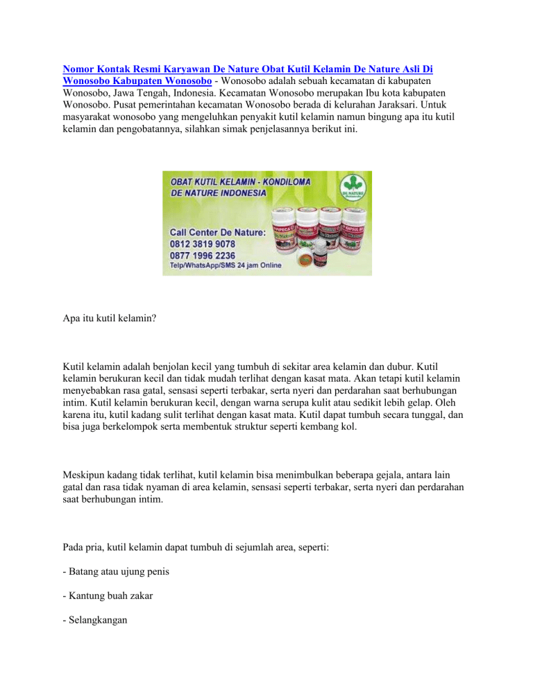 Nomor Kontak Resmi Karyawan De Nature Obat Kutil Kelamin De Nature Asli Di Wonosobo Kabupaten Wonosobo - Wonosobo adalah sebuah kecamatan di kabupaten Wonosobo, Jawa Tengah, Indonesia. Kecamatan Wonosobo merupakan Ibu kota kabupaten Wonosobo. Pusat pemerintahan kecamatan Wonosobo berada di kelurahan Jaraksari. Untuk masyarakat wonosobo yang mengeluhkan penyakit kutil kelamin namun bingung apa itu kutil kelamin dan pengobatannya, silahkan simak penjelasannya berikut ini. Apa itu kutil kelamin? Kutil kelamin adalah benjolan kecil yang tumbuh di sekitar area kelamin dan dubur. Kutil kelamin berukuran kecil dan tidak mudah terlihat dengan kasat mata. Akan tetapi kutil kelamin menyebabkan rasa gatal, sensasi seperti terbakar, serta nyeri dan perdarahan saat berhubungan intim. Kutil kelamin berukuran kecil, dengan warna serupa kulit atau sedikit lebih gelap. Oleh karena itu, kutil kadang sulit terlihat dengan kasat mata. Kutil dapat tumbuh secara tunggal, dan bisa juga berkelompok serta membentuk struktur seperti kembang kol. Meskipun kadang tidak terlihat, kutil kelamin bisa menimbulkan beberapa gejala, antara lain gatal dan rasa tidak nyaman di area kelamin, sensasi seperti terbakar, serta nyeri dan perdarahan saat berhubungan intim. Pada pria, kutil kelamin dapat tumbuh di sejumlah area, seperti: - Batang atau ujung penis - Kantung buah zakar - Selangkangan - Paha bagian atas - Sekitar atau di dalam anus. Sedangkan pada wanita, kutil kelamin dapat tumbuh di: - Dinding vagina - Vulva (bagian luar vagina) - Daerah antara vagina dan anus (perineum) - Di dalam vagina atau di dalam anus - Leher rahim. Selain pada kelamin dan area di sekitarnya, kutil kelamin juga dapat tumbuh di lidah, bibir, mulut, dan tenggorokan. Kondisi ini biasanya terjadi akibat melakukan seks oral dengan orang yang terinfeksi kutil kelamin. Nomor Kontak Resmi Karyawan De Nature Obat Kutil Kelamin De Nature Asli Di Wonosobo Kabupaten Wonosobo Kami yakin ini menjadi kabar baik bagi anda yang saat ini berada di Wonosobo. Karena produk herbal De Nature, salah satunya Paket Obat Kutil Kelamin/Kondiloma/Jengger Ayam bisa anda dapatkan dengan mudah dan cepat. Obat De Nature dipasarkan secara online dan dikirimkan sampai alamat/tujuan. Pengiriman Herbal De Nature hanya 1 pintu yaitu dari Kantor Pusat De Nature (Majenang Cilacap Jawa Tengah). Kebijakan ini diambil untuk menjaga keaslian produk. Kontak Resmi Agen Denature Asli Obat Kutil Kelamin / Jengger Ayam,silahkan hubungi 08123819-9078 atau 0877-1996-2236.