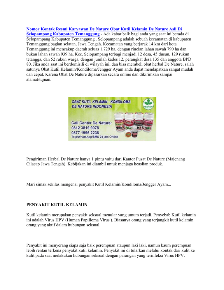 Nomor Kontak Resmi Karyawan De Nature Obat Kutil Kelamin De Nature Asli Di Selopampang Kabupaten Temanggung - Ada kabar baik bagi anda yang saat ini berada di Selopampang Kabupaten Temanggung . Selopampang adalah sebuah kecamatan di kabupaten Temanggung bagian selatan, Jawa Tengah. Kecamatan yang berjarak 14 km dari kota Temanggung ini mencakup daerah seluas 1.729 ha, dengan rincian lahan sawah 790 ha dan bukan lahan sawah 939 ha. Kec. Selopampang terbagi menjadi 12 desa, 45 dusun, 129 rukun tetangga, dan 52 rukun warga, dengan jumlah kades 12, perangkat desa 135 dan anggota BPD 80. Jika anda saat ini berdomisili di wilayah ini, dan bisa membeli obat herbal De Nature, salah satunya Obat Kutil Kelamin/Kondiloma/Jengger Ayam anda dapat mendapatkan sangat mudah dan cepat. Karena Obat De Nature dipasarkan secara online dan dikirimkan sampai alamat/tujuan. Pengiriman Herbal De Nature hanya 1 pintu yaitu dari Kantor Pusat De Nature (Majenang Cilacap Jawa Tengah). Kebijakan ini diambil untuk menjaga keaslian produk. Mari simak sekilas mengenai penyakit Kutil Kelamin/Kondiloma/Jengger Ayam... PENYAKIT KUTIL KELAMIN Kutil kelamin merupakan penyakit seksual menular yang umum terjadi. Penyebab Kutil kelamin ini adalah Virus HPV (Human Papilloma Virus ). Biasanya orang yang terjangkit kutil kelamin orang yang aktif dalam hubungan seksual. Penyakit ini menyerang siapa saja baik perempuan ataupun laki laki, namun kaum perempuan lebih rentan terkena penyakit kutil kelamin. Penyakit ini di tularkan melalui kontak dari kulit ke kulit pada saat melakukan hubungan seksual dengan pasangan yang terinfeksi Virus HPV. GEJALA DAN LETAK KUTIL Kutil di kelamin berukuran kecil, dengan warna mirip kulit atau lebih gelap. Oleh sebab itu, kutil kadang sulit terlihat dengan kasat mata. Kutil ini bisa tumbuh secara tunggal, dan bisa juga berkelompok (mirip kembang kol). Nomor Kontak Resmi Karyawan De Nature Obat Kutil Kelamin De Nature Asli Di Selopampang Kabupaten Temanggung Walaupun kadang tidak terlihat, kutil kelamin tetap bisa menimbulkan gejala, gatal dan rasa tidak nyaman di area kelamin, sensasi seperti panas terbakar, nyeri serta pendarahan saat berhubungan. Kutil kelamin pada pria dapat tumbuh di area: - Batang/ujung penis - Kantung buah zakar - Selangkangan - Paha bagian atas - Sekitar/di dalam anus Pada wanita, kutil kelamin dapat tumbuh di: - Dinding vagina - Vulva/luar vagina - Daerah antara vagina dan anus - Di dalam vagina/di dalam anus - Leher rahim PENGOBATAN KUTIL KELAMIN Informasi untuk kenyamanan anda, bahwa Produk dari perusahaan kami ini sudah memiliki: - Bersertifikat ISO 9001:2015 - Ijin Resmi Perusahaan dari Kementerian Kesehatan - Ijin BPOM, yang artinya sudah lulus Uji Stabilitas Produk - Sertifikat Halal MUI, sehingga kehalalannya bisa dipertanggung jawabkan - Apoteker Yang berpengalaman - Sudah melewati Proses Sortir Bahan Baku, Guna Menjaga Mutu Produk - Proses Produksi Sesuai Alur CPOTB (Cara Pembuatan Obat Tradisional Yang Baik Dan Benar) Informasi lebih lanjut mengenai Obat Kutil Kelamin De Nature ini, baik harga, cara pemesanan, cara pengiriman atau hal lainnya, silahkan hubungi kami di nomor kontak De Nature: 08123819-9078 atau 0877-1996-2236. Terima kasih atas perhatian dan kunjungannya, semoga artikel ini dapat memberikan informasi yang anda perlukan.