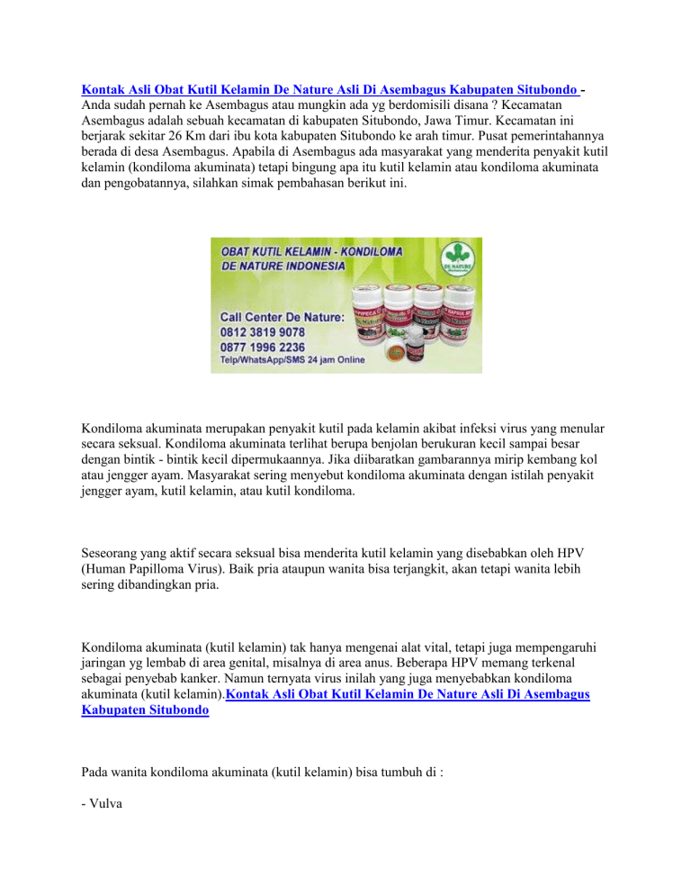 Kontak Asli Obat Kutil Kelamin De Nature Asli Di Asembagus Kabupaten Situbondo Anda sudah pernah ke Asembagus atau mungkin ada yg berdomisili disana ? Kecamatan Asembagus adalah sebuah kecamatan di kabupaten Situbondo, Jawa Timur. Kecamatan ini berjarak sekitar 26 Km dari ibu kota kabupaten Situbondo ke arah timur. Pusat pemerintahannya berada di desa Asembagus. Apabila di Asembagus ada masyarakat yang menderita penyakit kutil kelamin (kondiloma akuminata) tetapi bingung apa itu kutil kelamin atau kondiloma akuminata dan pengobatannya, silahkan simak pembahasan berikut ini. Kondiloma akuminata merupakan penyakit kutil pada kelamin akibat infeksi virus yang menular secara seksual. Kondiloma akuminata terlihat berupa benjolan berukuran kecil sampai besar dengan bintik - bintik kecil dipermukaannya. Jika diibaratkan gambarannya mirip kembang kol atau jengger ayam. Masyarakat sering menyebut kondiloma akuminata dengan istilah penyakit jengger ayam, kutil kelamin, atau kutil kondiloma. Seseorang yang aktif secara seksual bisa menderita kutil kelamin yang disebabkan oleh HPV (Human Papilloma Virus). Baik pria ataupun wanita bisa terjangkit, akan tetapi wanita lebih sering dibandingkan pria. Kondiloma akuminata (kutil kelamin) tak hanya mengenai alat vital, tetapi juga mempengaruhi jaringan yg lembab di area genital, misalnya di area anus. Beberapa HPV memang terkenal sebagai penyebab kanker. Namun ternyata virus inilah yang juga menyebabkan kondiloma akuminata (kutil kelamin).Kontak Asli Obat Kutil Kelamin De Nature Asli Di Asembagus Kabupaten Situbondo Pada wanita kondiloma akuminata (kutil kelamin) bisa tumbuh di : - Vulva - Dinding vagina - Area genital eksternal dan anus - Lubang anus - Serviks (leher rahim). Sedangkan pada laki - laki, bisa terjadi pada : - Ujung penis - Skrotum (kantung buah zakar) - Anus. Ciri-ciri dan gejala kondiloma akuminata antara lain: - Benjolan warna keabuan atau sewarna dengan kulit, kecil di area genital. - Beberapa kutil tumbuh berdekatan sehingga berbentuk menyerupai kembang kol. - Gatal atau rasa tak nyaman di area genital. - Perdarahan saat berhubungan seksual. OBAT KUTIL KELAMIN Produk dari perusahaan kami ini sudah memiliki: - Bersertifikat ISO 9001:2015 - Ijin Resmi Perusahaan dari Kementerian Kesehatan - Ijin BPOM, yang artinya sudah lulus Uji Stabilitas Produk - Sertifikat Halal MUI, sehingga kehalalannya bisa dipertanggung jawabkan - Apoteker Yang berpengalaman - Sudah melewati Proses Sortir Bahan Baku, Guna Menjaga Mutu Produk - Proses Produksi Sesuai Alur CPOTB (Cara Pembuatan Obat Tradisional Yang Baik Dan Benar) Cara Pemesanan dan Informasi Obat Kutil Kelamin atau Kondiloma Akuminata silahkan hubungi kami di nomor kontak resmi Agen De Nature: 0812-3819-9078 atau 0877-1996-2236.