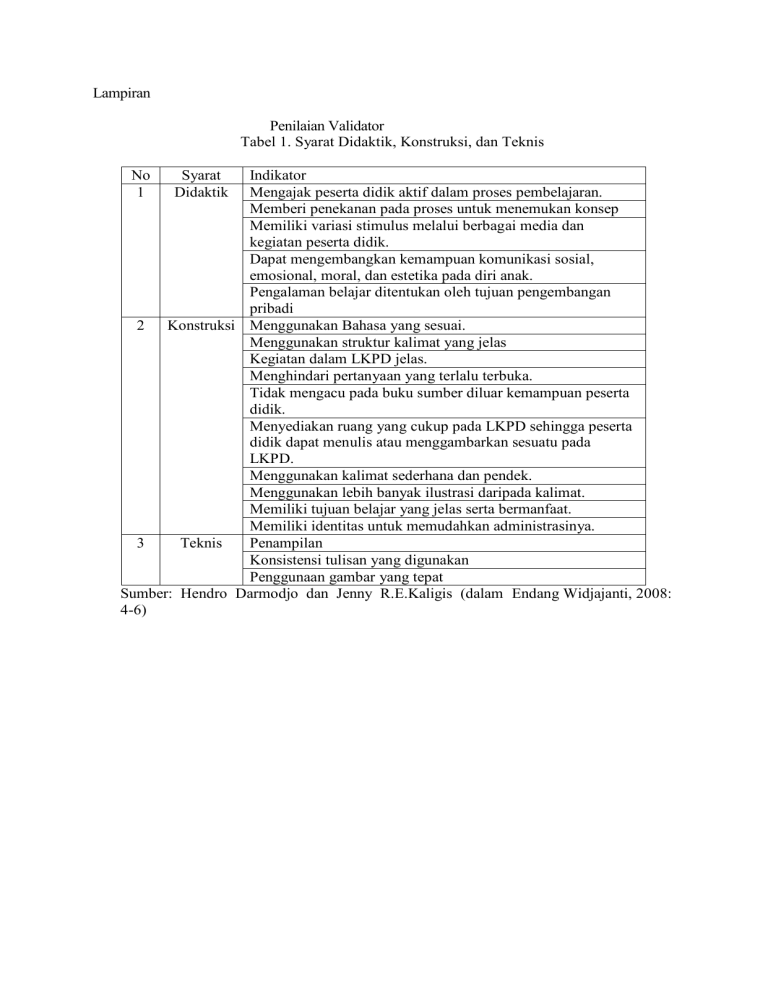 Lampiran Penilaian Validator Tabel 1. Syarat Didaktik, Konstruksi, dan Teknis No 1 Syarat Didaktik Indikator Mengajak peserta didik aktif dalam proses pembelajaran. Memberi penekanan pada proses untuk menemukan konsep Memiliki variasi stimulus melalui berbagai media dan kegiatan peserta didik. Dapat mengembangkan kemampuan komunikasi sosial, emosional, moral, dan estetika pada diri anak. Pengalaman belajar ditentukan oleh tujuan pengembangan pribadi 2 Konstruksi Menggunakan Bahasa yang sesuai. Menggunakan struktur kalimat yang jelas Kegiatan dalam LKPD jelas. Menghindari pertanyaan yang terlalu terbuka. Tidak mengacu pada buku sumber diluar kemampuan peserta didik. Menyediakan ruang yang cukup pada LKPD sehingga peserta didik dapat menulis atau menggambarkan sesuatu pada LKPD. Menggunakan kalimat sederhana dan pendek. Menggunakan lebih banyak ilustrasi daripada kalimat. Memiliki tujuan belajar yang jelas serta bermanfaat. Memiliki identitas untuk memudahkan administrasinya. 3 Teknis Penampilan Konsistensi tulisan yang digunakan Penggunaan gambar yang tepat Sumber: Hendro Darmodjo dan Jenny R.E.Kaligis (dalam Endang Widjajanti, 2008: 4-6) Tabel 2. Indikator Kelayakan LKPD No 1 Aspek Indikator Kelayakan isi Materi yang disajikan sudah sesuai dengan Kompetensi Inti dan Kompetensi Dasar Setiap kegiatan yang disajikan mempunyai tujuan pembelajaran yang jelas Keakuratan fakta dalam penyajian materi Kebenaran konsep dalam penyajian materi Keakuratan teori dalam penyajian materi Keakuratan prosedur/metode dalam penyajian materi Keberadaan usur yang mampu menanamkan nilai 2 Kebahasaan Keinteraktifan komunikasi Ketepatan struktur kalimat Keterbakuan istilah yang digunakan Ketepatan tata bahasa sesuai dengan kaidah Bahasa Indonesia Ketepatan ejaan sesuai dengan kaidah Bahasa Indonesia Konsistensi penulisan nama ilmiah/asing 3 Penyajian Kesesuaian teknik penyajian materi dengan sintaks model pembelajaran Keruntutan konsep Penyertaan rujukan/sumber acuan dalam penyajian teks, tabel, gambar, dan lampiran Kelengkapan identitas tabel, gambar, dan lampiran Ketepatan penomoran dan penamaan tabel, gambar, dan lampiran 4 Kegrafikan Tipografi huruf yang digunakan memudahkan pemahaman, membaca, dan menarik Desain penampilan, warna, pusat pandang, komposisi, dan ukuran unsur tata letak harmonis dan memperjelas fungsi Ilustrasi mampu memperjelas dan mempermudah pemahaman Sumber: BSNP, 2012 Aspek Penilaian No Komponen 1 Kesesuaian dengan syarat didaktik atau isi/materi Aspek Kesesuaian dengan SK dan KD SMP/ MTs Kebenaran konsep Penyajian menuntut peserta didik belajar aktif Penekanan pada model Learning Cycle 7E Penekanan pada aspek scientific literacy 2 Aspek Penggunaan Bahasa yang tepat konstruksi Penggunaan kalimat yang tepat Pertanyaan dalam LKPD Kegiatan/percobaan dalam LKPD LKPD menyediakan ruang untuk peserta didik menuliskan hasil kegiatan/percobaan Memiliki tujuan belajar yang jelas Mempunyai identitas peserta didik dalam LKPD untuk memudahkan administrasinya 3 Kesesuaian Penampilan LKPD dengan syarat Konsistensi tulisan yang digunakan teknis Penggunaan gambar yang tepat Sumber: Diadaptasi dan dimodifikasi dari sumber BSNP (2012) dan Hendro Darmodjo dan Jenny R.E.Kaligis (dalam Endang Widjajanti, 2008: 4-6)