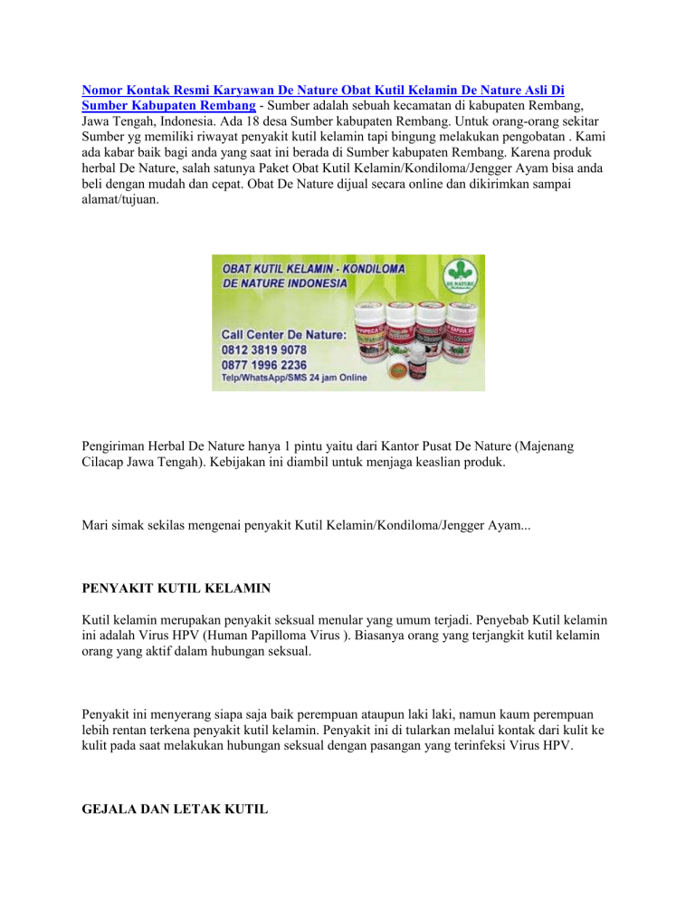 Nomor Kontak Resmi Karyawan De Nature Obat Kutil Kelamin De Nature Asli Di Sumber Kabupaten Rembang - Sumber adalah sebuah kecamatan di kabupaten Rembang, Jawa Tengah, Indonesia. Ada 18 desa Sumber kabupaten Rembang. Untuk orang-orang sekitar Sumber yg memiliki riwayat penyakit kutil kelamin tapi bingung melakukan pengobatan . Kami ada kabar baik bagi anda yang saat ini berada di Sumber kabupaten Rembang. Karena produk herbal De Nature, salah satunya Paket Obat Kutil Kelamin/Kondiloma/Jengger Ayam bisa anda beli dengan mudah dan cepat. Obat De Nature dijual secara online dan dikirimkan sampai alamat/tujuan. Pengiriman Herbal De Nature hanya 1 pintu yaitu dari Kantor Pusat De Nature (Majenang Cilacap Jawa Tengah). Kebijakan ini diambil untuk menjaga keaslian produk. Mari simak sekilas mengenai penyakit Kutil Kelamin/Kondiloma/Jengger Ayam... PENYAKIT KUTIL KELAMIN Kutil kelamin merupakan penyakit seksual menular yang umum terjadi. Penyebab Kutil kelamin ini adalah Virus HPV (Human Papilloma Virus ). Biasanya orang yang terjangkit kutil kelamin orang yang aktif dalam hubungan seksual. Penyakit ini menyerang siapa saja baik perempuan ataupun laki laki, namun kaum perempuan lebih rentan terkena penyakit kutil kelamin. Penyakit ini di tularkan melalui kontak dari kulit ke kulit pada saat melakukan hubungan seksual dengan pasangan yang terinfeksi Virus HPV. GEJALA DAN LETAK KUTIL Kutil di kelamin berukuran kecil, dengan warna mirip kulit atau lebih gelap. Oleh sebab itu, kutil kadang sulit terlihat dengan kasat mata. Kutil ini bisa tumbuh secara tunggal, dan bisa juga berkelompok (mirip kembang kol). Nomor Kontak Resmi Karyawan De Nature Obat Kutil Kelamin De Nature Asli Di Sumber Kabupaten Rembang Walaupun kadang tidak terlihat, kutil kelamin tetap bisa menimbulkan gejala, gatal dan rasa tidak nyaman di area kelamin, sensasi seperti panas terbakar, nyeri serta pendarahan saat berhubungan. Kutil kelamin pada pria dapat tumbuh di area: - Batang/ujung penis - Kantung buah zakar - Selangkangan - Paha bagian atas - Sekitar/di dalam anus Pada wanita, kutil kelamin dapat tumbuh di: - Dinding vagina - Vulva/luar vagina - Daerah antara vagina dan anus - Di dalam vagina/di dalam anus - Leher rahim PENGOBATAN KUTIL KELAMIN Informasi untuk kenyamanan anda, bahwa Produk dari perusahaan kami ini sudah memiliki: - Bersertifikat ISO 9001:2015 - Ijin Resmi Perusahaan dari Kementerian Kesehatan - Ijin BPOM, yang artinya sudah lulus Uji Stabilitas Produk - Sertifikat Halal MUI, sehingga kehalalannya bisa dipertanggung jawabkan - Apoteker Yang berpengalaman - Sudah melewati Proses Sortir Bahan Baku, Guna Menjaga Mutu Produk - Proses Produksi Sesuai Alur CPOTB (Cara Pembuatan Obat Tradisional Yang Baik Dan Benar) Informasi lebih lanjut mengenai Obat Kutil Kelamin De Nature ini, baik harga, cara pemesanan, cara pengiriman atau hal lainnya, silahkan hubungi kami di nomor kontak De Nature: 08123819-9078 atau 0877-1996-2236. Terima kasih atas perhatian dan kunjungannya, semoga artikel ini dapat memberikan informasi yang anda perlukan.