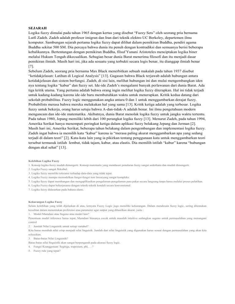 SEJARAH Logika fuzzy dimulai pada tahun 1965 dengan kertas yang disebut “Fuzzy Sets” oleh seorang pria bernama Lutfi Zadeh. Zadeh adalah profesor imigran dan Iran dari teknik elektro UC Berkeley, departemen ilmu komputer. Sambungan sejarah pertama logika fuzzy dapat dilihat dalam pemikiran Buddha, pendiri agama Buddha sekitar 500 SM. Dia percaya bahwa dunia itu penuh dengan kontradiksi dan semuanya berisi beberapa kebalikannya. Bertentangan dengan pemikiran Buddha, filsuf Yunani Aristoteles menciptakan logika biner melalui Hukum Tengah dikecualikan. Sebagian besar dunia Barat menerima filosofi dan itu menjadi dasar pemikiran ilmiah. Masih hari ini, jika ada sesuatu yang terbukti secara logis benar, itu dianggap ilmiah benar [7]. Sebelum Zadeh, seorang pria bernama Max Black menerbitkan sebuah makalah pada tahun 1937 disebut “ketidakjelasan: Latihan di Logical Analysis” [13]. Gagasan bahwa Black terjawab adalah hubungan antara ketidakjelasan dan sistem berfungsi. Zadeh, di sisi lain, melihat hubungan ini dan mulai mengembangkan iden nya tentang logika “kabur” dan fuzzy set. Ide-ide Zadeh’s mengalami banyak perlawanan dari dunia Barat. Ada tiga kritik utama. Yang pertama adalah bahwa orang ingin melihat logika fuzzy diterapkan. Hal ini tidak terjadi untuk kadang-kadang karena ide-ide baru membutuhkan waktu untuk menerapkan. Kritik kedua datang dari sekolah probabilitas. Fuzzy logic menggunakan angka antara 0 dan 1 untuk menggambarkan derajat fuzzy. Probabilists merasa bahwa mereka melakukan hal yang sama [13]. Kritik ketiga adalah yang terbesar. Logika fuzzy untuk bekerja, orang harus setuju bahwa A-dan-tidak-A adalah benar. Ini ilmu pengetahuan modern mengancam dan ide-ide matematika. Akibatnya, dunia Barat menolak logika fuzzy untuk jangka waktu tertentu. Pada tahun 1980, Jepang memiliki lebih dari 100 perangkat logika fuzzy [13]. Menurut Zadeh, pada tahun 1994, Amerika Serikat hanya menempati peringkat ketiga dalam aplikasi fuzzy belakang Jepang dan Jerman [2]. Masih hari ini, Amerika Serikat, beberapa tahun belakang dalam pengembangan dan implementasi logika fuzzy. Zadeh ingat bahwa ia memilih kata “kabur” karena ia “merasa paling akurat menggambarkan apa yang sedang terjadi di dalam teori” [2]. Kata-kata lain yang ia pikirkan tentang penggunaan kata untuk menggambarkan teori tersebut termasuk istilah lembut, tidak tajam, kabur, atau elastis. Dia memilih istilah “kabur” karena “hubungan dengan akal sehat” [13]. Kelebihan Logika Fuzzy 1. Konsep logika fuzzy mudah dimengerti. Konsep matematis yang mendasari penalaran fuzzy sangat sederhana dan mudah dimengerti. 2. Logika Fuzzy sangat fleksibel. 3. Logika fuzzy memiliki toleransi terhadap data-data yang tidak tepat. 4. Logika Fuzzy mampu memodelkan fungsi-fungsi non linearyang sangat kompleks. 5. Logika fuzzy dapat membangun dan mengaplikasikan pengalaman-pengalaman para pakar secara langsung tanpa harus melalui proses pelatihan. 6. Logika Fuzzy dapat bekerjasama dengan teknik-teknik kendali secara konvensional. 7. Logika fuzzy didasarkan pada bahasa alami. Kekurangan Logika Fuzzy Selain kelebihan yang telah dijelaskan di atas, ternyata Fuzzy Logic juga memiliki kekurangan. Dalam mendesain fuzzy logic, sering ditemukan kesulitan dalam menentukan preferensi atau parameter agar output yang dihasilkan akurat, yaitu : 1. Model Mamdani atau Sugeno atau model lain? Penentuan model inference harus tepat, Mamdani biasanya cocok untuk masalah intuitive sedangkan sugeno untuk permasalahan yang menangani control 2. Jumlah Nilai Linguistik untuk setiap variabel? Kita harus merubah nilai crisp menjadi nilai linguisik. Jumlah dari nilai linguistik yang digunakan harus sesuai dengan permasalahan yang akan kita selesaikan. 3. Batas-batas Nilai Linguistik? Batas-batas nilai linguistik akan sangat berpengaruh pada akurasi fuzzy logic. 4. Fungsi Keanggotaan: Segitiga, trapesium, phi, …? 5. Fuzzy rule yang tepat? Alasan digunakannya logika fuzzy 1. Konsep logika fuzzy mudah dimengerti. Konsep matematis yang mendasari penalaran fuzzy sangat sederhana dan mudah dimengerti. 2. Logika fuzzy sangat fleksibel. 3. Logika fuzzy memiliki toleransi terhadap data-data yang tidak tepat. 4. Logika fuzzy mampu memodelkan fungsi-fungsi nonlinear yang sangat kompleks. 5. Logika fuzzy dapat membangun dan mengaplikasikan pengalaman-pengalaman para pakar secara langsung tanpa harus melalui proses pelatihan. 6. Logika fuzzy dapat bekerjasama dengan teknik-teknik kendali secara konvensional. 7. Logika fuzzy didasarkan pada bahasa alami. Aplikasi Logika fuzzy 1. Pada tahun 1990 pertama kali dibuat mesin cuci dengan logika fuzzy di Jepang (Matsushita Electric Industrial Company). Sistem fuzzy digunakan untuk menentukan putaran yang tepat secara otomatis berdasarkan jenis dan banyaknya kotoran serta jumlah yang akan Input yang digunakan adalah: seberapa kotor, jenis kotoran, dan banyaknya yang dicuci. Mesin ini menggunakan sensor optik , mengeluarkan cahaya ke air dan mengukur bagaimana cahaya tersebut sampai ke ujung lainnya. Makin kotor, maka sinar yang sampai makin redup. Disamping itu, sistem juga dapat menentukan jenis kotoran (daki atau minyak). 2. Transmisi otomatis pada mobil. Mobil Nissan telah menggunakan sistem fuzzy pada transmisi otomatis, dan mampu menghemat bensin 12 – 17%. 3. Ilmu kedokteran dan biologi, seperti sistem diagnosis yang didasarkan pada logika fuzzy, penelitian kanker, manipulasi peralatan prostetik yang didasarkan pada logika fuzzy, dll. 4. Ilmu lingkungan, seperti kendali kualitas air, prediksi cuaca, dll. 5. Teknik, seperti perancangan jaringan komputer, prediksi adanya gempa bumi, dll. Variabel Fuzzy merupakan suatu variabel yang akan digunakan dalam sistem fuzzy. Contoh : Suhu, berat, jarak, dll.