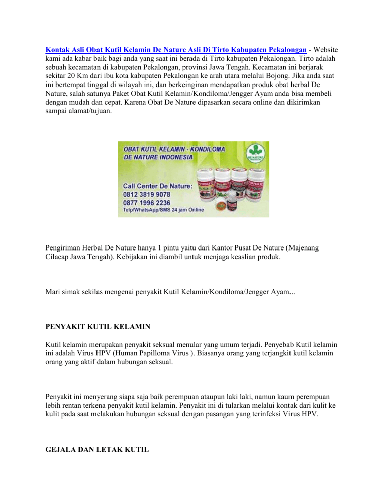 Kontak Asli Obat Kutil Kelamin De Nature Asli Di Tirto Kabupaten Pekalongan - Website kami ada kabar baik bagi anda yang saat ini berada di Tirto kabupaten Pekalongan. Tirto adalah sebuah kecamatan di kabupaten Pekalongan, provinsi Jawa Tengah. Kecamatan ini berjarak sekitar 20 Km dari ibu kota kabupaten Pekalongan ke arah utara melalui Bojong. Jika anda saat ini bertempat tinggal di wilayah ini, dan berkeinginan mendapatkan produk obat herbal De Nature, salah satunya Paket Obat Kutil Kelamin/Kondiloma/Jengger Ayam anda bisa membeli dengan mudah dan cepat. Karena Obat De Nature dipasarkan secara online dan dikirimkan sampai alamat/tujuan. Pengiriman Herbal De Nature hanya 1 pintu yaitu dari Kantor Pusat De Nature (Majenang Cilacap Jawa Tengah). Kebijakan ini diambil untuk menjaga keaslian produk. Mari simak sekilas mengenai penyakit Kutil Kelamin/Kondiloma/Jengger Ayam... PENYAKIT KUTIL KELAMIN Kutil kelamin merupakan penyakit seksual menular yang umum terjadi. Penyebab Kutil kelamin ini adalah Virus HPV (Human Papilloma Virus ). Biasanya orang yang terjangkit kutil kelamin orang yang aktif dalam hubungan seksual. Penyakit ini menyerang siapa saja baik perempuan ataupun laki laki, namun kaum perempuan lebih rentan terkena penyakit kutil kelamin. Penyakit ini di tularkan melalui kontak dari kulit ke kulit pada saat melakukan hubungan seksual dengan pasangan yang terinfeksi Virus HPV. GEJALA DAN LETAK KUTIL Kutil di kelamin berukuran kecil, dengan warna mirip kulit atau lebih gelap. Oleh sebab itu, kutil kadang sulit terlihat dengan kasat mata. Kutil ini bisa tumbuh secara tunggal, dan bisa juga berkelompok (mirip kembang kol). Kontak Asli Obat Kutil Kelamin De Nature Asli Di Tirto Kabupaten Pekalongan Walaupun kadang tidak terlihat, kutil kelamin tetap bisa menimbulkan gejala, gatal dan rasa tidak nyaman di area kelamin, sensasi seperti panas terbakar, nyeri serta pendarahan saat berhubungan. Kutil kelamin pada pria dapat tumbuh di area: - Batang/ujung penis - Kantung buah zakar - Selangkangan - Paha bagian atas - Sekitar/di dalam anus Pada wanita, kutil kelamin dapat tumbuh di: - Dinding vagina - Vulva/luar vagina - Daerah antara vagina dan anus - Di dalam vagina/di dalam anus - Leher rahim PENGOBATAN KUTIL KELAMIN Informasi untuk kenyamanan anda, bahwa Produk dari perusahaan kami ini sudah memiliki: - Bersertifikat ISO 9001:2015 - Ijin Resmi Perusahaan dari Kementerian Kesehatan - Ijin BPOM, yang artinya sudah lulus Uji Stabilitas Produk - Sertifikat Halal MUI, sehingga kehalalannya bisa dipertanggung jawabkan - Apoteker Yang berpengalaman - Sudah melewati Proses Sortir Bahan Baku, Guna Menjaga Mutu Produk - Proses Produksi Sesuai Alur CPOTB (Cara Pembuatan Obat Tradisional Yang Baik Dan Benar) Informasi lebih lanjut mengenai Obat Kutil Kelamin De Nature ini, baik harga, cara pemesanan, cara pengiriman atau hal lainnya, silahkan hubungi kami di nomor kontak De Nature: 08123819-9078 atau 0877-1996-2236. Terima kasih atas perhatian dan kunjungannya, semoga artikel ini dapat memberikan informasi yang anda perlukan.