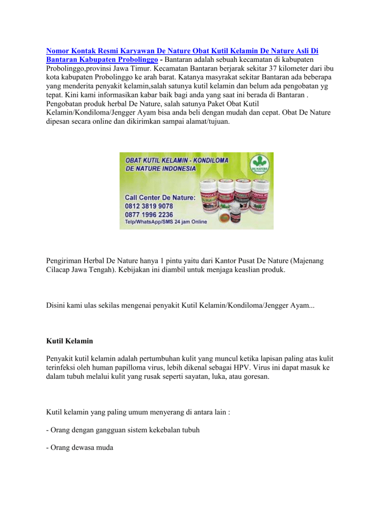 Nomor Kontak Resmi Karyawan De Nature Obat Kutil Kelamin De Nature Asli Di Bantaran Kabupaten Probolinggo - Bantaran adalah sebuah kecamatan di kabupaten Probolinggo,provinsi Jawa Timur. Kecamatan Bantaran berjarak sekitar 37 kilometer dari ibu kota kabupaten Probolinggo ke arah barat. Katanya masyrakat sekitar Bantaran ada beberapa yang menderita penyakit kelamin,salah satunya kutil kelamin dan belum ada pengobatan yg tepat. Kini kami informasikan kabar baik bagi anda yang saat ini berada di Bantaran . Pengobatan produk herbal De Nature, salah satunya Paket Obat Kutil Kelamin/Kondiloma/Jengger Ayam bisa anda beli dengan mudah dan cepat. Obat De Nature dipesan secara online dan dikirimkan sampai alamat/tujuan. Pengiriman Herbal De Nature hanya 1 pintu yaitu dari Kantor Pusat De Nature (Majenang Cilacap Jawa Tengah). Kebijakan ini diambil untuk menjaga keaslian produk. Disini kami ulas sekilas mengenai penyakit Kutil Kelamin/Kondiloma/Jengger Ayam... Kutil Kelamin Penyakit kutil kelamin adalah pertumbuhan kulit yang muncul ketika lapisan paling atas kulit terinfeksi oleh human papilloma virus, lebih dikenal sebagai HPV. Virus ini dapat masuk ke dalam tubuh melalui kulit yang rusak seperti sayatan, luka, atau goresan. Kutil kelamin yang paling umum menyerang di antara lain : - Orang dengan gangguan sistem kekebalan tubuh - Orang dewasa muda - Orang-orang yang menghabiskan banyak waktu di kamar mandi umum dan kamar ganti - Orang-orang yang berbagi barang pribadi dengan orang lain - Orang yang memakai sepatu ketat yang dapat menyebabkan kaki berkeringat Kutil kelamin tidak hanya menjadi masalah kesehatan genital semata. Ia juga bisa mempengaruhi aspek mental pasien, diantaranya menimbulkan rasa cemas, marah, hingga stres. Nomor Kontak Resmi Karyawan De Nature Obat Kutil Kelamin De Nature Asli Di Bantaran Kabupaten Probolinggo Beberapa efek samping penyebab kutil tumbuh pada kelamin yang mengganggu aktifitas anda sebagai berikut : - Menyebar - Bengkak - Muncul merah atau memiliki garis-garis merah yang memanjang - Nyeri tekan - Berisi nanah - Menyebabkan demam bersama dengan salah satu gejala di atas Kutil kelamin baru muncul dalam kurun waktu minggu atau bulan setelah kontak seksual dengan orang yang terinfeksi virus tersebut. Obat Kutil Kelamin - Obat Jengger Ayam - Obat Kondiloma Akuminata - Obat Herbal Informasi untuk kenyamanan anda, bahwa Produk dari perusahaan kami ini sudah memiliki: - Bersertifikat ISO 9001:2015 - Ijin Resmi Perusahaan dari Kementerian Kesehatan - Ijin BPOM, yang artinya sudah lulus Uji Stabilitas Produk - Sertifikat Halal MUI, sehingga kehalalannya bisa dipertanggung jawabkan - Apoteker Yang berpengalaman - Sudah melewati Proses Sortir Bahan Baku, Guna Menjaga Mutu Produk - Proses Produksi Sesuai Alur CPOTB (Cara Pembuatan Obat Tradisional Yang Baik Dan Benar) Informasi pemesanan Obat Kutil Kelamin De Nature , silahkan hubungi kami di nomor kontak De Nature: 0812-3819-9078 atau 0877-1996-2236.