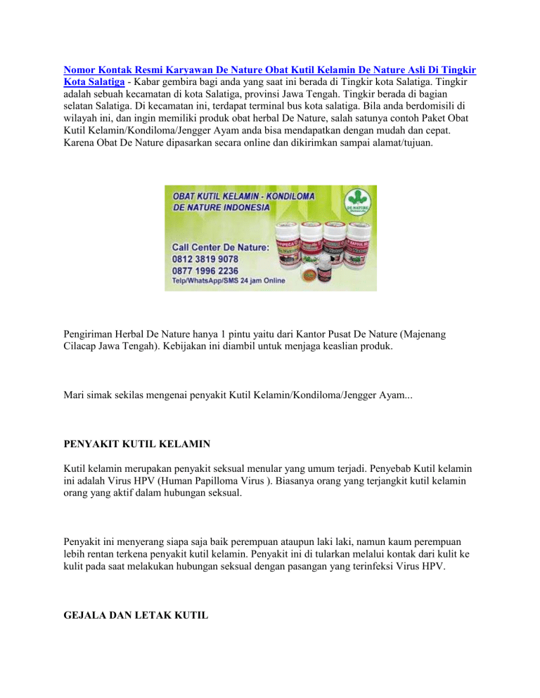 Nomor Kontak Resmi Karyawan De Nature Obat Kutil Kelamin De Nature Asli Di Tingkir Kota Salatiga - Kabar gembira bagi anda yang saat ini berada di Tingkir kota Salatiga. Tingkir adalah sebuah kecamatan di kota Salatiga, provinsi Jawa Tengah. Tingkir berada di bagian selatan Salatiga. Di kecamatan ini, terdapat terminal bus kota salatiga. Bila anda berdomisili di wilayah ini, dan ingin memiliki produk obat herbal De Nature, salah satunya contoh Paket Obat Kutil Kelamin/Kondiloma/Jengger Ayam anda bisa mendapatkan dengan mudah dan cepat. Karena Obat De Nature dipasarkan secara online dan dikirimkan sampai alamat/tujuan. Pengiriman Herbal De Nature hanya 1 pintu yaitu dari Kantor Pusat De Nature (Majenang Cilacap Jawa Tengah). Kebijakan ini diambil untuk menjaga keaslian produk. Mari simak sekilas mengenai penyakit Kutil Kelamin/Kondiloma/Jengger Ayam... PENYAKIT KUTIL KELAMIN Kutil kelamin merupakan penyakit seksual menular yang umum terjadi. Penyebab Kutil kelamin ini adalah Virus HPV (Human Papilloma Virus ). Biasanya orang yang terjangkit kutil kelamin orang yang aktif dalam hubungan seksual. Penyakit ini menyerang siapa saja baik perempuan ataupun laki laki, namun kaum perempuan lebih rentan terkena penyakit kutil kelamin. Penyakit ini di tularkan melalui kontak dari kulit ke kulit pada saat melakukan hubungan seksual dengan pasangan yang terinfeksi Virus HPV. GEJALA DAN LETAK KUTIL Kutil di kelamin berukuran kecil, dengan warna mirip kulit atau lebih gelap. Oleh sebab itu, kutil kadang sulit terlihat dengan kasat mata. Kutil ini bisa tumbuh secara tunggal, dan bisa juga berkelompok (mirip kembang kol). Nomor Kontak Resmi Karyawan De Nature Obat Kutil Kelamin De Nature Asli Di Tingkir Kota Salatiga Walaupun kadang tidak terlihat, kutil kelamin tetap bisa menimbulkan gejala, gatal dan rasa tidak nyaman di area kelamin, sensasi seperti panas terbakar, nyeri serta pendarahan saat berhubungan. Kutil kelamin pada pria dapat tumbuh di area: - Batang/ujung penis - Kantung buah zakar - Selangkangan - Paha bagian atas - Sekitar/di dalam anus Pada wanita, kutil kelamin dapat tumbuh di: - Dinding vagina - Vulva/luar vagina - Daerah antara vagina dan anus - Di dalam vagina/di dalam anus - Leher rahim PENGOBATAN KUTIL KELAMIN Informasi untuk kenyamanan anda, bahwa Produk dari perusahaan kami ini sudah memiliki: - Bersertifikat ISO 9001:2015 - Ijin Resmi Perusahaan dari Kementerian Kesehatan - Ijin BPOM, yang artinya sudah lulus Uji Stabilitas Produk - Sertifikat Halal MUI, sehingga kehalalannya bisa dipertanggung jawabkan - Apoteker Yang berpengalaman - Sudah melewati Proses Sortir Bahan Baku, Guna Menjaga Mutu Produk - Proses Produksi Sesuai Alur CPOTB (Cara Pembuatan Obat Tradisional Yang Baik Dan Benar) Informasi lebih lanjut mengenai Obat Kutil Kelamin De Nature ini, baik harga, cara pemesanan, cara pengiriman atau hal lainnya, silahkan hubungi kami di nomor kontak De Nature: 08123819-9078 atau 0877-1996-2236. Terima kasih atas perhatian dan kunjungannya, semoga artikel ini dapat memberikan informasi yang anda perlukan.
