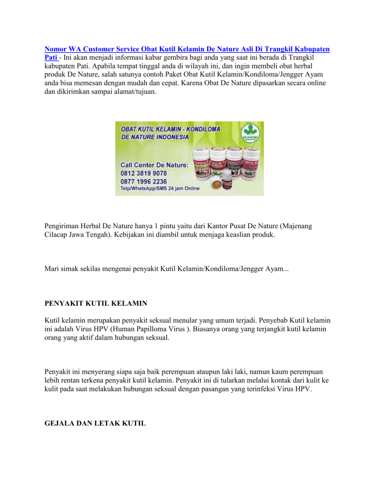 Nomor WA Customer Service Obat Kutil Kelamin De Nature Asli Di Trangkil Kabupaten Pati - Ini akan menjadi informasi kabar gembira bagi anda yang saat ini berada di Trangkil kabupaten Pati. Apabila tempat tinggal anda di wilayah ini, dan ingin membeli obat herbal produk De Nature, salah satunya contoh Paket Obat Kutil Kelamin/Kondiloma/Jengger Ayam anda bisa memesan dengan mudah dan cepat. Karena Obat De Nature dipasarkan secara online dan dikirimkan sampai alamat/tujuan. Pengiriman Herbal De Nature hanya 1 pintu yaitu dari Kantor Pusat De Nature (Majenang Cilacap Jawa Tengah). Kebijakan ini diambil untuk menjaga keaslian produk. Mari simak sekilas mengenai penyakit Kutil Kelamin/Kondiloma/Jengger Ayam... PENYAKIT KUTIL KELAMIN Kutil kelamin merupakan penyakit seksual menular yang umum terjadi. Penyebab Kutil kelamin ini adalah Virus HPV (Human Papilloma Virus ). Biasanya orang yang terjangkit kutil kelamin orang yang aktif dalam hubungan seksual. Penyakit ini menyerang siapa saja baik perempuan ataupun laki laki, namun kaum perempuan lebih rentan terkena penyakit kutil kelamin. Penyakit ini di tularkan melalui kontak dari kulit ke kulit pada saat melakukan hubungan seksual dengan pasangan yang terinfeksi Virus HPV. GEJALA DAN LETAK KUTIL Kutil di kelamin berukuran kecil, dengan warna mirip kulit atau lebih gelap. Oleh sebab itu, kutil kadang sulit terlihat dengan kasat mata. Kutil ini bisa tumbuh secara tunggal, dan bisa juga berkelompok (mirip kembang kol). Nomor WA Customer Service Obat Kutil Kelamin De Nature Asli Di Trangkil Kabupaten Pati Walaupun kadang tidak terlihat, kutil kelamin tetap bisa menimbulkan gejala, gatal dan rasa tidak nyaman di area kelamin, sensasi seperti panas terbakar, nyeri serta pendarahan saat berhubungan. Kutil kelamin pada pria dapat tumbuh di area: - Batang/ujung penis - Kantung buah zakar - Selangkangan - Paha bagian atas - Sekitar/di dalam anus Pada wanita, kutil kelamin dapat tumbuh di: - Dinding vagina - Vulva/luar vagina - Daerah antara vagina dan anus - Di dalam vagina/di dalam anus - Leher rahim PENGOBATAN KUTIL KELAMIN Informasi untuk kenyamanan anda, bahwa Produk dari perusahaan kami ini sudah memiliki: - Bersertifikat ISO 9001:2015 - Ijin Resmi Perusahaan dari Kementerian Kesehatan - Ijin BPOM, yang artinya sudah lulus Uji Stabilitas Produk - Sertifikat Halal MUI, sehingga kehalalannya bisa dipertanggung jawabkan - Apoteker Yang berpengalaman - Sudah melewati Proses Sortir Bahan Baku, Guna Menjaga Mutu Produk - Proses Produksi Sesuai Alur CPOTB (Cara Pembuatan Obat Tradisional Yang Baik Dan Benar) Informasi lebih lanjut mengenai Obat Kutil Kelamin De Nature ini, baik harga, cara pemesanan, cara pengiriman atau hal lainnya, silahkan hubungi kami di nomor kontak De Nature: 08123819-9078 atau 0877-1996-2236. Terima kasih atas perhatian dan kunjungannya, semoga artikel ini dapat memberikan informasi yang anda perlukan.