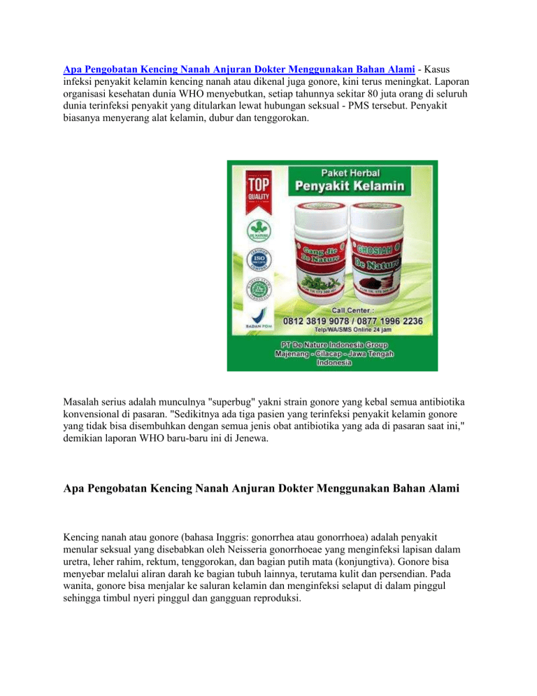 Apa Pengobatan Kencing Nanah Anjuran Dokter Menggunakan Bahan Alami - Kasus infeksi penyakit kelamin kencing nanah atau dikenal juga gonore, kini terus meningkat. Laporan organisasi kesehatan dunia WHO menyebutkan, setiap tahunnya sekitar 80 juta orang di seluruh dunia terinfeksi penyakit yang ditularkan lewat hubungan seksual - PMS tersebut. Penyakit biasanya menyerang alat kelamin, dubur dan tenggorokan. Masalah serius adalah munculnya "superbug" yakni strain gonore yang kebal semua antibiotika konvensional di pasaran. "Sedikitnya ada tiga pasien yang terinfeksi penyakit kelamin gonore yang tidak bisa disembuhkan dengan semua jenis obat antibiotika yang ada di pasaran saat ini," demikian laporan WHO baru-baru ini di Jenewa. Apa Pengobatan Kencing Nanah Anjuran Dokter Menggunakan Bahan Alami Kencing nanah atau gonore (bahasa Inggris: gonorrhea atau gonorrhoea) adalah penyakit menular seksual yang disebabkan oleh Neisseria gonorrhoeae yang menginfeksi lapisan dalam uretra, leher rahim, rektum, tenggorokan, dan bagian putih mata (konjungtiva). Gonore bisa menyebar melalui aliran darah ke bagian tubuh lainnya, terutama kulit dan persendian. Pada wanita, gonore bisa menjalar ke saluran kelamin dan menginfeksi selaput di dalam pinggul sehingga timbul nyeri pinggul dan gangguan reproduksi. Gonore merupakan penyakit infeksi yang menyerang lapisan epitel (lapisan paling atas dari suatu jaringan). Bila tidak diobati, infeksi ini akan menyebar ke jaringan yang lebih dalam. Biasanya membentuk koloni di daerah mukosa, orofaring, dan anogenital. Apa Pengobatan Kencing Nanah Anjuran Dokter Menggunakan Bahan Alami Gonore bisa diobati dengan menggunakan antibiotik oral atau injeksi. Jika Anda memiliki kondisi ini pasangan Anda juga harus diobati pada saat yang sama untuk menghindari infeksi dan penyebaran penyakit lebih lanjut. Bahkan jika Anda merasa lebih baik, Anda masih perlu mengikuti instruksi dan menggunakan semua antibiotik Anda. Bila Anda dan pasangan terbukti mengidap gonore, penting bagi Anda untuk hanya menggunakan obat-obatan Anda sendiri. Obat setiap orang diresepkan berdasarkan kebutuhan mereka sendiri. Jika Anda menggunakan obat orang lain, ini bisa membuat infeksi lebih sulit untuk diobati. Jika kondisi Anda tidak menjadi lebih baik dengan antibiotik, dokter mungkin akan memberikan suntikan antibiotik yang lebih kuat atau kombinasi antibiotik. Setelah itu, Anda perlu melakukan beberapa tindak lanjut untuk memantau kemajuan Anda. Jika bayi Anda lahir saat Anda mengalami gonore, bayi Anda harus menerima obat segera setelah lahir untuk mencegah infeksi. Gonore mempengaruhi anak-anak pada bagian mata mereka lebih dahulu. Jika infeksi mata terjadi, mereka dapat diobati dengan antibiotik. Berikut beberapa macam obat kencing nanah berupa antibiotik yang digunakan untuk menyembuhkan gonore. Ceftriaxone (rocephin), adalah obat Antibiotik ini digunakan secara bersamaan dengan azithromycin untuk menghambat pertumbuhan dinding sel bakteri yang sudah mencapai darah. Azithromycin (zithromax, zmax) adalah antibiotik yang digunakan untuk menghambat pertumbuhan bakteri Cefixime dan sefalosporin adalah antibiotik ini digunakan sebagai pengganti bila ceftriaxone tidak tersedia. Obat ini menghambat sintesis dinding sel bakteri dan digunakan bersamaan dengan azithromycin. Keduanya digunakan bila pasien tidak memiliki komplikasi. Doxycycline adalah obat antibiotik ini menghambat sintesis protein yang dapat memicu pertumbuhan bakteri. Doxycycline digunakan selama 10 sampai 14 hari dengan dosis 100 mg sebagai tambahan dosis tunggal ceftriaxone untuk mengobati radang panggul (PID). Erythromycin adalah obat salep tetes antibiotik yang direkomendasikan untuk digunakan pada bayi yang baru lahir untuk mencegah penyakit konjungtivitis (radang konjungtiva mata). ANTIBIOTIK ALAMI DARI DAPUR ANDA Bawang putih Bawang putih adalah bahan makanan yang mengandung allicin, senyawa yang memiliki sifat yang sangat mirip dengan penisilin, bahan utama dalam antibiotik. Bawang putih juga memiliki anti-virus, anti-parasit, anti-jamur, dan antioksidan yang membantu mencegah berbagai penyakit, seperti flu, tekanan darah tinggi dan penyakit jantung. Apa Pengobatan Kencing Nanah Anjuran Dokter Menggunakan Bahan Alami Kayu manis Cinnamon memiliki beberapa sifat antibakteri dan antijamur yang berasal dari minyak esensial yang ditemukan dalam kulitnya. Studi menemukan bahwa kayu manis paling efektif bila dikonsumsi dengan madu, karena kombinasi dari keduanya secara bersama-sama memberikan efek antibiotik yang amat baik. Kunyit Kunyit memiliki beberapa sifat antibakteri dan anti-inflamasi yang mengobati berbagai macam infeksi. Akar-akaran ini terbukti sangat berguna dalam mengobati infeksi. Ijinkan kami memberikan informasi mengenai cara mengobati kencing nanah secara alami dengan Obat Herbal Kencing Nanah De Nature. Paket Obat Herbal ini terdiri dari Gang Jie dan Gho Siah. Obat berbahan dasar herbal dan diracik secara modern sesuai aturan BPOM. Atau dengan kata lain Obat kencing nanah alami ini sudah terdaftar resmi di BPOM. Informasi lebih lengkap mengenai kami Paket Obat Herbal Kencing Nanah atau Obat Herbal lainnya, anda dapat hubungi kami di nomor 081-238-199-078 atau WA: 087-719-962-236.
