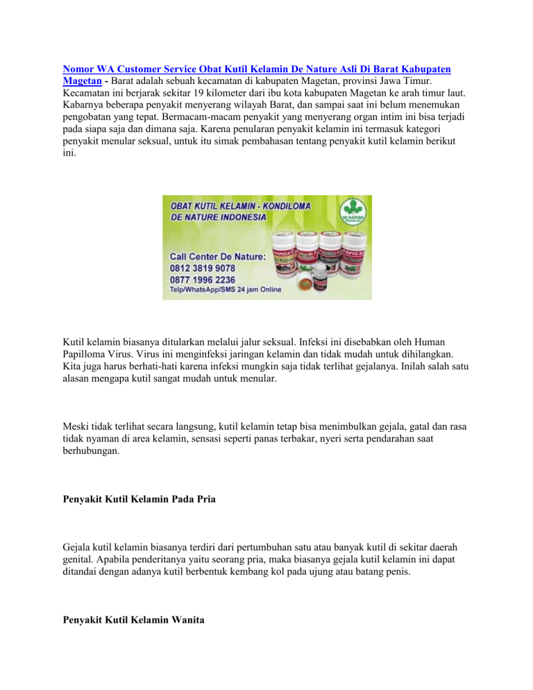 Nomor WA Customer Service Obat Kutil Kelamin De Nature Asli Di Barat Kabupaten Magetan - Barat adalah sebuah kecamatan di kabupaten Magetan, provinsi Jawa Timur. Kecamatan ini berjarak sekitar 19 kilometer dari ibu kota kabupaten Magetan ke arah timur laut. Kabarnya beberapa penyakit menyerang wilayah Barat, dan sampai saat ini belum menemukan pengobatan yang tepat. Bermacam-macam penyakit yang menyerang organ intim ini bisa terjadi pada siapa saja dan dimana saja. Karena penularan penyakit kelamin ini termasuk kategori penyakit menular seksual, untuk itu simak pembahasan tentang penyakit kutil kelamin berikut ini. Kutil kelamin biasanya ditularkan melalui jalur seksual. Infeksi ini disebabkan oleh Human Papilloma Virus. Virus ini menginfeksi jaringan kelamin dan tidak mudah untuk dihilangkan. Kita juga harus berhati-hati karena infeksi mungkin saja tidak terlihat gejalanya. Inilah salah satu alasan mengapa kutil sangat mudah untuk menular. Meski tidak terlihat secara langsung, kutil kelamin tetap bisa menimbulkan gejala, gatal dan rasa tidak nyaman di area kelamin, sensasi seperti panas terbakar, nyeri serta pendarahan saat berhubungan. Penyakit Kutil Kelamin Pada Pria Gejala kutil kelamin biasanya terdiri dari pertumbuhan satu atau banyak kutil di sekitar daerah genital. Apabila penderitanya yaitu seorang pria, maka biasanya gejala kutil kelamin ini dapat ditandai dengan adanya kutil berbentuk kembang kol pada ujung atau batang penis. Penyakit Kutil Kelamin Wanita Sedangkan jika pengidapnya wanita, kutil kelamin biasanya bertumbuh di perineum atau di dalam vagina. Khusus untuk pertumbuhan kutil yang terjadi di vagina ini biasanya tidak mudah dilihat, dan hal ini juga yang dapat menyebabkan keterlambatan dalam mencari pengobatan. Beberapa gejala-gejala kutil kelamin diantaranya yaitu : - Gatal - Iritasi di sekitar genital. - Kelamin berwarna merah dan mengelupas. Salah satu cara supaya gejala ini tidak perlu terjadi yaitu dengan berhati-hati menggunakan obatobatan kulit yang mengandung bahan kimia. Pendarahan yaitu gejala kutil kelamin yang lain, Kita mungkin saja akan menemukan gejala ini pada saat berhubungan seks, selain juga akan melihat garis-garis darah segar. Hal ini karena kutil melepaskan diri selama tindakan seksual atau meninggalkan dasar kulit mentah dan terbuka. Nomor WA Customer Service Obat Kutil Kelamin De Nature Asli Di Barat Kabupaten Magetan Pengobatan Herbal Kutil Kelamin Pria dan Wanita Informasi untuk kenyamanan anda, bahwa Produk dari perusahaan kami ini sudah memiliki: - Bersertifikat ISO 9001:2015 - Ijin Resmi Perusahaan dari Kementerian Kesehatan - Ijin BPOM, yang artinya sudah lulus Uji Stabilitas Produk - Sertifikat Halal MUI, sehingga kehalalannya bisa dipertanggung jawabkan - Apoteker Yang berpengalaman - Sudah melewati Proses Sortir Bahan Baku, Guna Menjaga Mutu Produk - Proses Produksi Sesuai Alur CPOTB (Cara Pembuatan Obat Tradisional Yang Baik Dan Benar) Informasi selanjutnya Obat Kutil Kelamin De Nature , silahkan hubungi kami di nomor kontak De Nature: 0812-3819-9078 atau 0877-1996-2236.