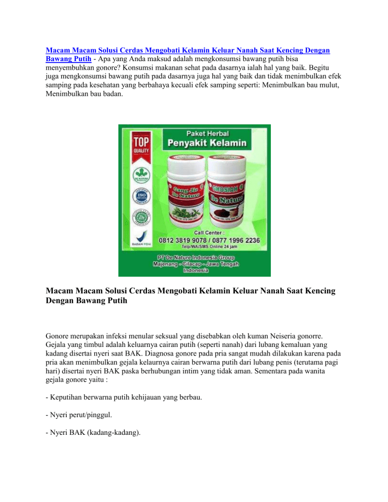 Macam Macam Solusi Cerdas Mengobati Kelamin Keluar Nanah Saat Kencing Dengan Bawang Putih - Apa yang Anda maksud adalah mengkonsumsi bawang putih bisa menyembuhkan gonore? Konsumsi makanan sehat pada dasarnya ialah hal yang baik. Begitu juga mengkonsumsi bawang putih pada dasarnya juga hal yang baik dan tidak menimbulkan efek samping pada kesehatan yang berbahaya kecuali efek samping seperti: Menimbulkan bau mulut, Menimbulkan bau badan. Macam Macam Solusi Cerdas Mengobati Kelamin Keluar Nanah Saat Kencing Dengan Bawang Putih Gonore merupakan infeksi menular seksual yang disebabkan oleh kuman Neiseria gonorre. Gejala yang timbul adalah keluarnya cairan putih (seperti nanah) dari lubang kemaluan yang kadang disertai nyeri saat BAK. Diagnosa gonore pada pria sangat mudah dilakukan karena pada pria akan menimbulkan gejala kelaurnya cairan berwarna putih dari lubang penis (terutama pagi hari) disertai nyeri BAK paska berhubungan intim yang tidak aman. Sementara pada wanita gejala gonore yaitu : - Keputihan berwarna putih kehijauan yang berbau. - Nyeri perut/pinggul. - Nyeri BAK (kadang-kadang). Pengobatan terbaik Gonore adalah dengan Antibiotik. Antibiotik yang diberikan tergantung dari keparahan penyakit yang diderita. Kadang diperlukan kombinasi antara antibiotik oral dan injeksi bersamaan untuk mengobati penyakit ini. Selain pengobatan, pencegahan juga sangat penting, karena walaupun sudah diobati seseorangmasih bisa terinfeksi kembali jika melakukan hubungan intim yang tidak aman dengan banyak orang. Macam Macam Solusi Cerdas Mengobati Kelamin Keluar Nanah Saat Kencing Dengan Bawang Putih Cara pencegahan yang baik adalah : - Berpantang seks bebas - Gunakan kondom - Setia kepada pasangan. Ijinkan kami memberikan informasi mengenai cara mengobati kencing nanah secara alami dengan Obat Herbal Kencing Nanah De Nature. Paket Obat Herbal ini terdiri dari Gang Jie dan Gho Siah. Obat berbahan dasar herbal dan diracik secara modern sesuai aturan BPOM. Atau dengan kata lain Obat kencing nanah alami ini sudah terdaftar resmi di BPOM. Informasi lebih lengkap mengenai kami Paket Obat Herbal Kencing Nanah atau Obat Herbal lainnya, anda dapat hubungi kami di nomor 081-238-199-078 atau WA: 087-719-962236. Macam Macam Solusi Cerdas Mengobati Kelamin Keluar Nanah Saat Kencing Dengan Bawang Putih