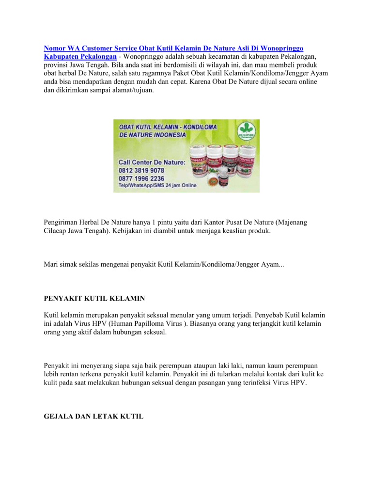 Nomor WA Customer Service Obat Kutil Kelamin De Nature Asli Di Wonopringgo Kabupaten Pekalongan - Wonopringgo adalah sebuah kecamatan di kabupaten Pekalongan, provinsi Jawa Tengah. Bila anda saat ini berdomisili di wilayah ini, dan mau membeli produk obat herbal De Nature, salah satu ragamnya Paket Obat Kutil Kelamin/Kondiloma/Jengger Ayam anda bisa mendapatkan dengan mudah dan cepat. Karena Obat De Nature dijual secara online dan dikirimkan sampai alamat/tujuan. Pengiriman Herbal De Nature hanya 1 pintu yaitu dari Kantor Pusat De Nature (Majenang Cilacap Jawa Tengah). Kebijakan ini diambil untuk menjaga keaslian produk. Mari simak sekilas mengenai penyakit Kutil Kelamin/Kondiloma/Jengger Ayam... PENYAKIT KUTIL KELAMIN Kutil kelamin merupakan penyakit seksual menular yang umum terjadi. Penyebab Kutil kelamin ini adalah Virus HPV (Human Papilloma Virus ). Biasanya orang yang terjangkit kutil kelamin orang yang aktif dalam hubungan seksual. Penyakit ini menyerang siapa saja baik perempuan ataupun laki laki, namun kaum perempuan lebih rentan terkena penyakit kutil kelamin. Penyakit ini di tularkan melalui kontak dari kulit ke kulit pada saat melakukan hubungan seksual dengan pasangan yang terinfeksi Virus HPV. GEJALA DAN LETAK KUTIL Kutil di kelamin berukuran kecil, dengan warna mirip kulit atau lebih gelap. Oleh sebab itu, kutil kadang sulit terlihat dengan kasat mata. Kutil ini bisa tumbuh secara tunggal, dan bisa juga berkelompok (mirip kembang kol). Nomor WA Customer Service Obat Kutil Kelamin De Nature Asli Di Wonopringgo Kabupaten Pekalongan Walaupun kadang tidak terlihat, kutil kelamin tetap bisa menimbulkan gejala, gatal dan rasa tidak nyaman di area kelamin, sensasi seperti panas terbakar, nyeri serta pendarahan saat berhubungan. Kutil kelamin pada pria dapat tumbuh di area: - Batang/ujung penis - Kantung buah zakar - Selangkangan - Paha bagian atas - Sekitar/di dalam anus Pada wanita, kutil kelamin dapat tumbuh di: - Dinding vagina - Vulva/luar vagina - Daerah antara vagina dan anus - Di dalam vagina/di dalam anus - Leher rahim PENGOBATAN KUTIL KELAMIN Informasi untuk kenyamanan anda, bahwa Produk dari perusahaan kami ini sudah memiliki: - Bersertifikat ISO 9001:2015 - Ijin Resmi Perusahaan dari Kementerian Kesehatan - Ijin BPOM, yang artinya sudah lulus Uji Stabilitas Produk - Sertifikat Halal MUI, sehingga kehalalannya bisa dipertanggung jawabkan - Apoteker Yang berpengalaman - Sudah melewati Proses Sortir Bahan Baku, Guna Menjaga Mutu Produk - Proses Produksi Sesuai Alur CPOTB (Cara Pembuatan Obat Tradisional Yang Baik Dan Benar) Informasi lebih lanjut mengenai Obat Kutil Kelamin De Nature ini, baik harga, cara pemesanan, cara pengiriman atau hal lainnya, silahkan hubungi kami di nomor kontak De Nature: 08123819-9078 atau 0877-1996-2236. Terima kasih atas perhatian dan kunjungannya, semoga artikel ini dapat memberikan informasi yang anda perlukan.