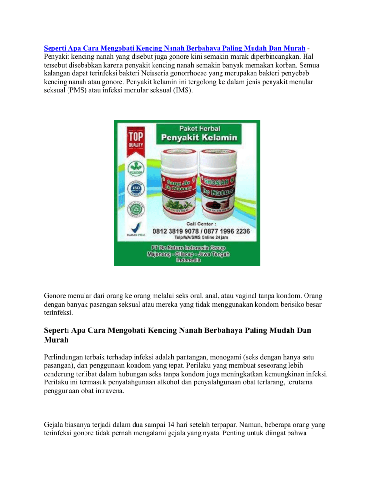 Seperti Apa Cara Mengobati Kencing Nanah Berbahaya Paling Mudah Dan Murah Penyakit kencing nanah yang disebut juga gonore kini semakin marak diperbincangkan. Hal tersebut disebabkan karena penyakit kencing nanah semakin banyak memakan korban. Semua kalangan dapat terinfeksi bakteri Neisseria gonorrhoeae yang merupakan bakteri penyebab kencing nanah atau gonore. Penyakit kelamin ini tergolong ke dalam jenis penyakit menular seksual (PMS) atau infeksi menular seksual (IMS). Gonore menular dari orang ke orang melalui seks oral, anal, atau vaginal tanpa kondom. Orang dengan banyak pasangan seksual atau mereka yang tidak menggunakan kondom berisiko besar terinfeksi. Seperti Apa Cara Mengobati Kencing Nanah Berbahaya Paling Mudah Dan Murah Perlindungan terbaik terhadap infeksi adalah pantangan, monogami (seks dengan hanya satu pasangan), dan penggunaan kondom yang tepat. Perilaku yang membuat seseorang lebih cenderung terlibat dalam hubungan seks tanpa kondom juga meningkatkan kemungkinan infeksi. Perilaku ini termasuk penyalahgunaan alkohol dan penyalahgunaan obat terlarang, terutama penggunaan obat intravena. Gejala biasanya terjadi dalam dua sampai 14 hari setelah terpapar. Namun, beberapa orang yang terinfeksi gonore tidak pernah mengalami gejala yang nyata. Penting untuk diingat bahwa seseorang dengan gonore yang tidak memiliki gejala, juga disebut pembawa nonsymptomatic, masih menular. Seseorang lebih cenderung menyebarkan infeksi ke pasangan lain bila tidak memiliki gejala yang nyata. Seperti Apa Cara Mengobati Kencing Nanah Berbahaya Paling Mudah Dan Murah Gejala Penyakit Kencing Nanah Pada pria, gejala awal penyakit kencing nanah biasanya timbul dalam waktu 2-7 hari setelah terinfeksi. Gejalanya berawal dengan rasa tidak nyaman pada uretra dan beberapa jam kemudian diikuti oleh nyeri ketika buang air kecil serta keluarnya nanah dari penis. Sedangkan pada wanita, gejala awal biasanya timbul waktu 7-21 hari setelah terinfeksi. Penderita seringkali tidak merasakan gejala selama beberapa minggu atau bulan, dan diketahui menderita penyakit tersebut hanya setelah pasangan hubungan seksualnya tertular. Jika penyakit kencing nanah menimbulkan gejala, biasanya bersifat ringan dan mendadak hilang dengan sendirinya. Tetapi beberapa penderita menunjukkan gejala yang berat, seperti desakan untuk berkemih, nyeri ketika berkemih, keluarnya cairan dari vagina, dan demam. Infeksi dapat menyerang leher rahim, rahim, saluran telur, indung telur, uretra, dan rektum serta menyebabkan nyeri pinggul yang dalam ketika berhubungan seksual. Wanita dan pria homoseksual yang melakukan hubungan seks melalui anus (anal sex) dapat menderita gonore pada rektumnya, biasanya penderita kencing nanah akan merasakan tidak nyaman di sekitar anusnya dan dari rektumnya keluar cairan. Daerah di sekitar anus tampak merah dan kasar, serta tinjanya terbungkus oleh lendir dan nanah. Hubungan seksual melalui mulut (oral sex) dengan seseorang penderita gonore biasanya akan menyebabkan gonore pada tenggorokan (faringitis gonokokal), umumnya infeksi tersebut tidak menimbulkan gejala namun kadang-kadang menyebabkan nyeri tenggorokan dan gangguan untuk menelan. Jika cairan yang terinfeksi mengenai mata, maka bisa menyebabkan terjadinya infeksi mata luar (konjungtivitis gonore). Bayi yang baru lahir juga bisa terinfeksi gonore dari ibunya selama proses persalinan sehingga terjadi pembengkakan pada kedua kelopak matanya dan dari matanya keluar nanah. Jika infeksi itu tidak diobati, maka akan menimbulkan kebutaan. (https://doktersehat.com/) Kencing Nanah Bisa Disembuhkan? Penyakit Gonore atau Kencing Nanah dapat disembuhkan dengan obat yang tepat serta dilakukan sesegera mungkin setelah terinfeksi. Seperti Apa Cara Mengobati Kencing Nanah Berbahaya Paling Mudah Dan Murah