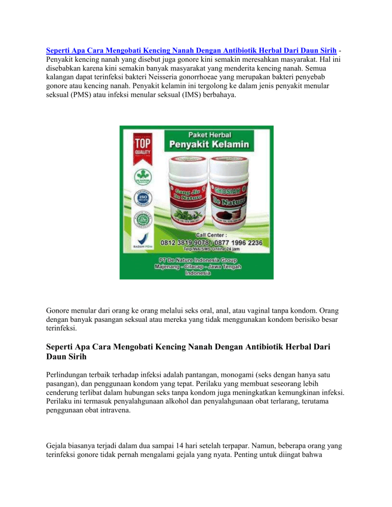 Seperti Apa Cara Mengobati Kencing Nanah Dengan Antibiotik Herbal Dari Daun Sirih Penyakit kencing nanah yang disebut juga gonore kini semakin meresahkan masyarakat. Hal ini disebabkan karena kini semakin banyak masyarakat yang menderita kencing nanah. Semua kalangan dapat terinfeksi bakteri Neisseria gonorrhoeae yang merupakan bakteri penyebab gonore atau kencing nanah. Penyakit kelamin ini tergolong ke dalam jenis penyakit menular seksual (PMS) atau infeksi menular seksual (IMS) berbahaya. Gonore menular dari orang ke orang melalui seks oral, anal, atau vaginal tanpa kondom. Orang dengan banyak pasangan seksual atau mereka yang tidak menggunakan kondom berisiko besar terinfeksi. Seperti Apa Cara Mengobati Kencing Nanah Dengan Antibiotik Herbal Dari Daun Sirih Perlindungan terbaik terhadap infeksi adalah pantangan, monogami (seks dengan hanya satu pasangan), dan penggunaan kondom yang tepat. Perilaku yang membuat seseorang lebih cenderung terlibat dalam hubungan seks tanpa kondom juga meningkatkan kemungkinan infeksi. Perilaku ini termasuk penyalahgunaan alkohol dan penyalahgunaan obat terlarang, terutama penggunaan obat intravena. Gejala biasanya terjadi dalam dua sampai 14 hari setelah terpapar. Namun, beberapa orang yang terinfeksi gonore tidak pernah mengalami gejala yang nyata. Penting untuk diingat bahwa seseorang dengan gonore yang tidak memiliki gejala, juga disebut pembawa nonsymptomatic, masih menular. Seseorang lebih cenderung menyebarkan infeksi ke pasangan lain bila tidak memiliki gejala yang nyata. Seperti Apa Cara Mengobati Kencing Nanah Dengan Antibiotik Herbal Dari Daun Sirih Gejala Penyakit Kencing Nanah Pada pria, gejala awal penyakit kencing nanah biasanya timbul dalam waktu 2-7 hari setelah terinfeksi. Gejalanya berawal dengan rasa tidak nyaman pada uretra dan beberapa jam kemudian diikuti oleh nyeri ketika buang air kecil serta keluarnya nanah dari penis. Sedangkan pada wanita, gejala awal biasanya timbul waktu 7-21 hari setelah terinfeksi. Penderita seringkali tidak merasakan gejala selama beberapa minggu atau bulan, dan diketahui menderita penyakit tersebut hanya setelah pasangan hubungan seksualnya tertular. Jika penyakit kencing nanah menimbulkan gejala, biasanya bersifat ringan dan mendadak hilang dengan sendirinya. Tetapi beberapa penderita menunjukkan gejala yang berat, seperti desakan untuk berkemih, nyeri ketika berkemih, keluarnya cairan dari vagina, dan demam. Infeksi dapat menyerang leher rahim, rahim, saluran telur, indung telur, uretra, dan rektum serta menyebabkan nyeri pinggul yang dalam ketika berhubungan seksual. Wanita dan pria homoseksual yang melakukan hubungan seks melalui anus (anal sex) dapat menderita gonore pada rektumnya, biasanya penderita kencing nanah akan merasakan tidak nyaman di sekitar anusnya dan dari rektumnya keluar cairan. Daerah di sekitar anus tampak merah dan kasar, serta tinjanya terbungkus oleh lendir dan nanah. Hubungan seksual melalui mulut (oral sex) dengan seseorang penderita gonore biasanya akan menyebabkan gonore pada tenggorokan (faringitis gonokokal), umumnya infeksi tersebut tidak menimbulkan gejala namun kadang-kadang menyebabkan nyeri tenggorokan dan gangguan untuk menelan. Jika cairan yang terinfeksi mengenai mata, maka bisa menyebabkan terjadinya infeksi mata luar (konjungtivitis gonore). Bayi yang baru lahir juga bisa terinfeksi gonore dari ibunya selama proses persalinan sehingga terjadi pembengkakan pada kedua kelopak matanya dan dari matanya keluar nanah. Jika infeksi itu tidak diobati, maka akan menimbulkan kebutaan. (https://doktersehat.com/) Kencing Nanah Bisa Disembuhkan? Penyakit Gonore atau Kencing Nanah dapat disembuhkan dengan obat yang tepat serta dilakukan sesegera mungkin setelah terinfeksi. Seperti Apa Cara Mengobati Kencing Nanah Dengan Antibiotik Herbal Dari Daun Sirih