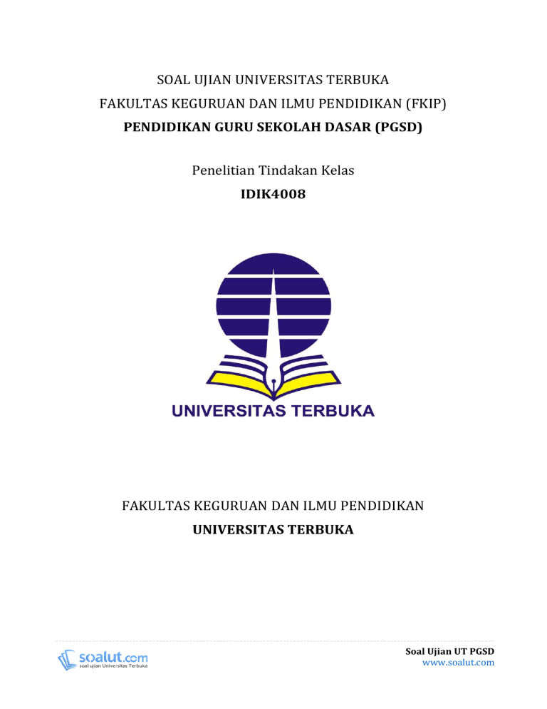 SOAL UJIAN UNIVERSITAS TERBUKA FAKULTAS KEGURUAN DAN ILMU PENDIDIKAN (FKIP) PENDIDIKAN GURU SEKOLAH DASAR (PGSD) Penelitian Tindakan Kelas IDIK4008 FAKULTAS KEGURUAN DAN ILMU PENDIDIKAN UNIVERSITAS TERBUKA ----------------------------------------------------------------------------------------------------------------------------------Soal Ujian UT PGSD www.soalut.com Soal Ujian UT PGSD IDIK4008 Penelitian Tindakan Kelas Beserta Kunci Jawaban dan Pembahasan Soal 1. PTK adalah suatu bentuk inkuiri yang didahului dengan refleksi. Pendapat ini dikemukakan oleh .... A. McTaggard B. Carr dan Kemmis C. Rochman D. Schmuck Jawab: B. benar, karena mereka menyatakan bahwa PTK adalah penelitian yang dimulai dengan refleksi diri. 2. Maksud dari self-reflective inquiry adalah penelitian yang .... A. berbasis refleksi diri B. metode yang longgar dan fleksibel C. berbasis hasil pengamatan dan renungan guru D. disesuaikan dengan kemampuan guru Jawab: A. benar, karena sesuai dengan self-reflective inquiry 3. Dibandingkan dengan penelitian formal, sampel yang digunakan dalam PTK termasuk jenis .... A. sampel representatif B. sampel purposif C. sampel acak D. kasus khusus yaitu kelas Jawab: D. benar, karena PTK memang khusus dirancang untuk penelitian oleh guru di kelasnya sendiri 4. Perbedaan antara PTK dengan non-PTK ditinjau dari hasil akhir yang ingin dicapai terletak pada .... A. teori belajar yang akan diuji B. temuan penelitian yang dapat digeneralisasikan C. perbaikan hasil belajar siswa D. meningkatnya kemampuan guru dalam melakukan penelitian Jawab: C. benar, karena hasil akhir yang ingin dicapai guru melalui PTK adalah terjadinya perbaikan/ peningkatan kualitas pembelajaran a.l. perbaikan hasil belajar siswa. 5. A. B. C. Manfaat PTK bagi sekolah adalah untuk meningkatkan .... kemampuan guru di bidang instruksional kualitas pendidikan di sekolah yang bersangkutan daya inovasi pada diri guru ----------------------------------------------------------------------------------------------------------------------------------Soal Ujian UT PGSD www.soalut.com D. kualitas pembelajaran di kelas Jawab: B. benar, sesuai dengan tujuan pertanyaan yang diajukan 6. Berikut adalah keterbatasan PTK dibandingkan dengan penelitian formal, kecuali .... A. peneliti B. validitas C. metodologi D. instrumen Jawab: C. benar karena metodologi PTK yang longgar dan dianggap kurang ilmiah 7. Berikut adalah beberapa persyaratan yang harus dipenuhi agar PTK dapat diterapkan secara kelembagaan, kecuali .... A. dukungan dari pihak sekolah B. kebebasan bagi guru untuk melakukan penelitian di kelasnya C. pengawasan dari Kepala Sekolah D. kerjasama antar personil sekolah Jawab: D. jawaban ini benar, karena guru perlu dukungan dalam melaksanakan PTK. dalam pengumpulan data, meminta pendapat teman sejawat, dll. 8. Langkah awal PTK oleh guru dimulai dengan melakukan .... A. perumusan masalah B. identifikasi masalah C. analisis masalah D. pembatasan masalah Jawab: B. benar, karena identifikasi masalah merupakan langkah awal dengan mengajukan/membuat pertanyaan penelitian 9. Berikut adalah beberapa langkah yang dapat ditempuh dalam melakukan analisis masalah, kecuali .... A. melakukan refleksi B. mengkaji dokumen-dokumen kelas tentang siswa C. berdiskusi dengan teman sejawat D. melakukan studi banding ke sekolah lain Jawab: C. benar, karena salah satu upaya identifikasi masalah adalah melalui diskusi dengan teman sejawat 10. Hipotesis tindakan adalah .... A. tindakan perbaikan yang dirancang pada saat menyusun Rencana Perbaikan B. alternatif tindakan perbaikan yangakan diujicobakan C. dugaan-dugaan tentang upaya perbaikan pembelajaran yang rasional dan perlu dibuktikan ----------------------------------------------------------------------------------------------------------------------------------Soal Ujian UT PGSD www.soalut.com D. kajian teori yang relevan dengan masalah penelitian Jawab: C. hipotesis adalah dugaan-dugaan yang rasional yang dirumuskan oleh peneliti dalam sebuah kegiatan penelitian. Dan sesuai dengan kaidah penelitian ilmiah, dugaan-dugaan tersebut perlu dibuktikan salah/benar. 11. Langkah awal dalam pelaksanaan PTK adalah .... A. menentukan metode pengolahan data yang tepat B. mempersiapkan diri sebagai peneliti C. menyusun Rencana Pembelajaran (RP) dan Skenario Tindakan (ST) D. mempersiapkan sarana pendukung penelitian Jawab: C. benar, karena menyusun RP dan ST merupakan langkah awal PTK 12. Yang dimaksud dengan high inference observation adalah model pengamatan .... A. tanpa penafsiran B. langsung sebagaimana yang teramati oleh peneliti C. tidak langsung, yaitu tanpa sepengatahuan subyek penelitian (candid camera) D. yang membutuhkan penafsiran Jawab: D. benar karena sesuai dengan istilah high inference observation yaitu pengamatan yang membutuhkan penafsiran si pengamat untuk kemudian dibuat kesimpulan sebagai hasil penafsiran sebagai bentuk dari hasil pengamatan. 13. Jika seorang guru ingin mengetahui suasana verbal dan nonverbal sekaligus, maka ia akan melakukan observasi .... A. terfokus B. sistematis C. terstruktur D. terbuka Jawab: B. benar, karena suasana verbal dan nonverbal membutuhkan observasi yang rinci dan terstruktur, jadi digunakan observasi sistematis karena dibutuhkan kategori yang lebih sistematis. 14. Berikut adalah teknik-teknik lain di samping observasi yang dapat digunakan guru sebagai peneliti PTK untuk mengumpulkan data, kecuali .... A. wawancara B. studi dokumen kelas C. pengisian kuesioner D. survai Jawab: B. Studi dokumen kelas dapat dilakukan guru disamping observasi 15. Refleksi paling tepat dilakukan oleh peneliti PTK pada saat .... ----------------------------------------------------------------------------------------------------------------------------------Soal Ujian UT PGSD www.soalut.com A. sebelum menyusun proposal B. sesudah mengidentifikasi masalah C. sesudah menentukan upaya tindakan perbaikan D. sesudah melakukan upaya perbaikan Jawab: D. benar karena langkah paling tepat sesud