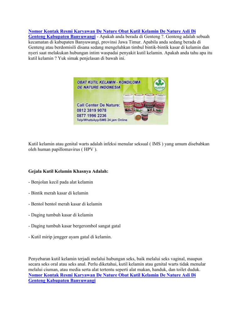 Nomor Kontak Resmi Karyawan De Nature Obat Kutil Kelamin De Nature Asli Di Genteng Kabupaten Banyuwangi - Apakah anda berada di Genteng ?. Genteng adalah sebuah kecamatan di kabupaten Banyuwangi, provinsi Jawa Timur. Apabila anda sedang berada di Genteng atau berdomisili disana sedang mengeluhkan timbul bintik-bintik kasar di kelamin dan nyeri saat melakukan hubungan intim waspadai penyakit kutil kelamin. Apakah anda tahu apa itu kutil kelamin ? Yuk simak penjelasan di bawah ini. Kutil kelamin atau genital warts adalah infeksi menular seksual ( IMS ) yang umum disebabkan oleh human papillomavirus ( HPV ). Gejala Kutil Kelamin Khasnya Adalah: - Benjolan kecil pada alat kelamin - Bintik merah kasar di kelamin - Bentol bentol merah kasar di kelamin - Daging tumbuh kasar di kelamin - Daging tumbuh kasar bergerombol sangat gatal - Kutil mirip jengger ayam gatal di kelamin. Penyebaran kutil kelamin terjadi melalui hubungan seks, baik melalui seks vaginal, maupun secara seks oral atau seks anal. Perlu diketahui, kutil kelamin atau genital warts tidak menular melalui ciuman, atau media serta alat tertentu seperti alat makan, handuk, dan toilet duduk. Nomor Kontak Resmi Karyawan De Nature Obat Kutil Kelamin De Nature Asli Di Genteng Kabupaten Banyuwangi Seperti Apa Penyakit Kutil Kelamin? Kutil kelamin sebagian besar berukuran sangat kecil, sehingga akan sulit terlihat. Biasanya penderita yang mengalami kondisi ini akan merasakan gatal - gatal di sekitar daerah genital. Kutil Kelamin dapat tumbuh satu persatu juga dapat tumbuh secara berdekatan atau berkelompok. Tanda-Tanda Kutil Kelamin Adalah: - Bengkak kecil di area kelamin. - Beberapa kutil menyerupai bentuk kembang kol. - Rasa gatal dan tidak nyaman di area kelamin. - Perdarahan saat hubungan intim. Beberapa faktor yang dapat meningkatkan risiko seseorang untuk terkena penyakit kutil kelamin adalah: - Melakukan seks tanpa kondom dengan gonta-ganti pasangan - Ada riwayat infeksi menular seksual sebelumnya - Berhubungan seks dengan pasangan yang tidak anda ketahui sejarah seksualnya - Aktif secara seksual sejak usia muda Kutil kelamin atau kondiloma akuminata ( daging tumbuh kasar atau jengger ayam ) umumnya akan menyerang siapa saja tanpa pandang bulu. Perempuan ataupun laki-laki bisa terkena penyakit kutil kelamin ini, meski pada umumnya wanita biasanya lebih rentan terkena penyakit kutil kelamin ini. Bisa dilihat di chanel youtube kami : Review Lengkap Aturan Pemakaian Obat Kutil Kelamin De Nature Yang Benar Informasi selengkapnya Obat Kutil Kelamin De Nature ,silahkan hubungi kami di nomor kontak De Nature: 0812-3819-9078 atau 0877-1996-2236. Informasi untuk kenyamanan anda, bahwa Produk dari perusahaan kami ini sudah memiliki: - Bersertifikat ISO 9001:2015 - Ijin Resmi Perusahaan dari Kementerian Kesehatan - Ijin BPOM, yang artinya sudah lulus Uji Stabilitas Produk - Sertifikat Halal MUI, sehingga kehalalannya bisa dipertanggung jawabkan - Apoteker Yang berpengalaman - Sudah melewati Proses Sortir Bahan Baku, Guna Menjaga Mutu Produk - Proses Produksi Sesuai Alur CPOTB (Cara Pembuatan Obat Tradisional Yang Baik Dan Benar) Pengiriman Herbal De Nature hanya 1 pintu yaitu dari Kantor Pusat De Nature (Majenang Cilacap Jawa Tengah). Kebijakan ini diambil untuk menjaga keaslian produk.
