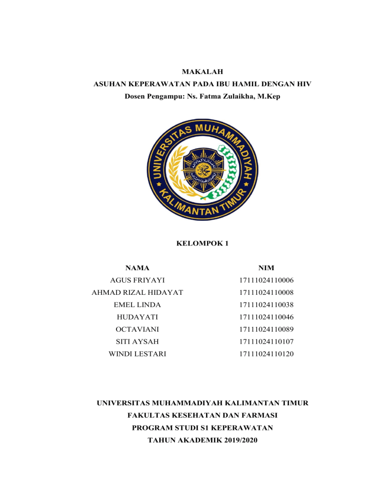 MAKALAH ASUHAN KEPERAWATAN PADA IBU HAMIL DENGAN HIV Dosen Pengampu: Ns. Fatma Zulaikha, M.Kep KELOMPOK 1 NAMA NIM AGUS FRIYAYI 17111024110006 AHMAD RIZAL HIDAYAT 17111024110008 EMEL LINDA 17111024110038 HUDAYATI 17111024110046 OCTAVIANI 17111024110089 SITI AYSAH 17111024110107 WINDI LESTARI 17111024110120 UNIVERSITAS MUHAMMADIYAH KALIMANTAN TIMUR FAKULTAS KESEHATAN DAN FARMASI PROGRAM STUDI S1 KEPERAWATAN TAHUN AKADEMIK 2019/2020 KATA PENGANTAR Asslamualaikum warahmatullahi wabarakatuh Alhamdulillahirabbilalamin banyak nikmat yang Allah berikan tetapi sedikit sekali yang kita ingat. Segala puji hanya layak untuk Allah atas segala berkat, rahmat, taufik, serta hidayah-Nya yang tiada terkira besarnya, sehingga kami dapat menyeselaikan Makalah Asuhan Keperawatan pada Ibu Hamil dengan HIV. Dalam penyusunannya, kami mengucapkan terimakasih kepada Ibu Ns. Fatma Zulaikha, M.Kep, selaku Dosen Keperawatan HIV/AIDS yang telah memberikan dukungan, dan kepercayaan kepada kami sehingga kami dapat menyelesaikan proposal ini. Kami menyadari bahwa proposal ini sangat jauh dari kesempurnaan. Oleh karena itu, dengan segala kerendahan hati, kami sangat menerima kritik dan saran agar penyusunan makalah selanjutnya menjadi lebih baik lagi. Untuk itu kami mengucapkan banyak terima kasih dan semoga makalah berkaitan dengan Asuhan Keperawatan pada Ibu Hamil dengan HIV ini bermanfaat. Wasalamualaikum warahmatullahi wabaraatuh Samarinda, Oktober 2019 Penyusun DAFTAR ISI KATA PENGANTAR ........................................................................................ i DAFTAR ISI ..................................................................................................... ii BAB I PENDAHULUAN ................................................................................. 1 A. Latar Belakang ....................................................................................... 1 B. Rumusan Masalah .................................................................................. 2 C. Tujuan .................................................................................................... 2 BAB II PEMBAHASAN .................................................................................. 3 A. Pengertian ............................................................................................... 3 B. Etiologi ................................................................................................... 4 C. Patofisiologi ........................................................................................... 5 D. Manifestasi Klinis .................................................................................. 7 E. Komplikasi ............................................................................................. 9 F. Pemeriksaan Penunjang ......................................................................... 9 G. Penatalaksanaan ................................................................................... 11 H. Cara penularan ..................................................................................... 16 I. Pencegahan ........................................................................................... 17 J. Pengkajian Keperawatan ...................................................................... 17 K. Intervensi Keperawatan ........................................................................ 20 BAB III PENUTUP ........................................................................................ 24 A. Kesimpulan .......................................................................................... 24 B. Saran ..................................................................................................... 25 DAFTAR PUSTAKA ..................................................................................... 26 BAB I PENDAHULUAN A. Latar Belakang Penyakit HIV/AIDS merupakan suatu penyakit yang terus berkembang dan menjadi masalah global yang melanda dunia. Menurut data WHO (World Health Organization) tahun 2012, penemuan kasus HIV (Human Immunodeficiency Virus) di dunia pada tahun 2012 mencapai 2,3 juta kasus, dimana sebanyak 1,6 juta penderita meninggal karena AIDS (Acquired Immunodeficiency Syndrome) dan 210.000 penderita berusia di bawah 15 tahun (WHO, 2012) Berdasarkan data Ditjen P2PL (Pengendalian Penyakit dan Penyehatan Lingkungan), statistik kasus HIV/AIDS yang dilaporkan dari tahun 2011-2012 mengalami peningkatan, yaitu pada tahun 2011 kasus baru HIV sebesar 21.031 kasus, kemudian meningkat menjadi 21.511 kasus pada tahun 2012. Begitu juga dengan AIDS dari tahun 2011 sebanyak 37.201 kasus, meningkat menjadi 42.887 kasus pada tahun 2012. Proporsi faktor risiko penderita HIV/AIDS melalui hubungan heteroseksual merupakan cara penularan dengan persentase tertinggi sebesar 77,75%, diikuti oleh penasun atau injecting drug user (IDU) sebesar 9,16% dan dari ibu ke anak sebesar 3,76% (Kemenkes RI, 2012) Salah satu upaya untuk menekan laju penyebaran HIV/AIDS yaitu dengan memberikan pendidikan kesehatan HIV/AIDS sejak dini pada remaja, karena di Indonesia kasus HIV banyak menjangkiti pada usia produktif yaitu usia 20-49 tahun dan dapat diperkirakan remaja usia 15-24 tahun virus HIV sudah berada di dalam tubuhnya, hal ini dimungkinkan karena kurangnya informasi terkait HIV/AIDS pada remaja. B. Rumusan Masalah 1. Apa pengertian dari HIV/AID? 2. Apa saja etiologi dari HIV/AIDS? 3. Bagaimana patofisiologi dari HIV/AIDS? 4. Apa saja manifestasi klinis dari HIV/AIDS? 5. Bagaimana cara penularan dari HIV/AIDS? 6. Bagaimana pencegahan dari HIV/AIDS? 7. Apa saja pengkajian keperawatan HIV/AIDS? 8. Bagaimana intervensi keperawatan HIV/AIDS? C. Tujuan 1. Untuk mengetahui pengertian dari HIV/AID 2. Untuk mengetahui apa saja etiologi dari HIV/AIDS 3. Untuk mengetahui bagaimana patofisiologi dari HIV/AIDS 4. Untuk mengetahui apa saja manifestasi klinis dari HIV/AIDS 5. Untuk mengetahui bagaimana cara penularan dari HIV/AIDS 6. Untuk mengetahui bagai