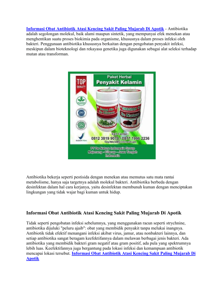 Informasi Obat Antibiotik Atasi Kencing Sakit Paling Mujarab Di Apotik - Antibiotika adalah segolongan molekul, baik alami maupun sintetik, yang mempunyai efek menekan atau menghentikan suatu proses biokimia pada organisme, khususnya dalam proses infeksi oleh bakteri. Penggunaan antibiotika khususnya berkaitan dengan pengobatan penyakit infeksi, meskipun dalam bioteknologi dan rekayasa genetika juga digunakan sebagai alat seleksi terhadap mutan atau transforman. Antibiotika bekerja seperti pestisida dengan menekan atau memutus satu mata rantai metabolisme, hanya saja targetnya adalah molekul bakteri. Antibiotika berbeda dengan desinfektan dalam hal cara kerjanya, yaitu desinfektan membunuh kuman dengan menciptakan lingkungan yang tidak wajar bagi kuman untuk hidup. Informasi Obat Antibiotik Atasi Kencing Sakit Paling Mujarab Di Apotik Tidak seperti pengobatan infeksi sebelumnya, yang menggunakan racun seperti strychnine, antibiotika dijuluki "peluru ajaib": obat yang membidik penyakit tanpa melukai inangnya. Antibiotik tidak efektif menangani infeksi akibat virus, jamur, atau nonbakteri lainnya, dan setiap antibiotika sangat beragam keefektifannya dalam melawan berbagai jenis bakteri. Ada antibiotika yang membidik bakteri gram negatif atau gram positif, ada pula yang spektrumnya lebih luas. Keefektifannya juga bergantung pada lokasi infeksi dan kemampuan antibiotik mencapai lokasi tersebut. Informasi Obat Antibiotik Atasi Kencing Sakit Paling Mujarab Di Apotik Antibiotika oral (diberikan lewat mulut) mudah digunakan dan antibiotika intravena (melalui infus) digunakan untuk kasus yang lebih serius. Antibiotika kadang kala dapat digunakan setempat, seperti tetes mata dan salep. (https://id.wikipedia.org/wiki/Antibiotika) Pada kesempatan ini kami akan menjelaskan penyakit dan solusinya khususnya mengenai penyakit kelamin Kencing Nanah atau yang dikenal juga dengan Gonore/ Go. Cara mengobati kencing nanah secara alami yaitu dengan Obat Kencing Nanah yang terbuat dari Herbal merupakan alternatif yang bisa dilakukan. Tanaman atau tumbuhan tertentu yang sudah diteliti kandungan dan khasiatnya adalah cara alami yang relatif aman untuk mengobati kencing nanah dibandingkan dengan obat kimia. Begitu banyak tanaman yang mempunyai khasiat untuk pengobatan, diantaranya sebagai obat kencing nanah herbal, obat sipilis alami, obat infeksi saluran kemih (ISK), dll. Akan tetapi untuk mengoptimalkannya harus dengan racikan dan dosis yang tepat. Maka dari itu lebih mudah menggunakan obat alami yang sudah dikemas secara higienis dan mudah untuk dikonsumsi. salah satunya yaitu menggunakan antibiotik alami atau obat herbal. Ijinkan kami memberikan informasi mengenai cara mengobati Kencing Keluar Cairan Putih secara alami dengan Obat Herbal Penyakit Kelamin De Nature. Paket Obat Herbal ini terdiri dari Gang Jie dan Gho Siah. Obat berbahan dasar herbal dan diracik secara modern sesuai aturan BPOM. Atau dengan kata lain Obat alami ini sudah terdaftar resmi di BPOM. Informasi lebih lengkap mengenai kami Paket Obat Herbal Kencing Nanah, Paket Obat Herbal ISK, Paket Obat Herbal Sipilis Raja Singa, atau Obat Herbal lainnya, anda dapat hubungi kami di nomor 081-238-199-078 atau WA: 087-719-962-236. Bisa dilihat di chanel youtube kami : Apakah Obat Sipilis Gang Jie Gho Siah tersedia di Apotik Umum