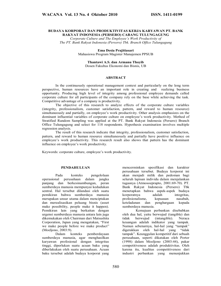 WACANA Vol. 13 No. 4 Oktober 2010 ISSN. 1411-0199 BUDAYA KORPORAT DAN PRODUKTIVITAS KERJA KARYAWAN PT. BANK RAKYAT INDONESIA (PERSERO) CABANG TULUNGAGUNG Corporate Culture and The Employee’s Work Productivity of The PT. Bank Rakyat Indonesia (Persero) Tbk. Branch Office Tulungagung Ema Desia Prajitiasari Mahasiswa Program Magister Manajemen PPSUB Thantawi A.S. dan Armanu Thoyib Dosen Fakultas Ekonomi dan Bisnis, UB ABSTRACT In the continuously operational management context and particularly on the long term perspective, human resources have an important role in creating and realizing business opportunity. Producing high level of integrity among professional employee demands called corporate culture for all participants of the company rely on the base while achieving the task. Competitive advantage of a company is productivity. The objective of this research to analyze effects of the corporate culture variables (integrity, professionalism, customer satisfaction, pattern, and reward to human resource) simultaneously and partially, on employee’s work productivity. Other analysis emphasizes on the dominant influential variables of corporate culture on employee’s work productivity. Method of Stratified Random Sampling was applied at the PT. Bank Rakyat Indonesia (Persero) Branch Office Tulungagung and select for 118 respondents. Hypothesis examination involves multiple regression analysis. The result of this research indicate that integrity, professionalism, customer satisfaction, pattern, and reward to human resource simultaneously and partially have positive influence on employee’s work productivity. This research result also shows that pattern has the dominant influence on employee’s work productivity. Keywords: corporate culture, employee’s work productivity. mencerminkan spesifikasi dan karakter perusahaan tersebut. Budaya korporat ini akan menjadi milik dan pedoman bagi seluruh lapisan individu dalam menjalankan tugasnya (Atmosoeprapto, 2001:69-70). PT. Bank Rakyat Indonesia (Persero) Tbk menetapkan bahwa aspek-aspek budaya korporatnya adalah integritas, profesionalisme, kepuasan nasabah, keteladanan dan penghargaan kepada sumberdaya manusia. Kemajuan perbankan disebabkan oleh dua hal, yaitu berwujud (tangible) dan tidak berwujud (intangible). Neraca keuangan adalah indikator yang tampak. Namun sebenarnya, hal-hal yang “tampak” digerakkan oleh hal-hal yang “tidak tampak”. Keunggulan kompetitif dari sebuah perusahaan, seperti dikatakan oleh Porter (1998) dalam Moeljono (2003:44), pakar competitiveness adalah produktivitas. Oleh karena itu, kualitas competitiveness dari industri perbankan yang menunjukkan PENDAHULUAN Pada konteks pengelolaan operasional perusahaan dalam jangka panjang dan berkesinambungan, peran sumberdaya manusia mempunyai kedudukan sentral. Hal tersebut dilandasi oleh suatu pemikiran bahwa sumberdaya manusia merupakan unsur utama dalam menciptakan dan merealisasikan peluang bisnis (asset make possibility, people make it happen). Pemikiran lain yang berkaitan dengan urgensi sumberdaya manusia antara lain juga dikemukakan oleh Chairman dari Matsushita Corporation, Japan yang mengatakan, “First we make people before we make product” (Moeljono, 2003:9). Dalam konteks pemberdayaan sumberdaya manusia, agar menghasilkan karyawan profesional dengan integritas tinggi, diperlukan suatu acuan baku yang diberlakukan oleh suatu perusahaan. Acuan baku tersebut adalah budaya korporat yang 580 WACANA Vol. 13 No. 4 Oktober 2010 keunggulan kompetitifnya adalah produktivitas. Berdasarkan latar belakang tersebut, maka dapat dirumuskan masalah sebagai berikut: (1) Apakah ada pengaruh budaya korporat yang terdiri dari variabel integritas, profesionalisme, kepuasan nasabah, keteladanan, dan penghargaan kepada sumberdaya manusia, secara simultan terhadap produktivitas kerja karyawan? (2) Apakah ada pengaruh budaya korporat yang terdiri dari variabel integritas, profesionalisme, kepuasan nasabah, keteladanan, dan penghargaan kepada sumberdaya manusia, secara parsial terhadap produktivitas kerja karyawan? (3) Di antara variabel integritas, profesionalisme, kepuasan nasabah, keteladanan, dan penghargaan kepada sumberdaya manusia, manakah yang berpengaruh dominan terhadap produktivitas kerja karyawan? Sejalan dengan masalah yang telah dirumuskan, maka tujuan yang hendak dicapai dalam penelitian ini adalah: (1) Untuk menganalisis pengaruh budaya korporat yang terdiri dari variabel integritas, profesionalisme, kepuasan nasabah, keteladanan, dan penghargaan kepada sumberdaya manusia secara simultan terhadap produktivitas kerja karyawan pada PT. Bank Rakyat Indonesia (Persero) Tbk Cabang Tulungagung. (2) Untuk menganalisis pengaruh budaya korporat yang terdiri dari variabel integritas, profesionalisme, kepuasan nasabah, keteladanan, dan penghargaan kepada sumberdaya manusia secara parsial terhadap produktivitas kerja karyawan pada PT. Bank Rakyat Indonesia (Persero) Tbk Cabang Tulungagung. (3) Untuk menganalisis variabel-variabel dari budaya korporat yang berpengaruh dominan terhadap produktivitas kerja karyawan. ISSN. 1411-0199 3. manusia secara parsial terhadap variabel produktivitas kerja. Diduga variabel keteladanan memberi pengaruh yang dominan terhadap produktivitas kerja. METODE PENELITIAN Penelitian ini adalah penelitian penjelasan yang menjelaskan hubungan sebab akibat antara variabel independent budaya korporat (integritas, profesionalisme, kepuasan nasabah, keteladanan, dan penghargaan kepada sumberdaya manusia) dan variabel dependent produktivitas kerja karyawan. Penelitian dilakukan pada PT. Bank Rakyat Indonesia (Persero) Tbk Cabang Tulungagung, populasinya adalah semua karyawan sebanyak 167 orang. Dari rumus Slovin (Umar, 2000:108): n = N dengan presisi 5% 1 Ne 2 dan jumlah populasi sebanyak 167 orang, maka jumlah sampel dalam penelitian ini adalah 118 karyawan. Pengambilan sampel dengan cara bertingkat atau berjenjang (metode Stratified Random Sampling) yaitu ka
